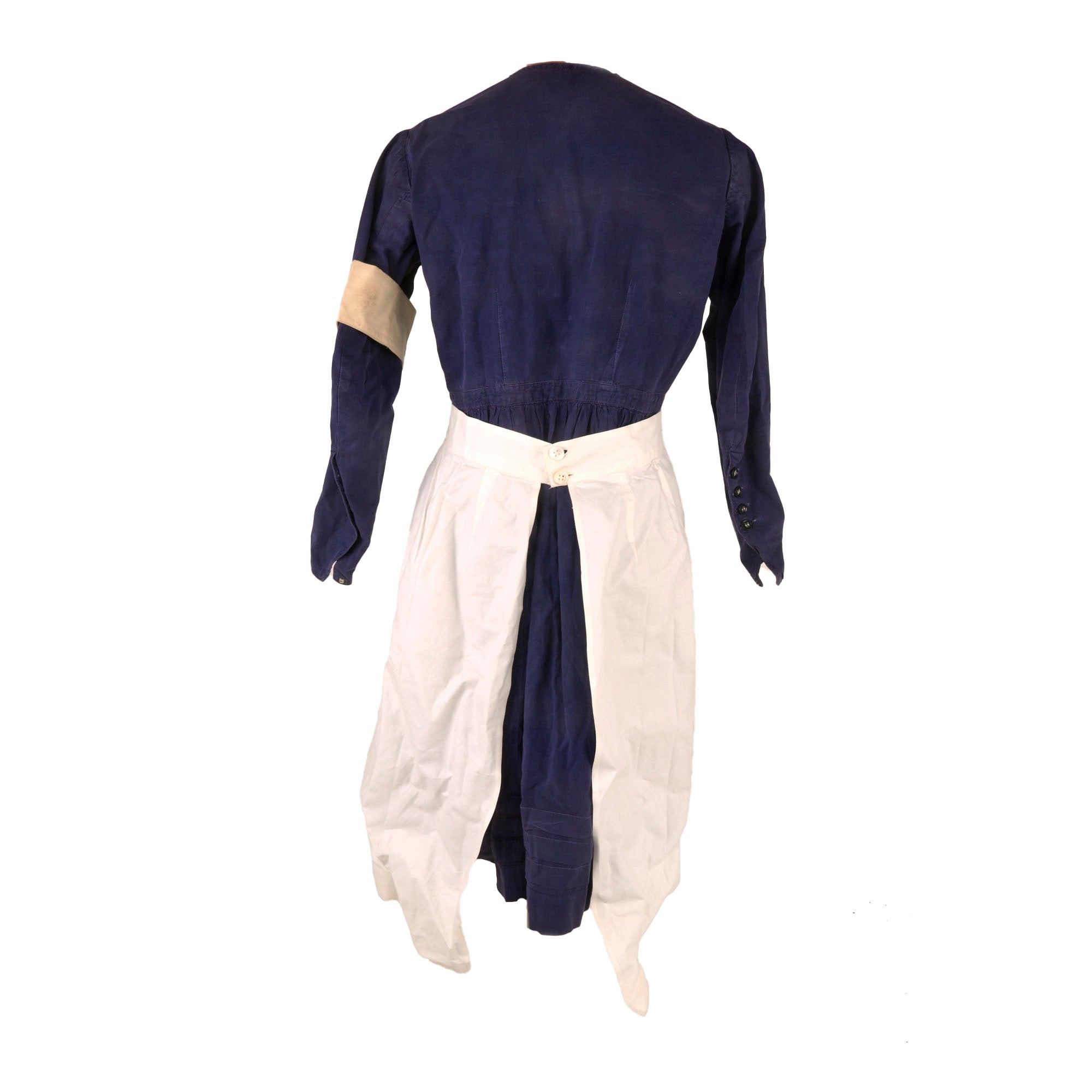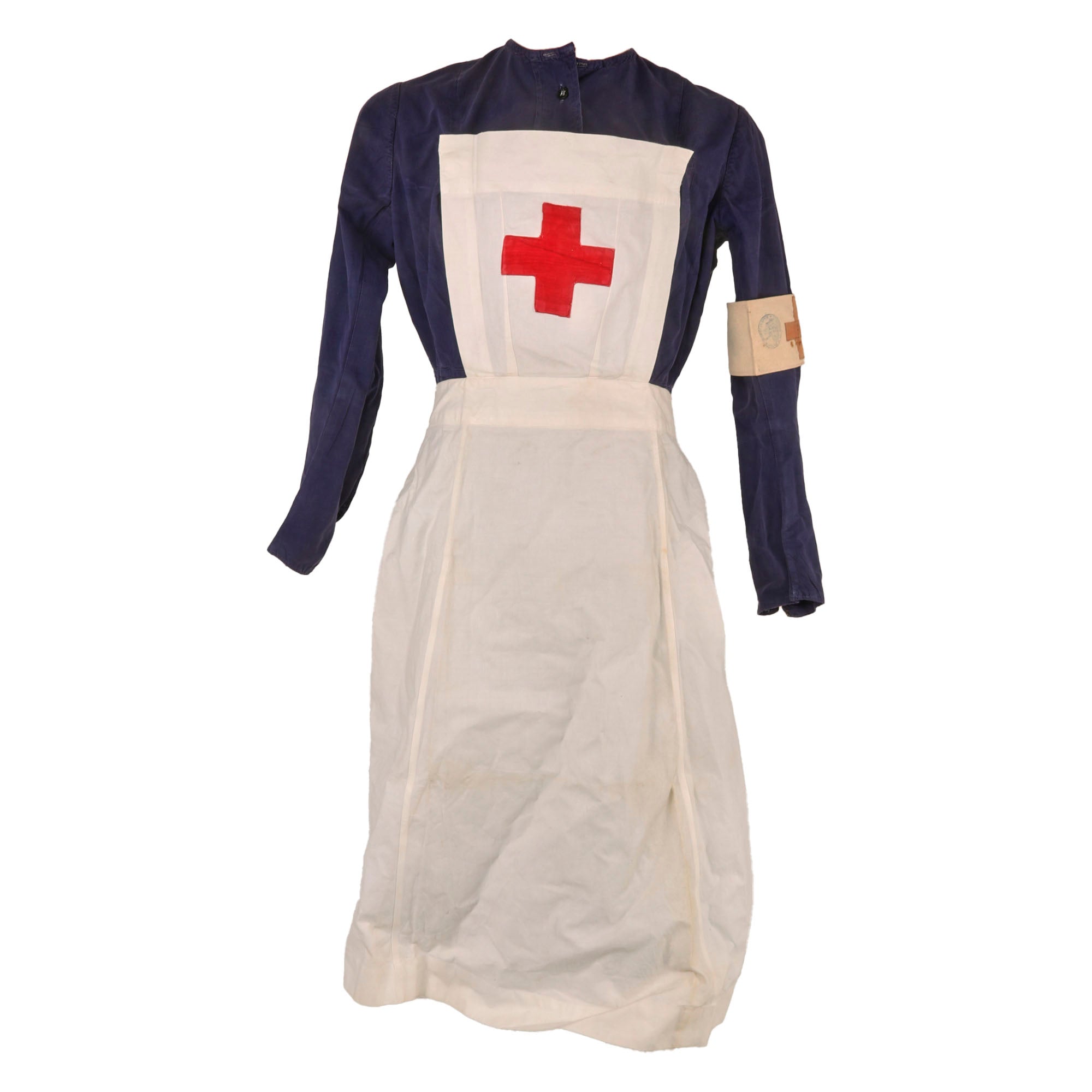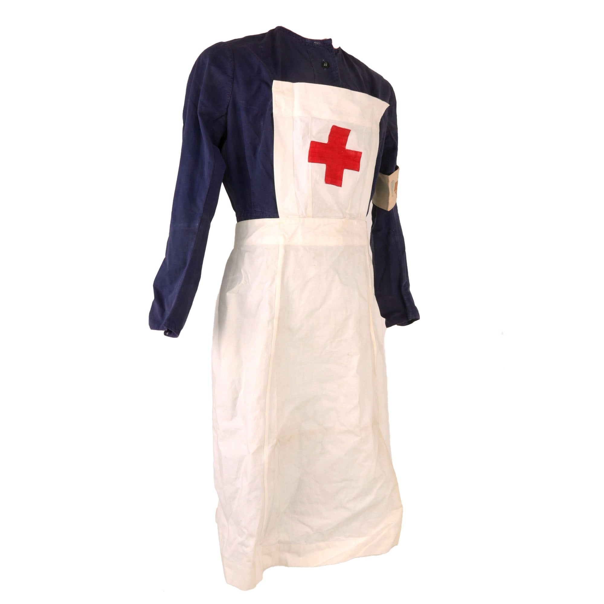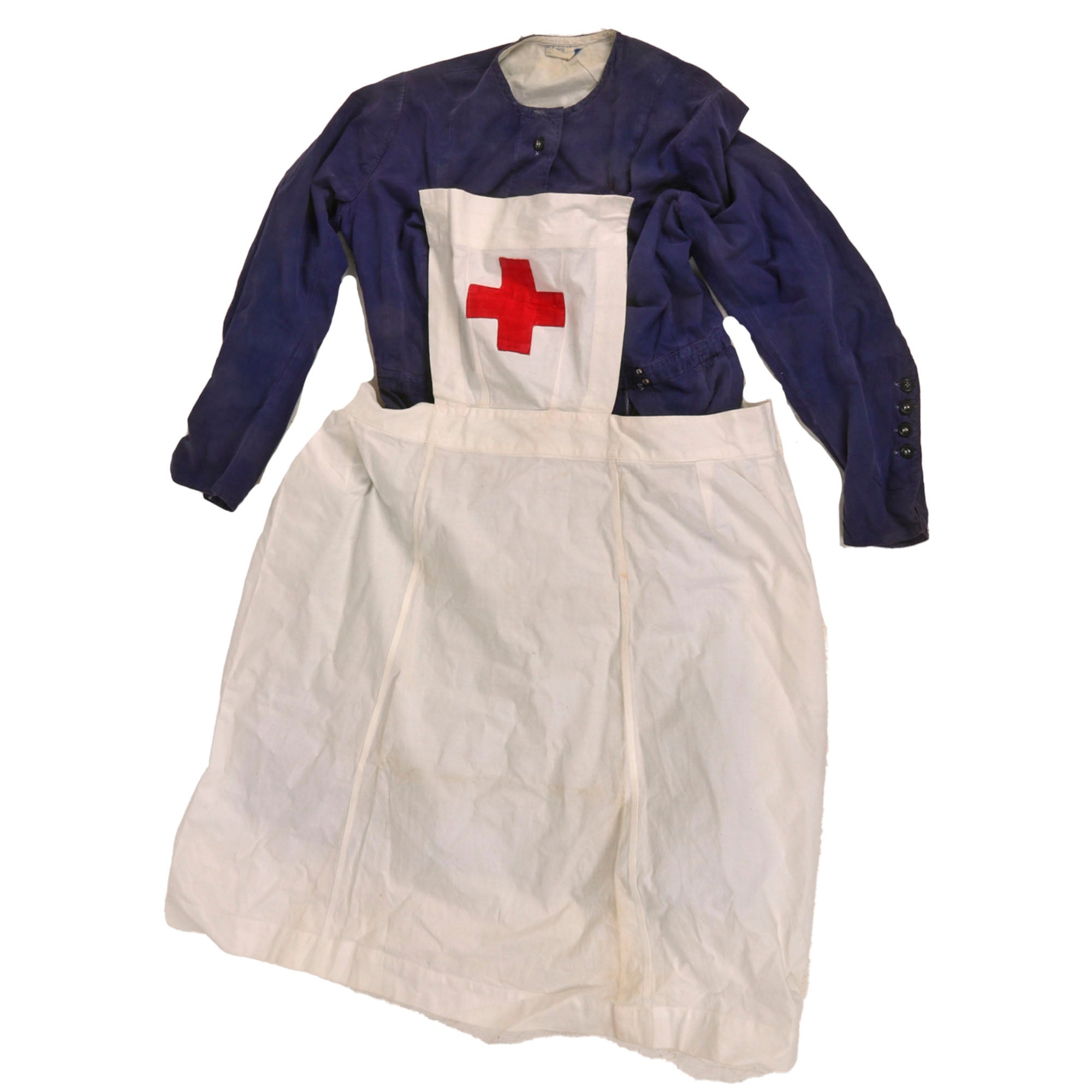 - Parker’s 1916 nurse’s work uniform with a blue uniform and white apron attached with a big red cross on the front. This uniform is in exemplary condition, with little mothing, and no exterior issues that can be seen. This uniform is without a doubt museum quality. It has an orginal tag and is named to Lieutenant Nursing Sister Emily Abalinda Parker.