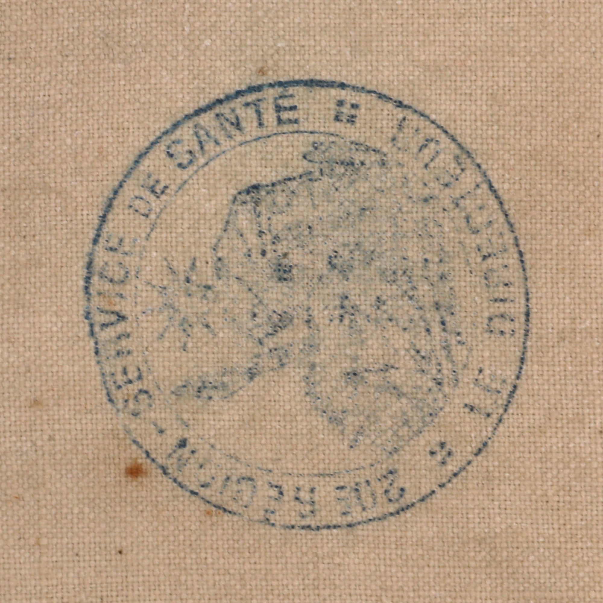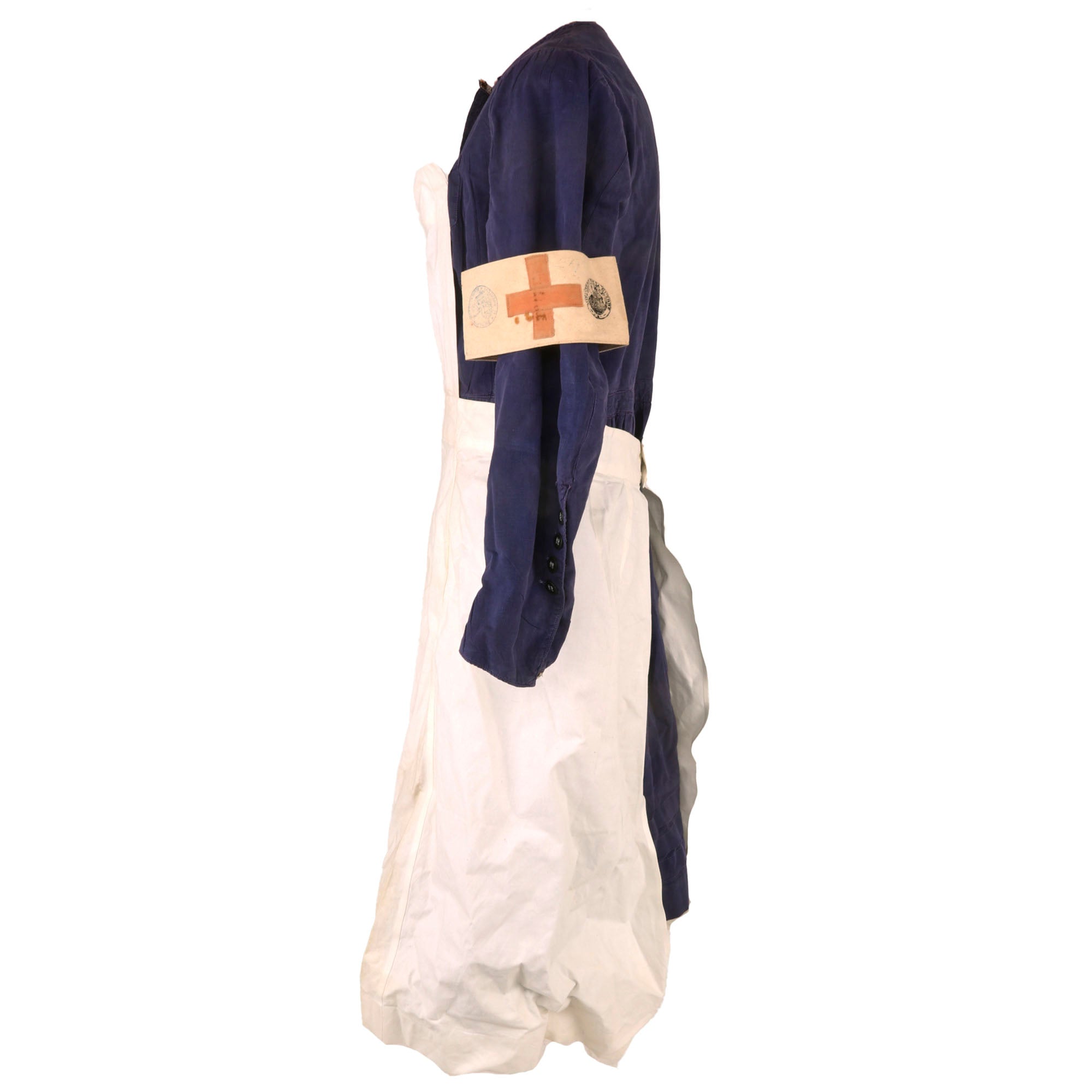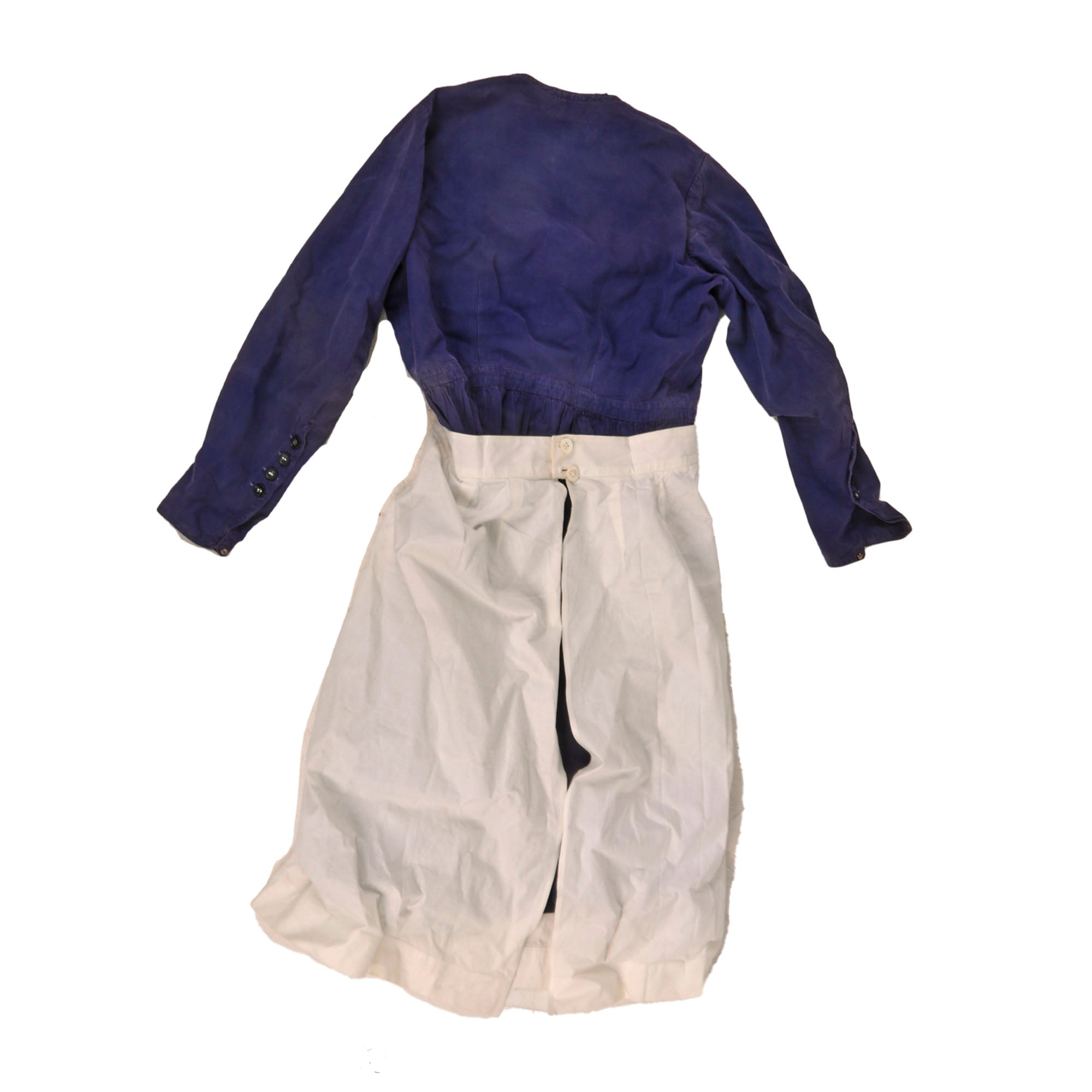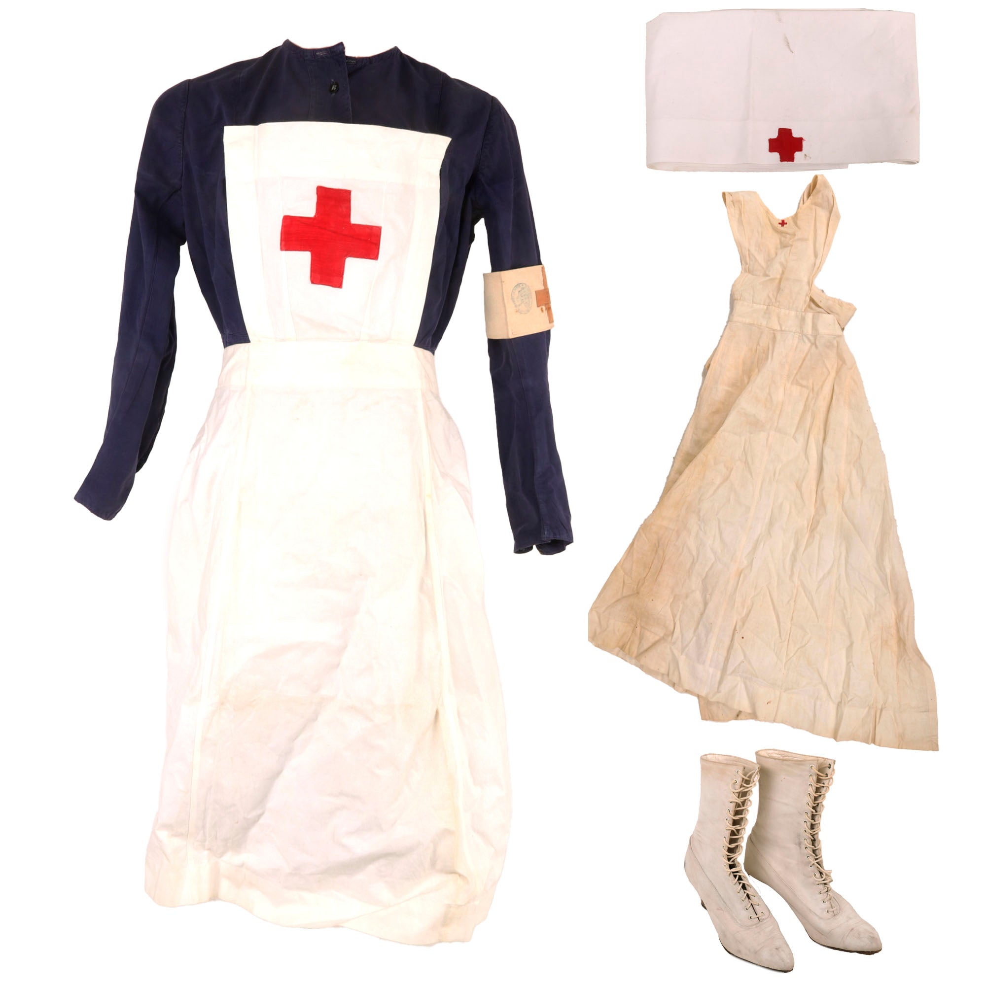 - Parker’s 1916 nurse’s work uniform with a blue uniform and white apron attached with a big red cross on the front. This uniform is in exemplary condition, with little mothing, and no exterior issues that can be seen. This uniform is without a doubt museum quality. It has an orginal tag and is named to Lieutenant Nursing Sister Emily Abalinda Parker.