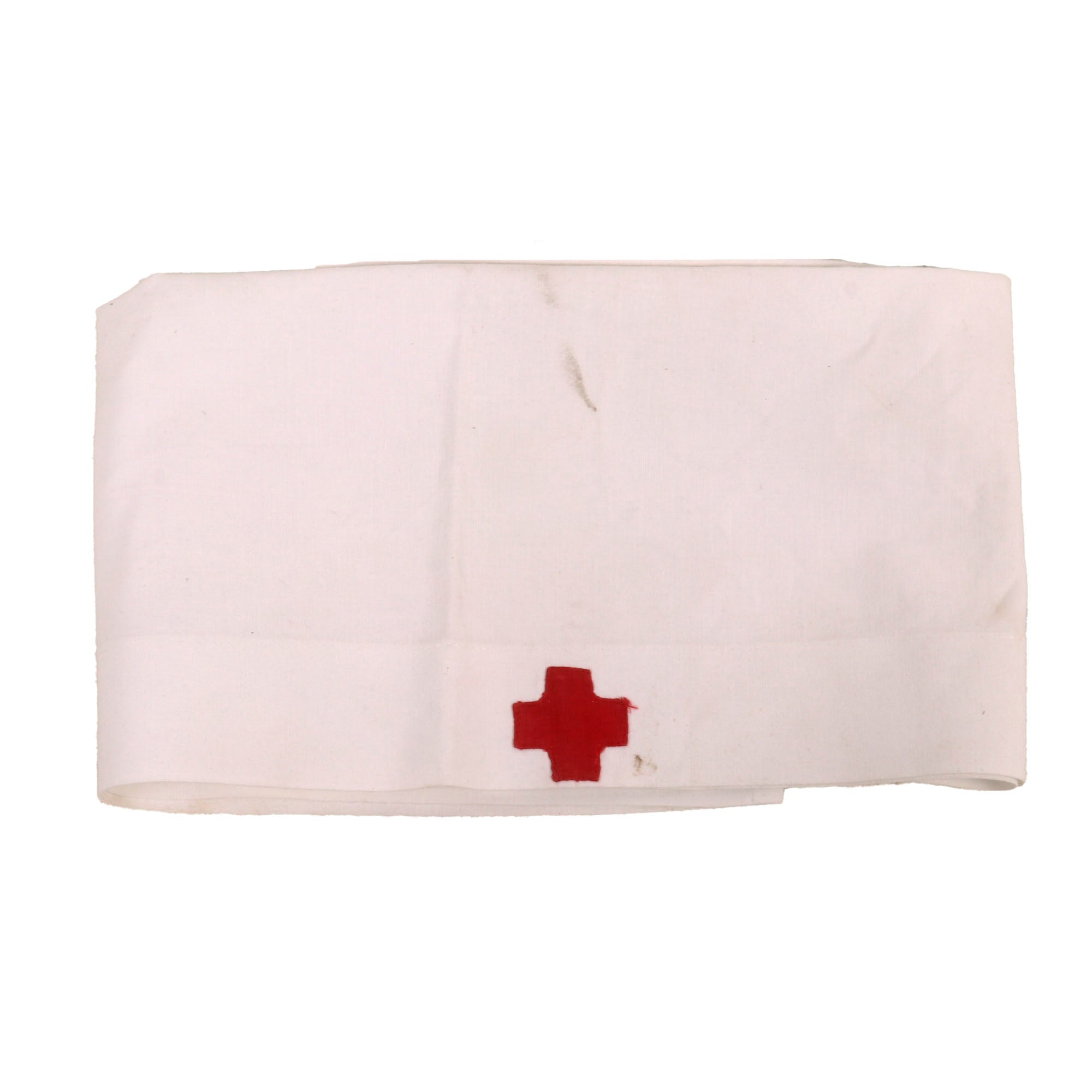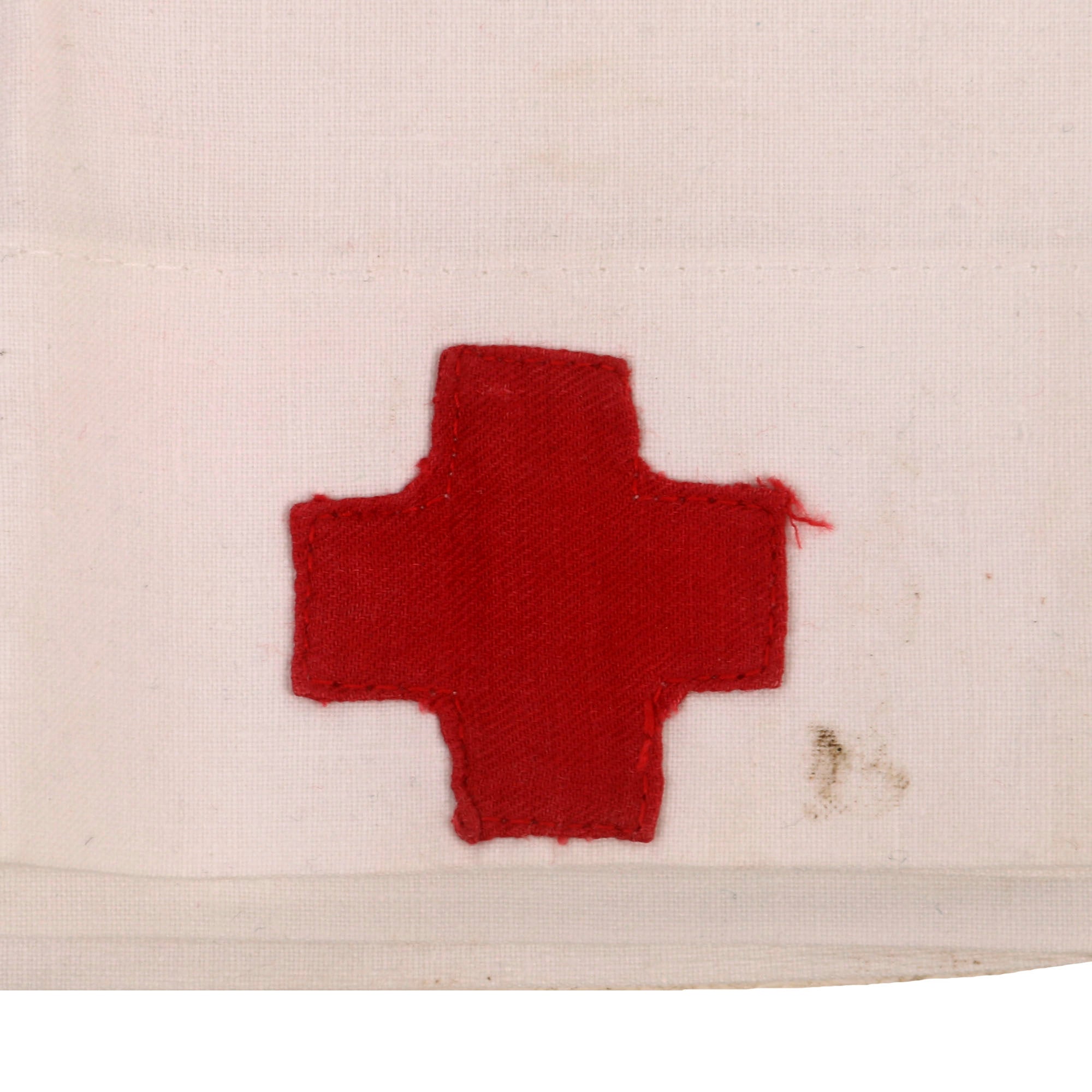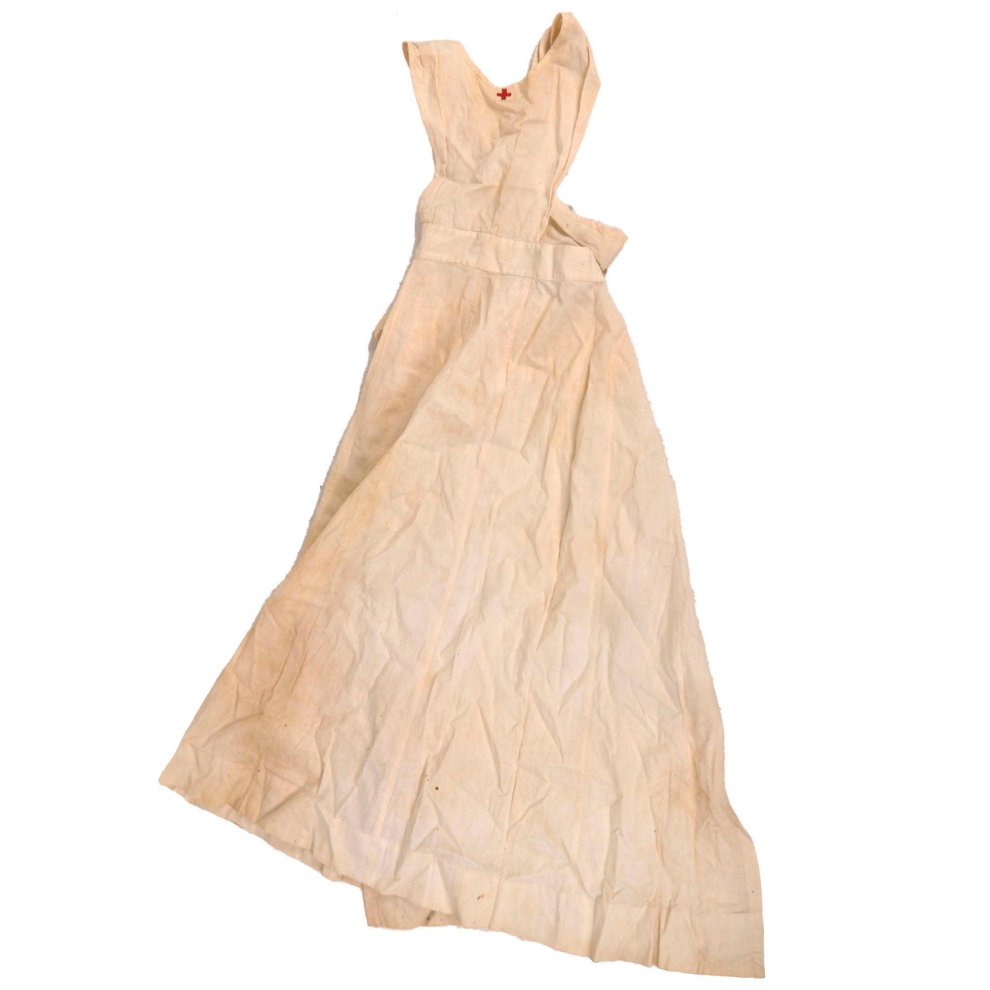 - One nurse’s surgical gown with a red cross on the front. In worn but fantastic condition for its age.