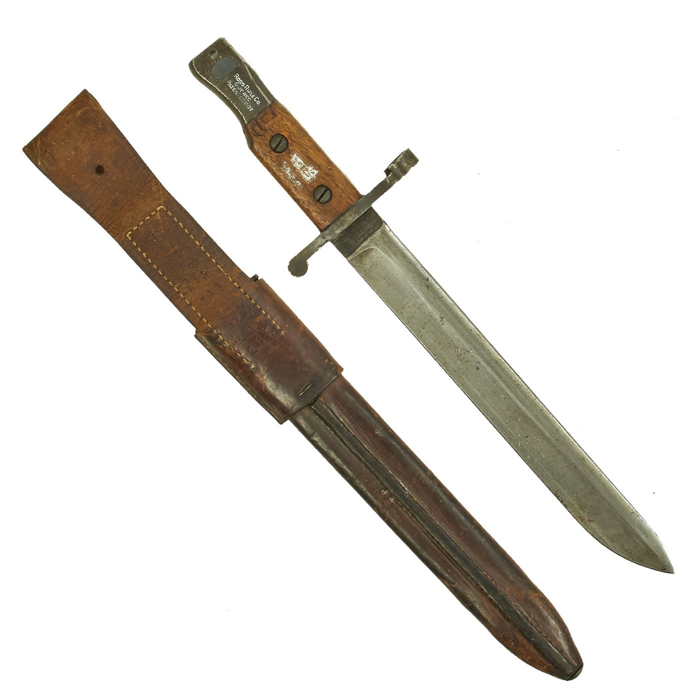 In 1917, the U.S. Government purchased 20,000 Ross rifles and bayonets from Canada. These were intended for use in troop training due to the shortage of rifles and bayonets during the First World War. They were marked with U.S. and the Ordnance Dept. "flaming bomb" acceptance mark. This bayonet and scabbard were both accepted into U.S. Army service, as indicated by the U.S. surcharges on the leather of the scabbard and wood of the grip.