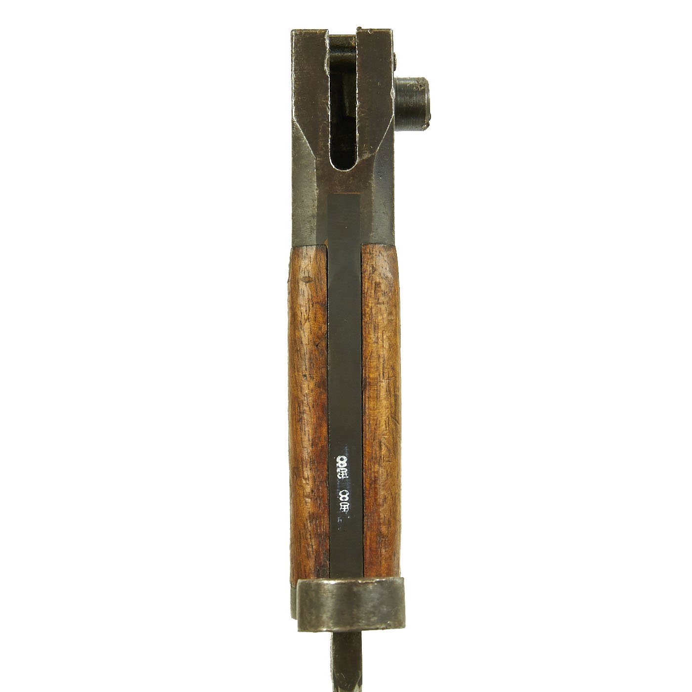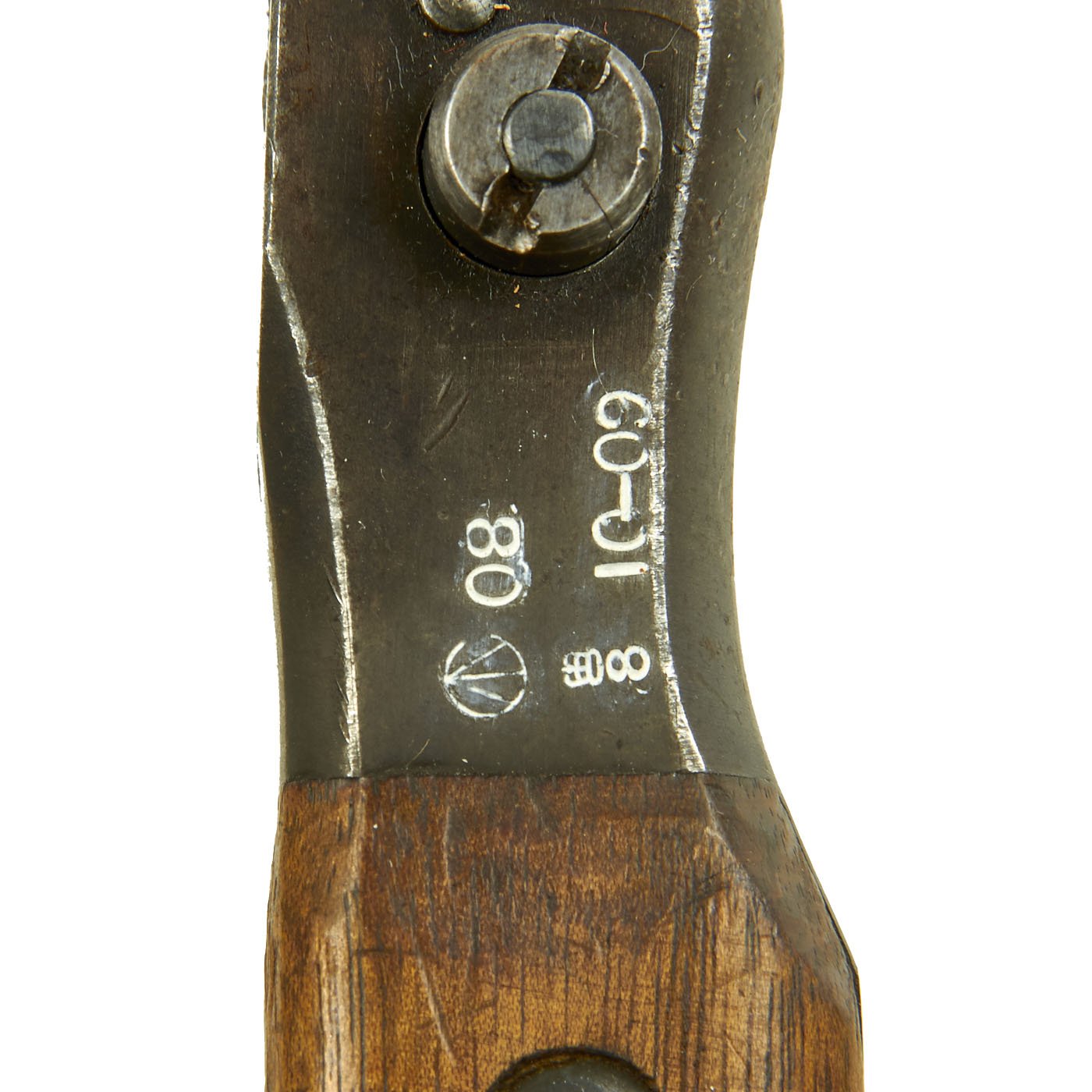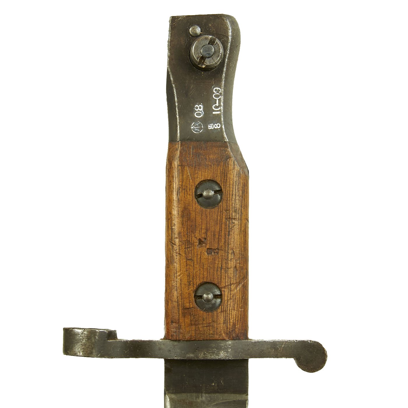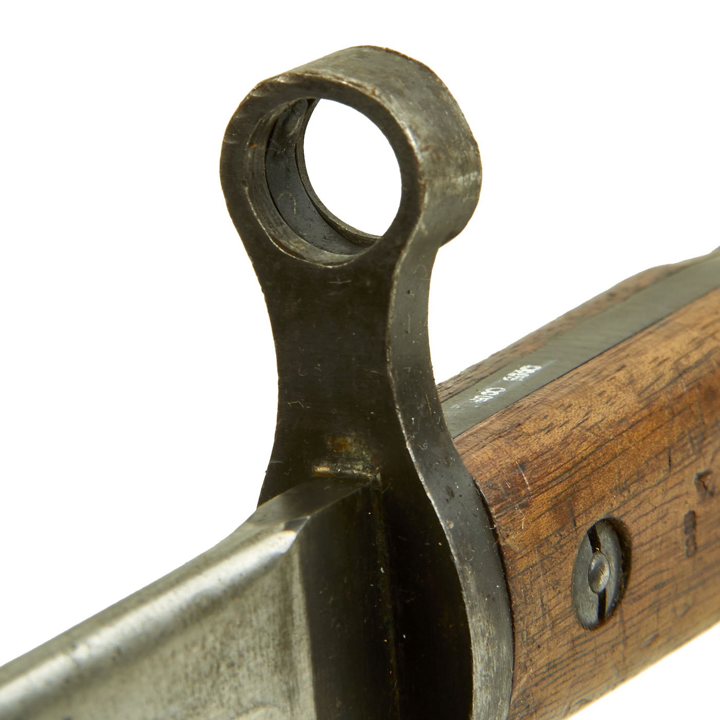 This is an early Mk. I example, with the extended muzzle ring and the pinned pommel, and is in very good condition. A flat spring was inserted inside the muzzle ring to remedy problems with the bayonet separating from the rifle. There are multiple dents / small cuts on the blade side of the guard, so this bayonet may have been used in rifle fencing practice. The bayonet itself is dated 10 - 09 for October of 1909, and has proof and acceptance marks stamped into the wood and steel of the handle. The other side of the handle is marked with the manufacturer information:
