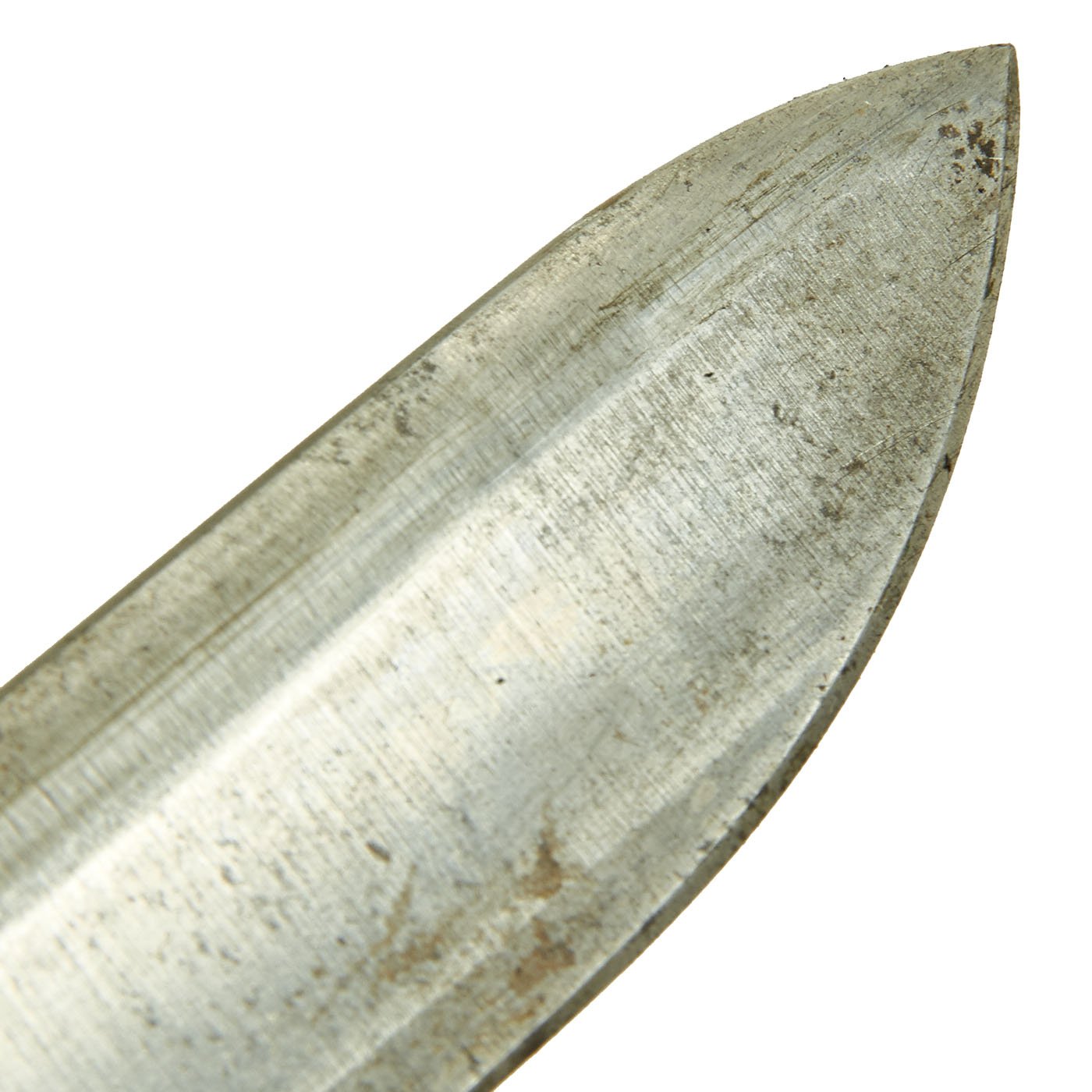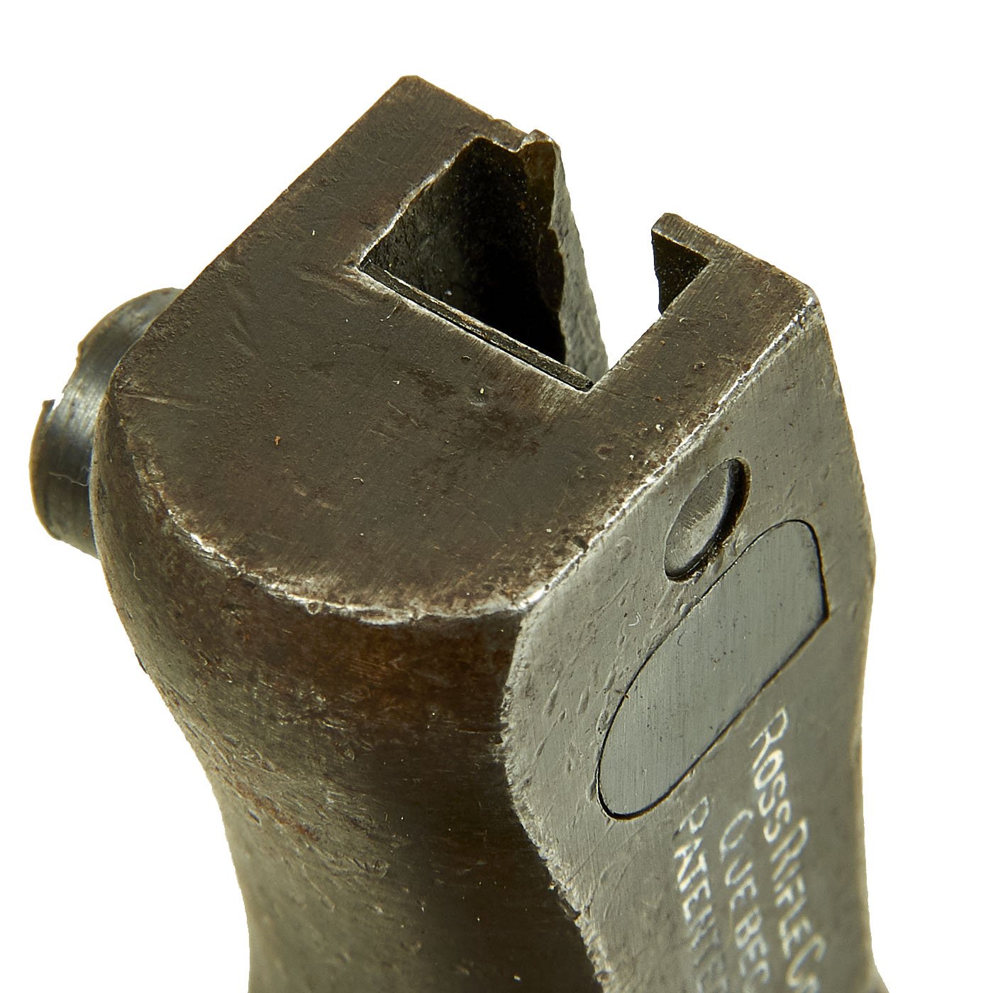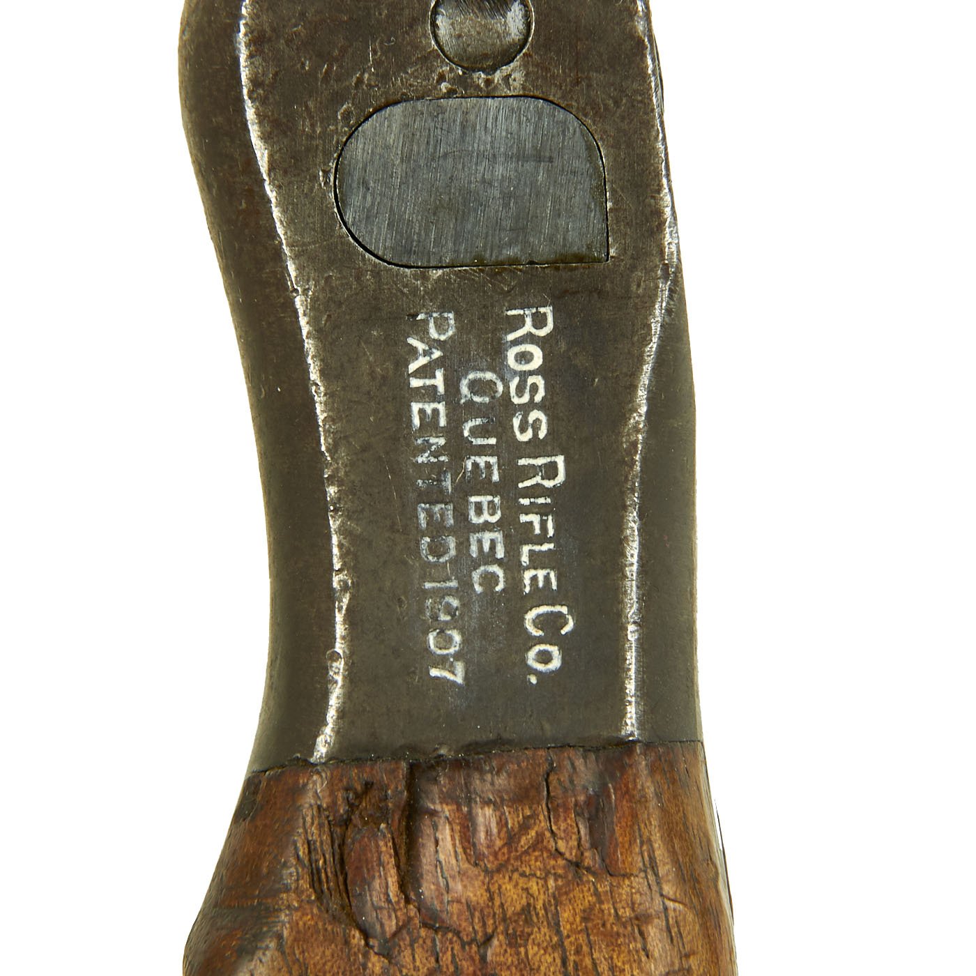 Many Ross bayonets had their blade profile drastically altered during WW I to provide a sharper point. However, this example is exactly as it left the Ross Rifle Co., Quebec, Canada factory in 1910, and is in very good shape. The original factory grind marks can be seen in areas of the hollow ground blade, though it has been sharpened a bit. IT also does have some staining and light peppering on the bright blade. The lock mechanism functions correctly, and the spring in the barrel ring is still present.