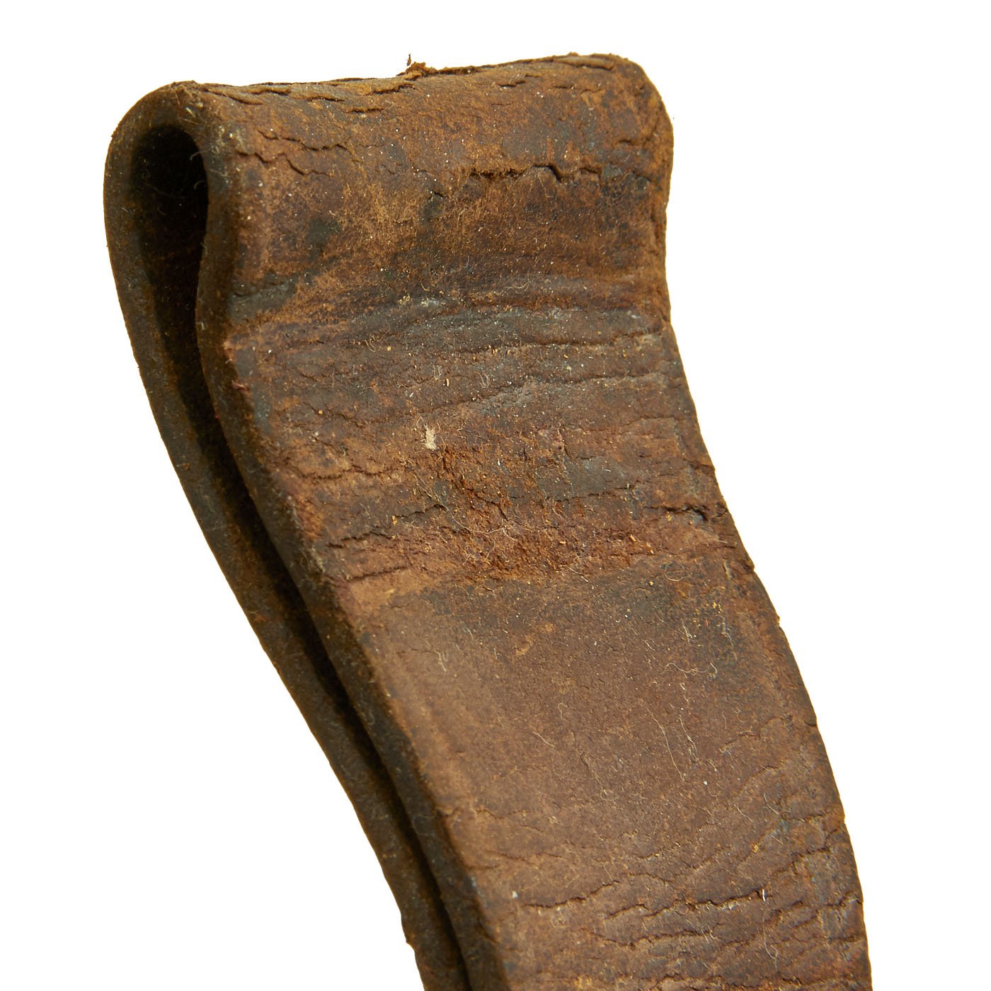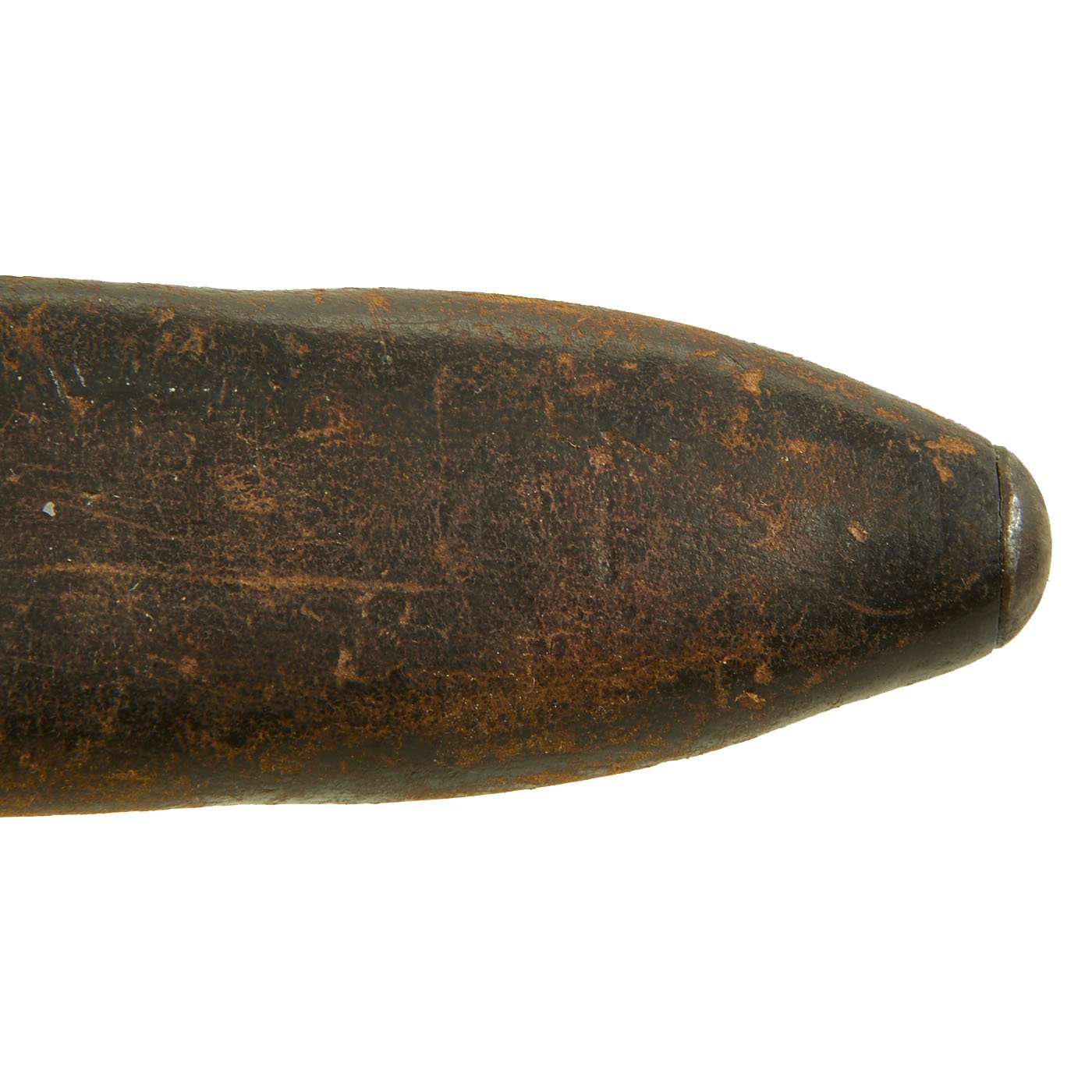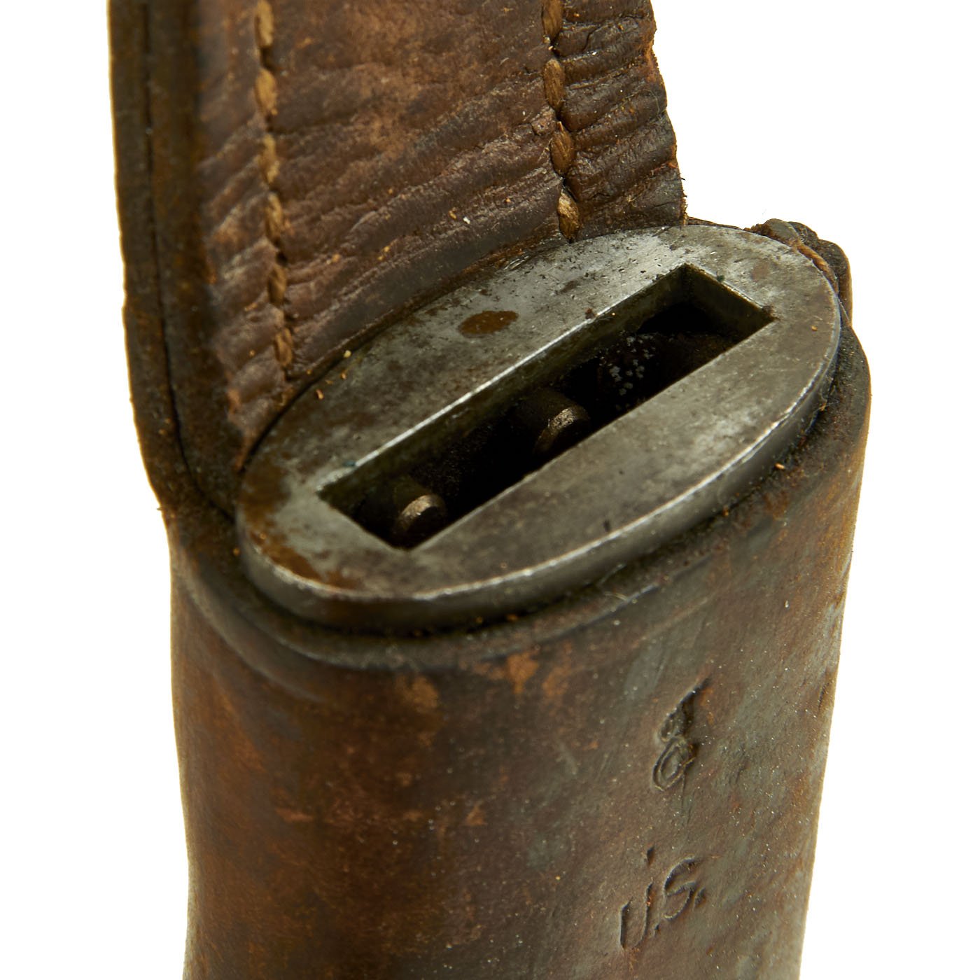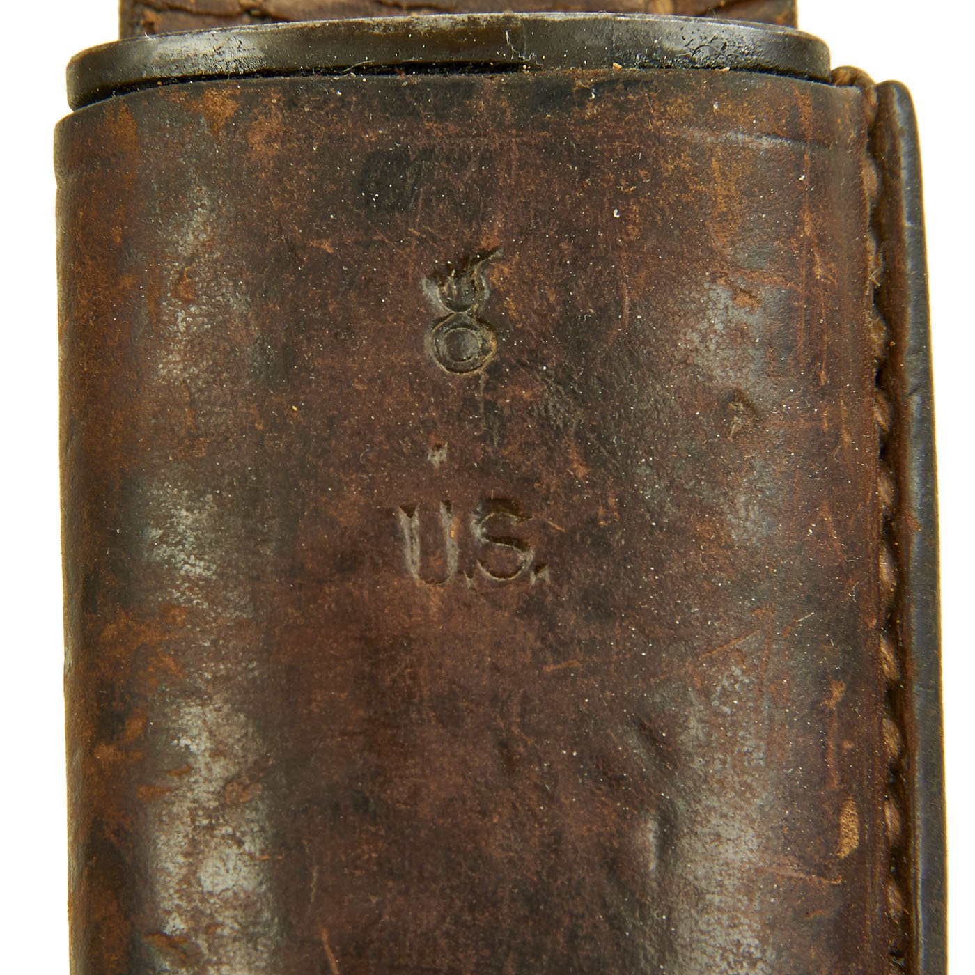 The scabbard for this bayonet is also in very good condition. The leather body is marked on the back with proof marks, as well as L.R.C. / 1 - 09, indicating production in January of 1909. The scabbard is complete with most stitching intact, and the expected wear to the leather from being over 100 years old. The scabbard body has shrunk a bit, so the drag end is a bit larger due to internal reinforcing. The back of the frog looks to have additional dates and unit markings, which are unfortunately only partially legible, but could be a great research opportunity.