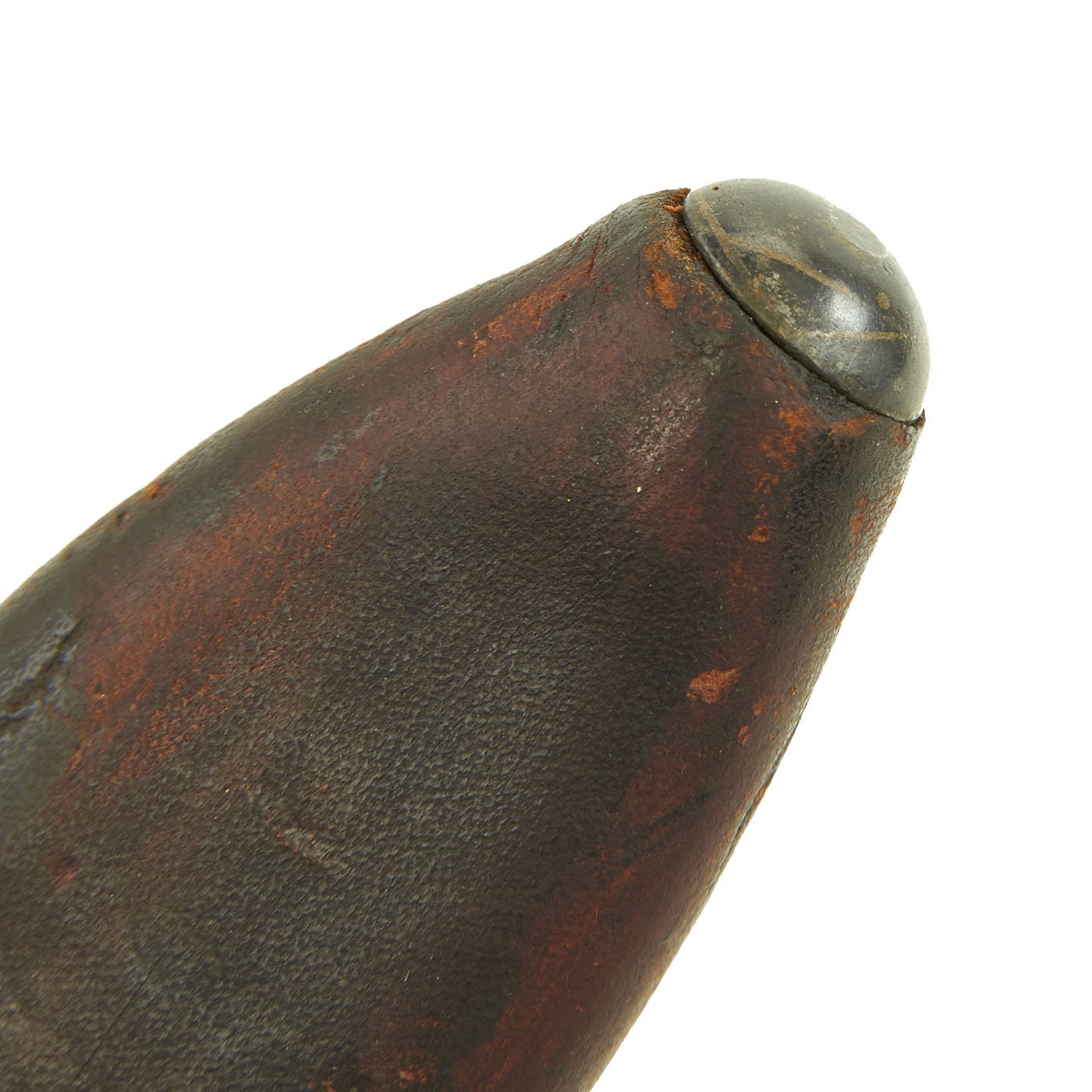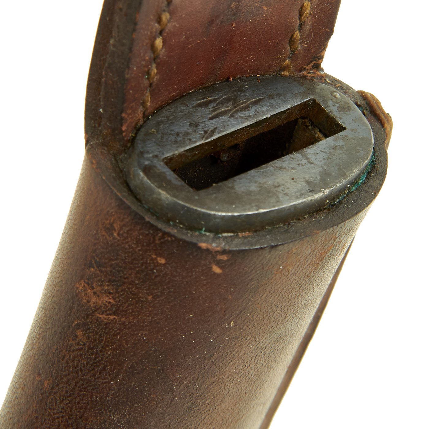 The scabbard for this bayonet is also in very good condition. The scabbards leather body is marked MK II on the back, along with a Canadian "Broad Arrow in C" marking. The scabbard is complete with almost all stitching intact, and the expected light wear to the leather from being over 100 years old.