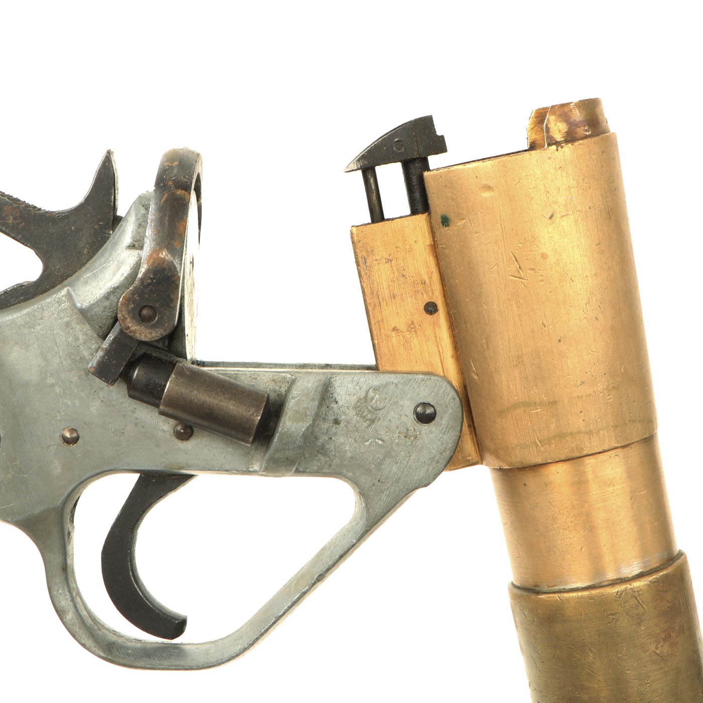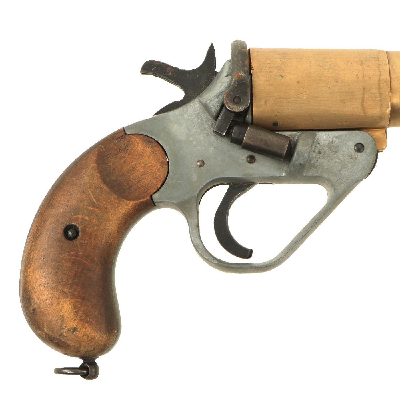 Original Item: Only one available. This is a very nice Great War-produced Canadian example of the British Webley & Scott No.1 Mk 5 style flare pistol, as used in WWI and early WWII. It features the classic barrel with a 1" inch bore and bell shaped muzzle. Following the overall profile of the British No.1 Mk V, this piece is made with a cast zinc frame and brass barrel, instead of the usual pressed steel. The grip however is much more similar to the MkIII British, made of wood instead of the often seen aluminum. Very nicely made. Of particular note is the unusual external barrel latch spring assembly, usually seen only on the Canadian manufactured pistols.