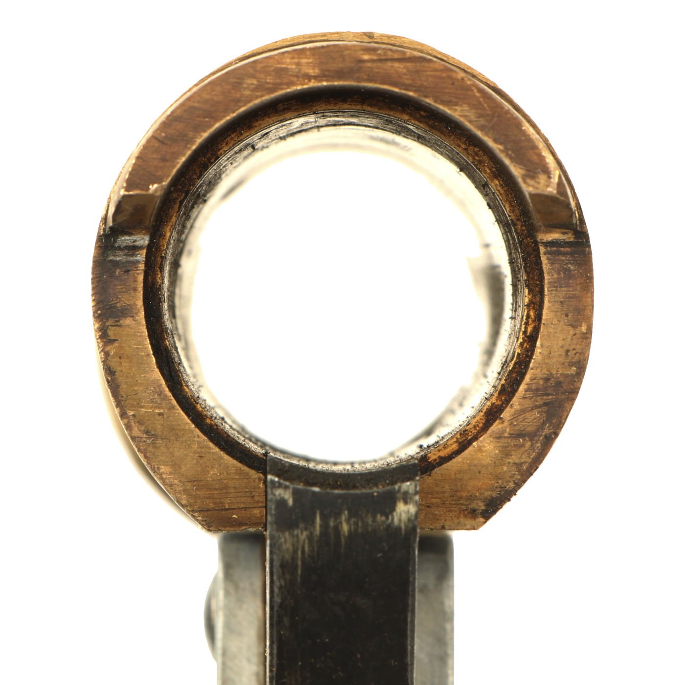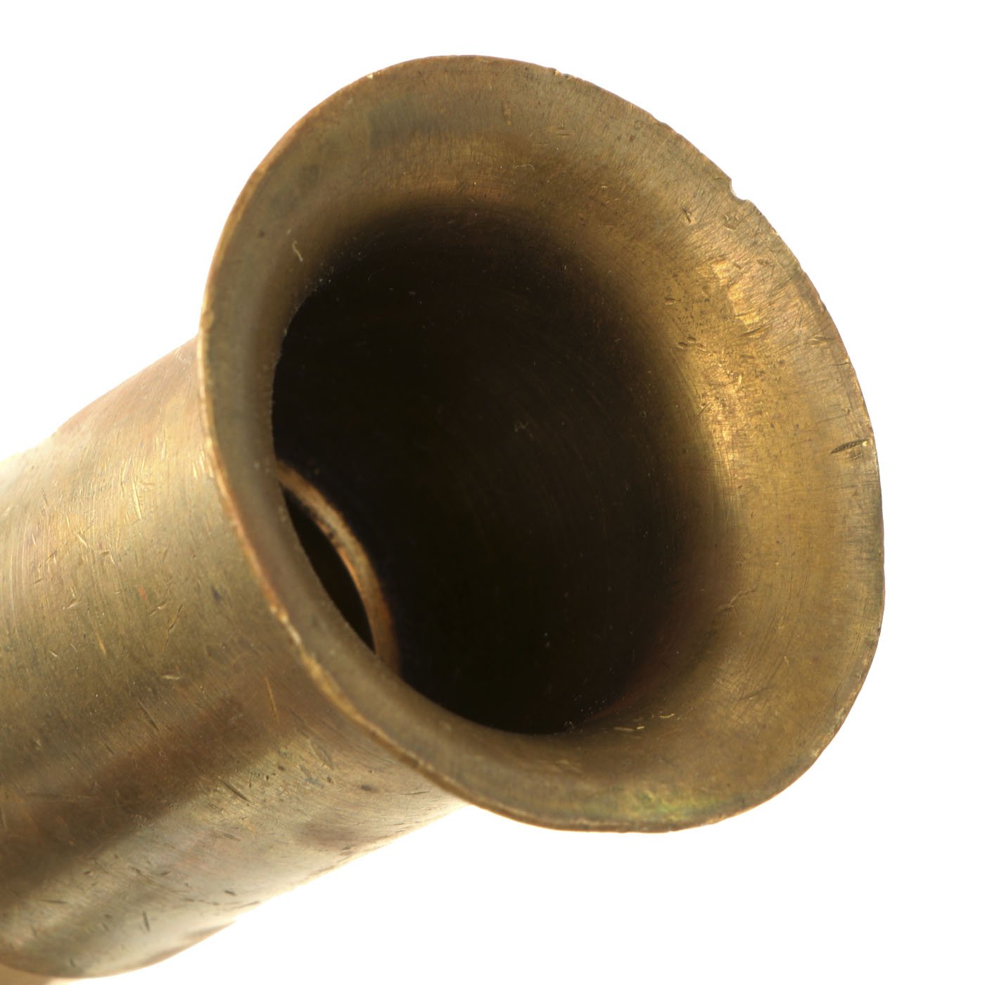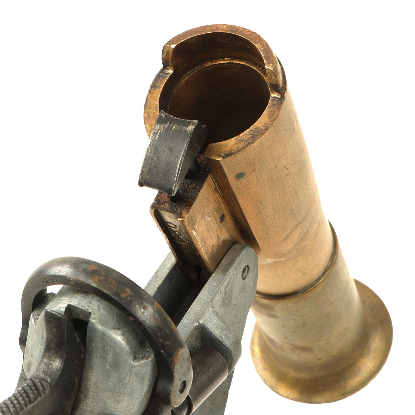 The signal pistol is in very good used condition. All of the markings on the frame and barrel remain crisp and clear. The brass barrel has a nice used look, with a lovely aged brass patina. The zinc frame is in great shape, with the original dull finish present with no major oxidation. The steel components have only some minor surface rust, and no pitting. The trigger and hammer have almost all of the original bluing present.