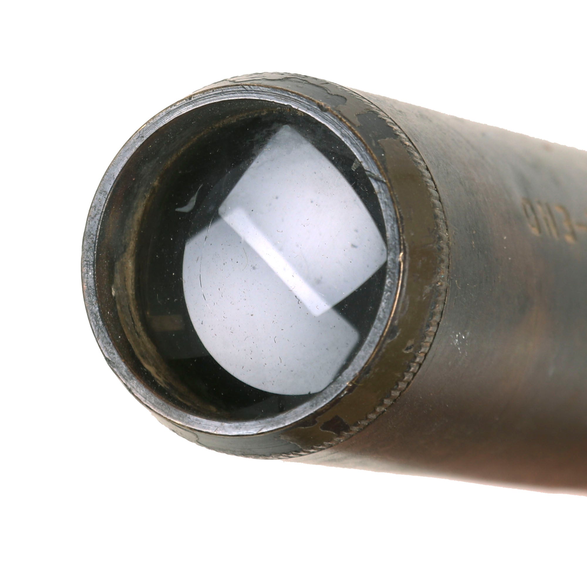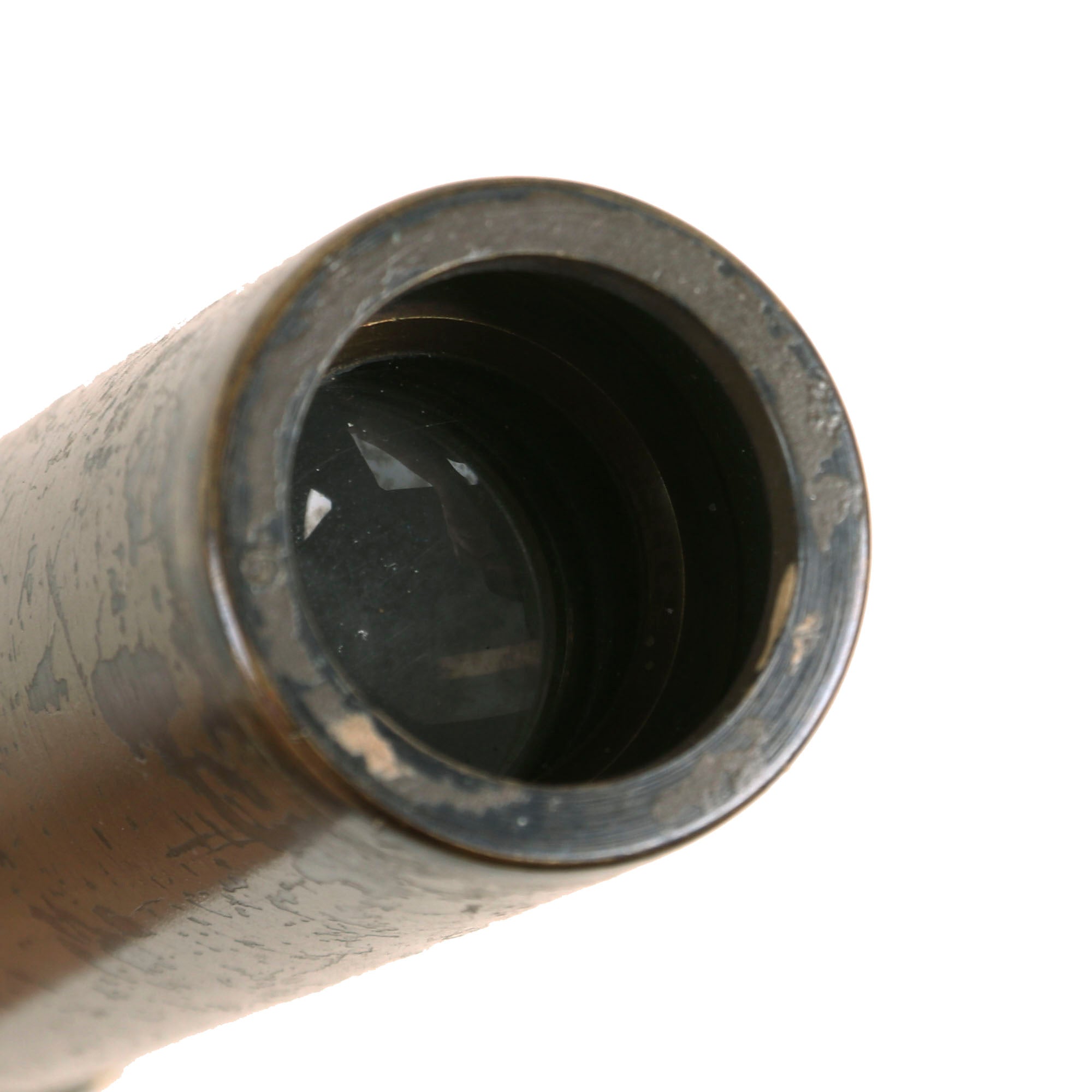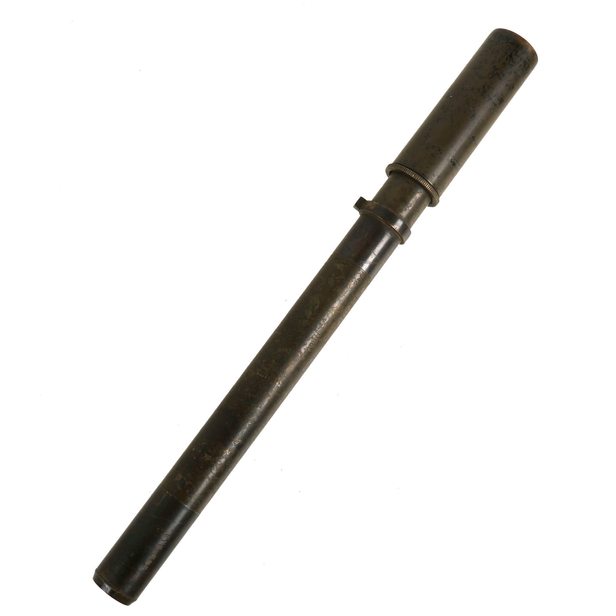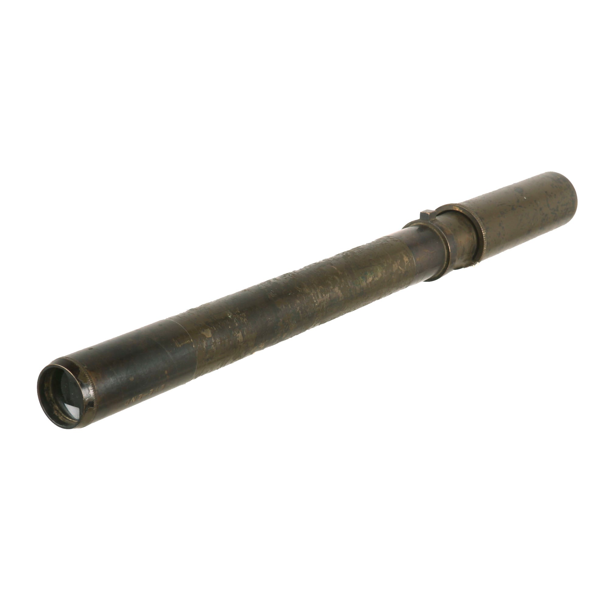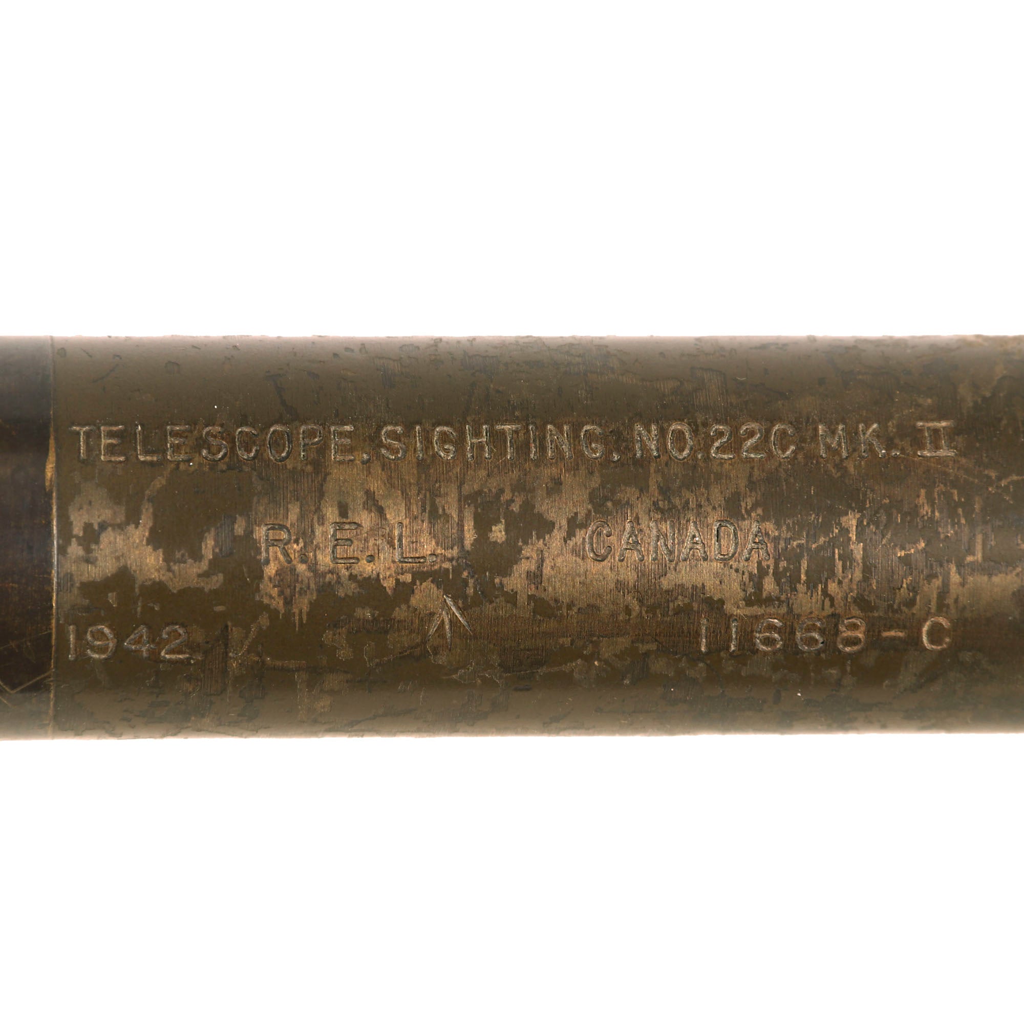 Original Item: Only One Available. The 22C telescope was used with the 2-pounder, 6-pounder, and Bofors AA gun. It is green-painted and made of tooled brass, measuring approximately 14” in length with a 25mm diameter opening at the sighting/eye end and a 30mm diameter at the target end. It is well marked with "TELESCOPE SIGHTING NO 22C MK2," "R.E.L. CANADA 1942," a broad arrow, and "11668-C."
