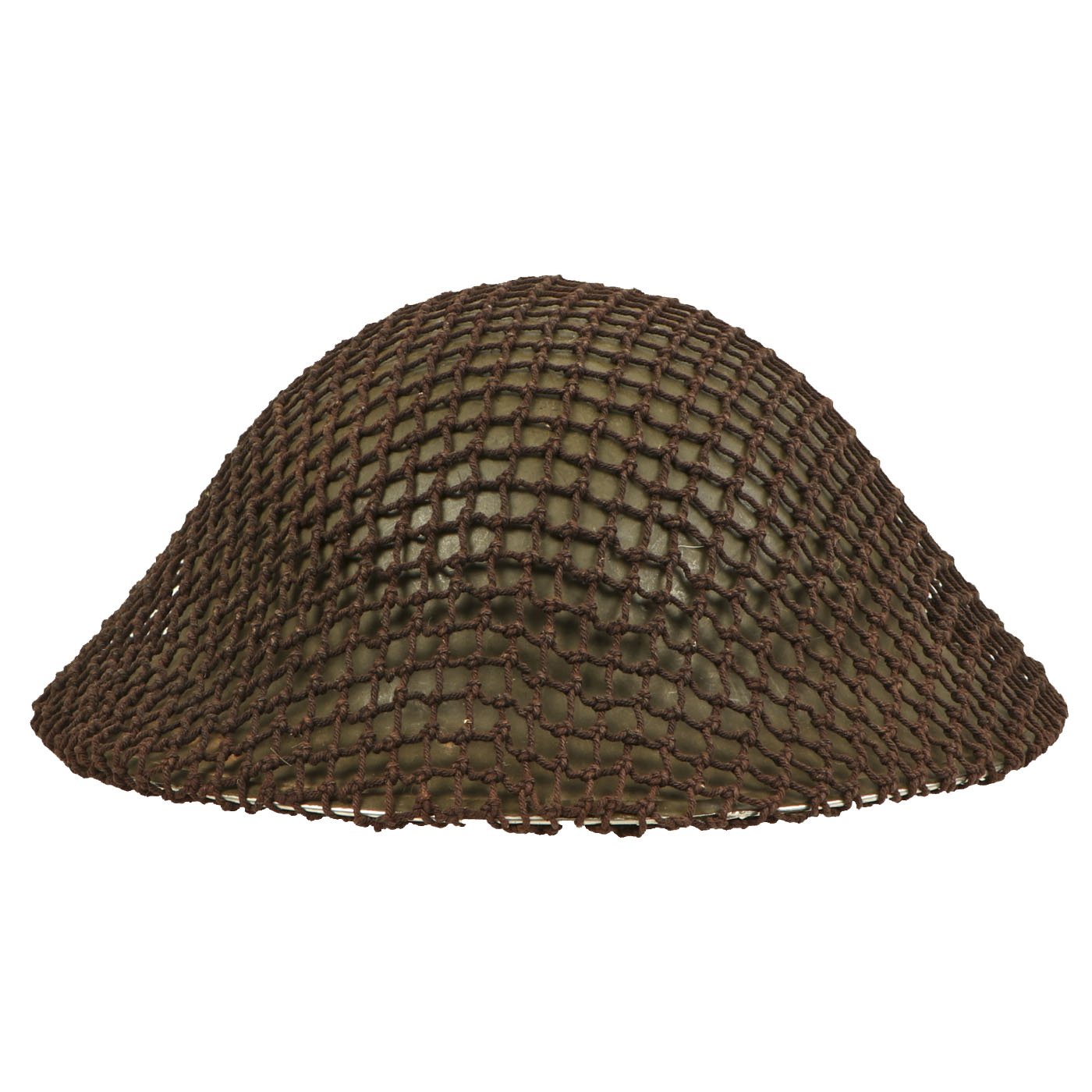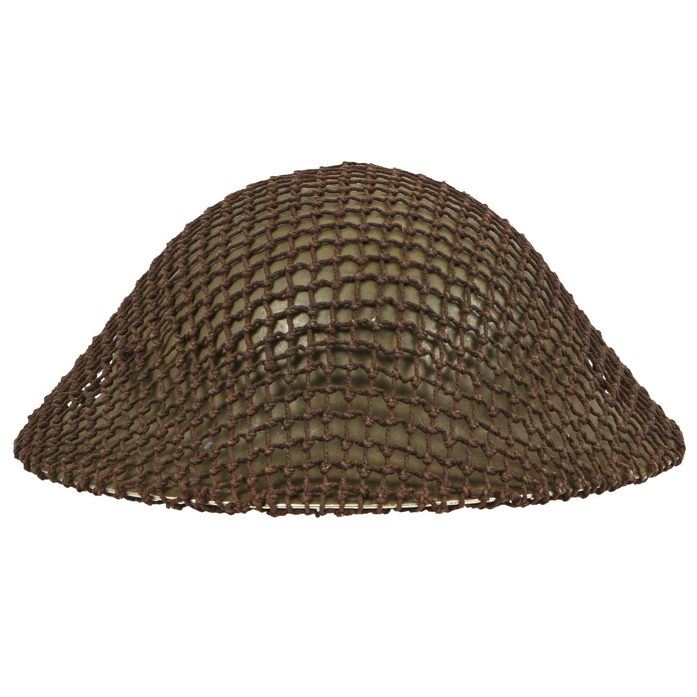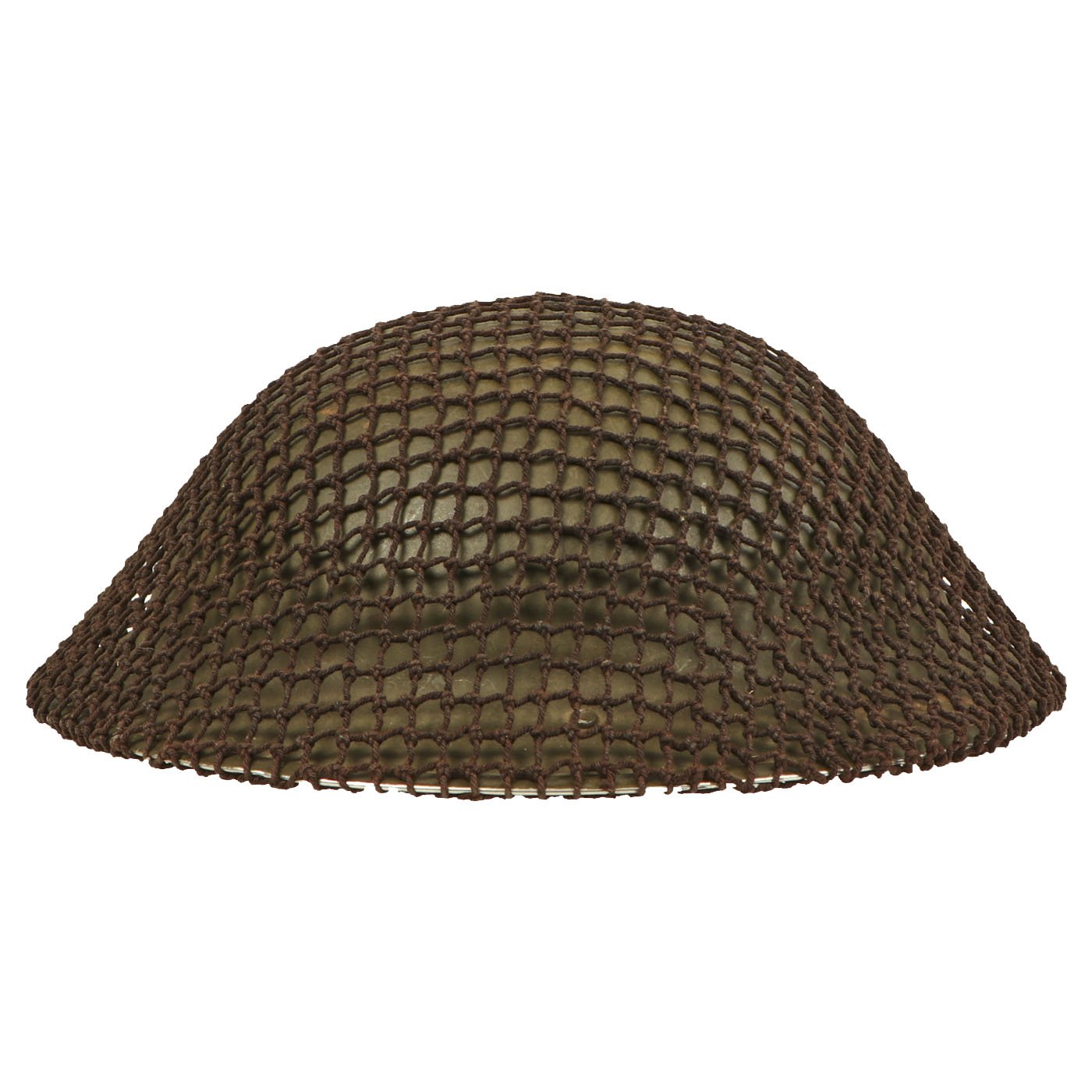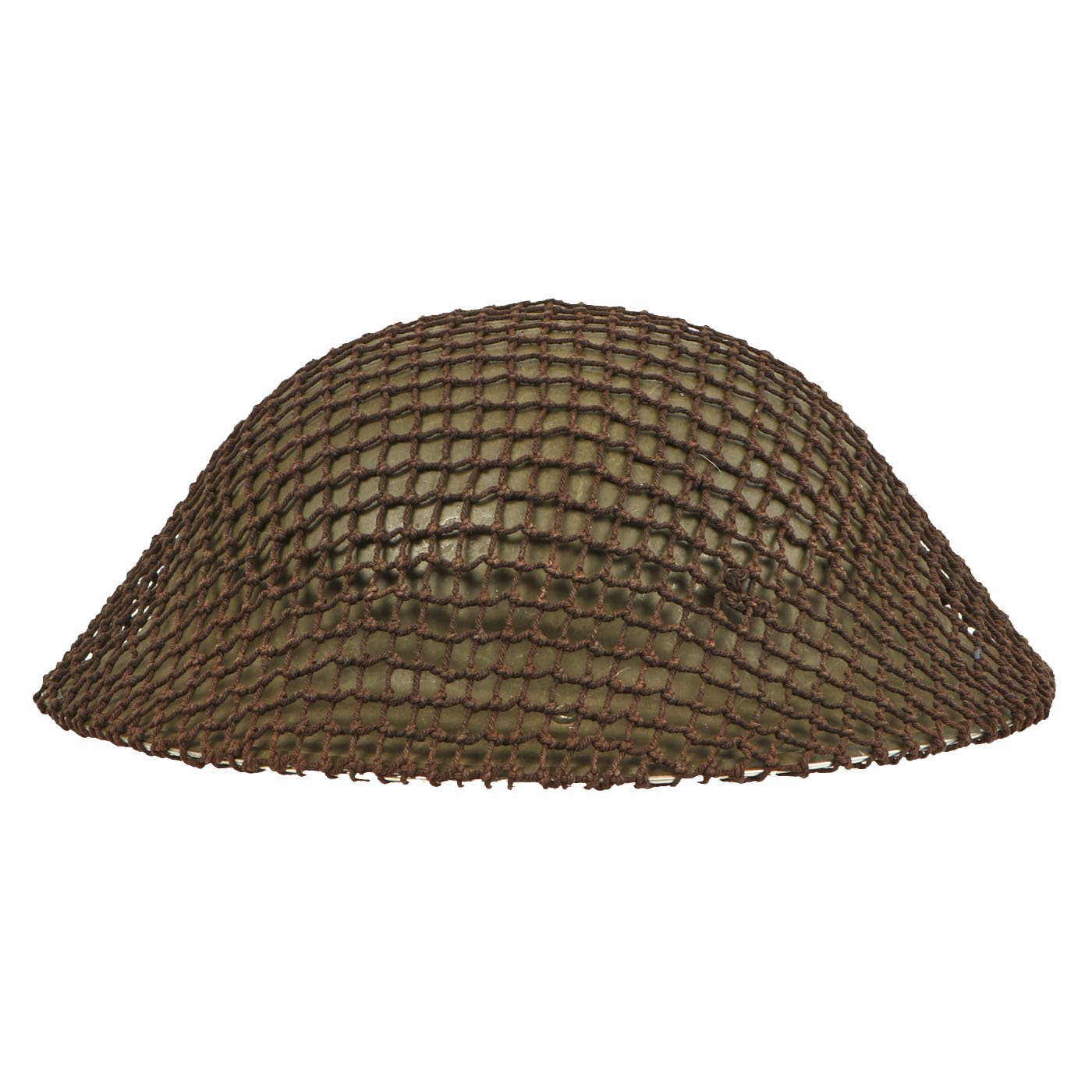 Original Item: Only One Available. This is a very good example of a genuine Canadian -manufactured Mark II steel helmet, dated 1941 on the shell, complete with a brown helmet net. It comes with the correct dark OD green satin paint used on Canadian helmets, which has only some light wear on the stainless steel rim.