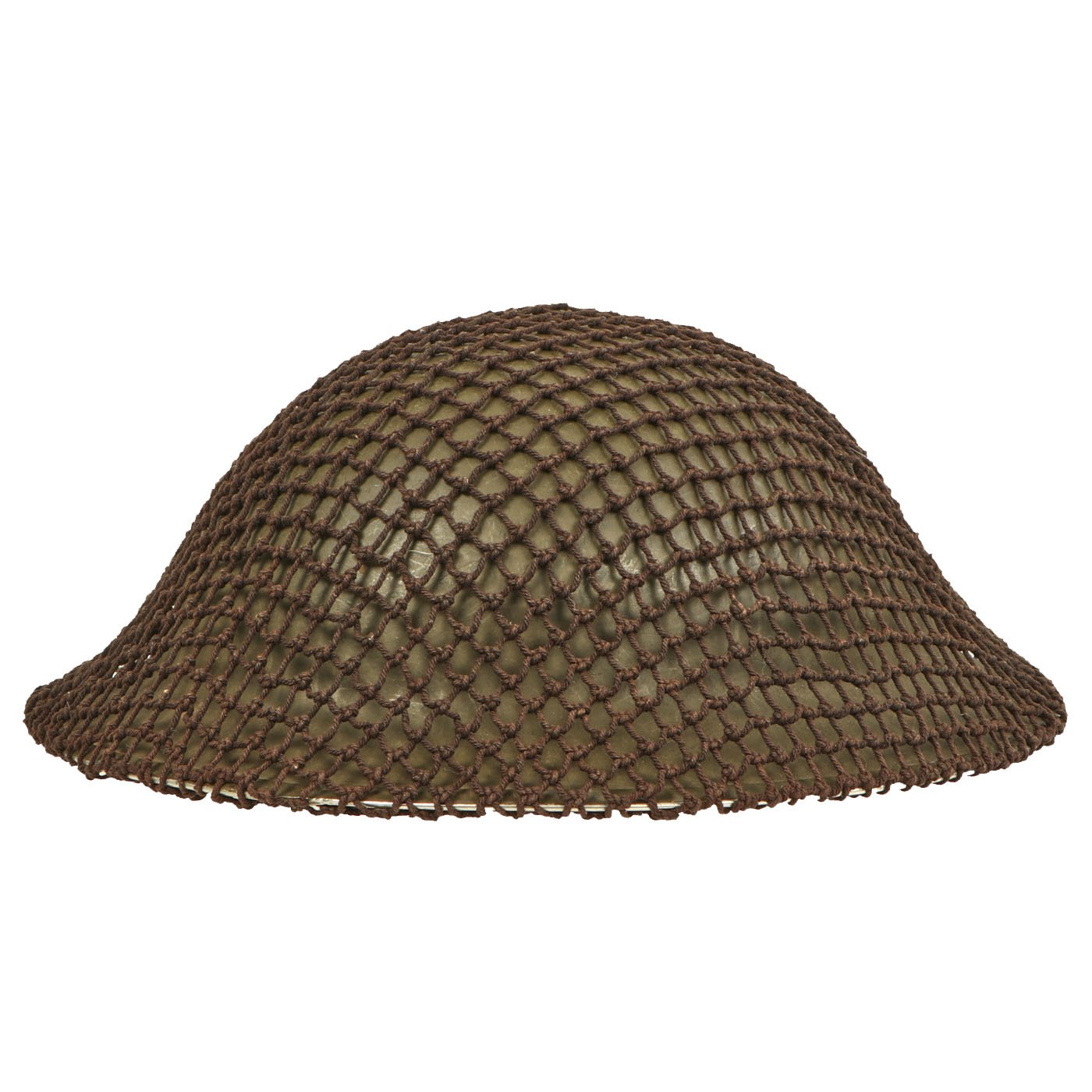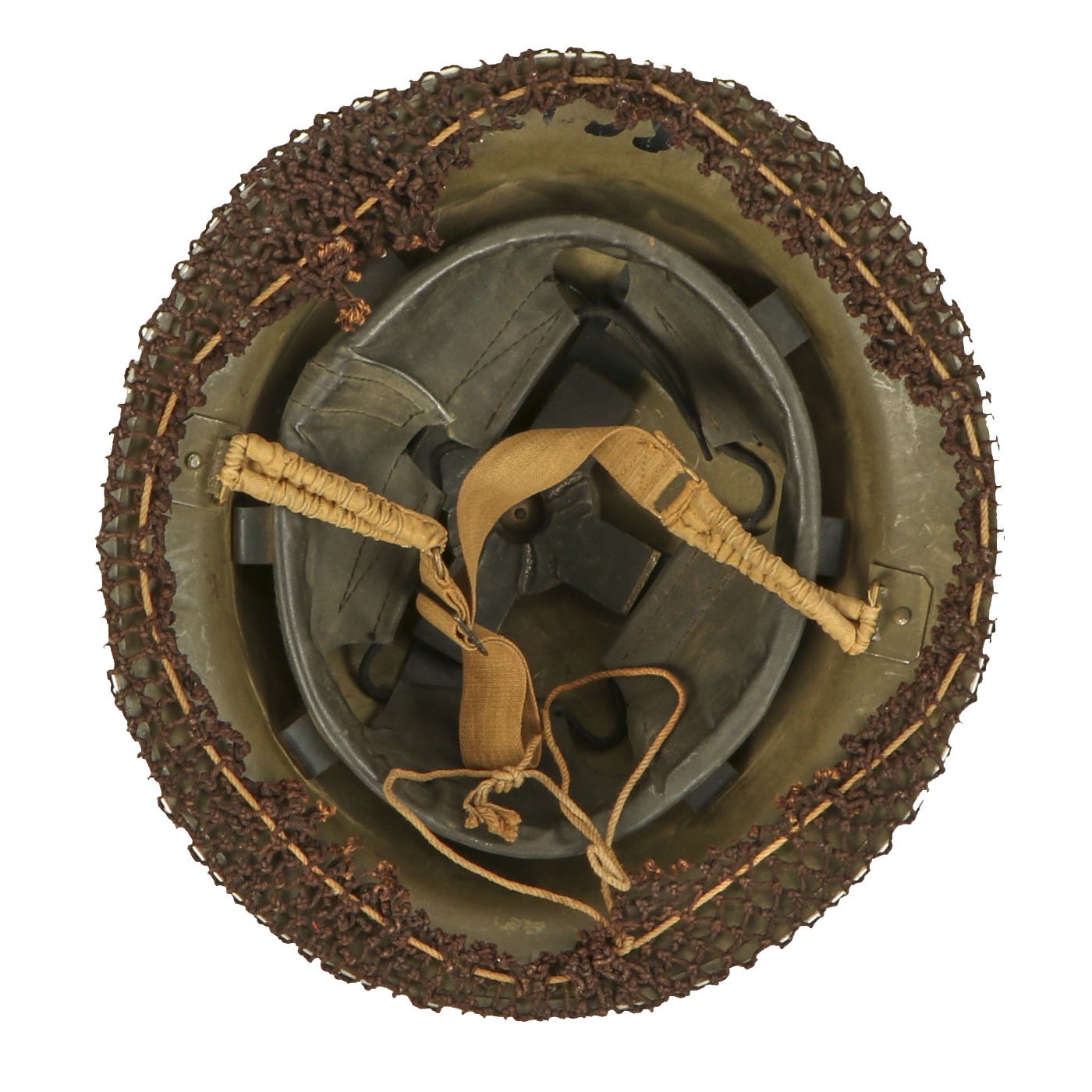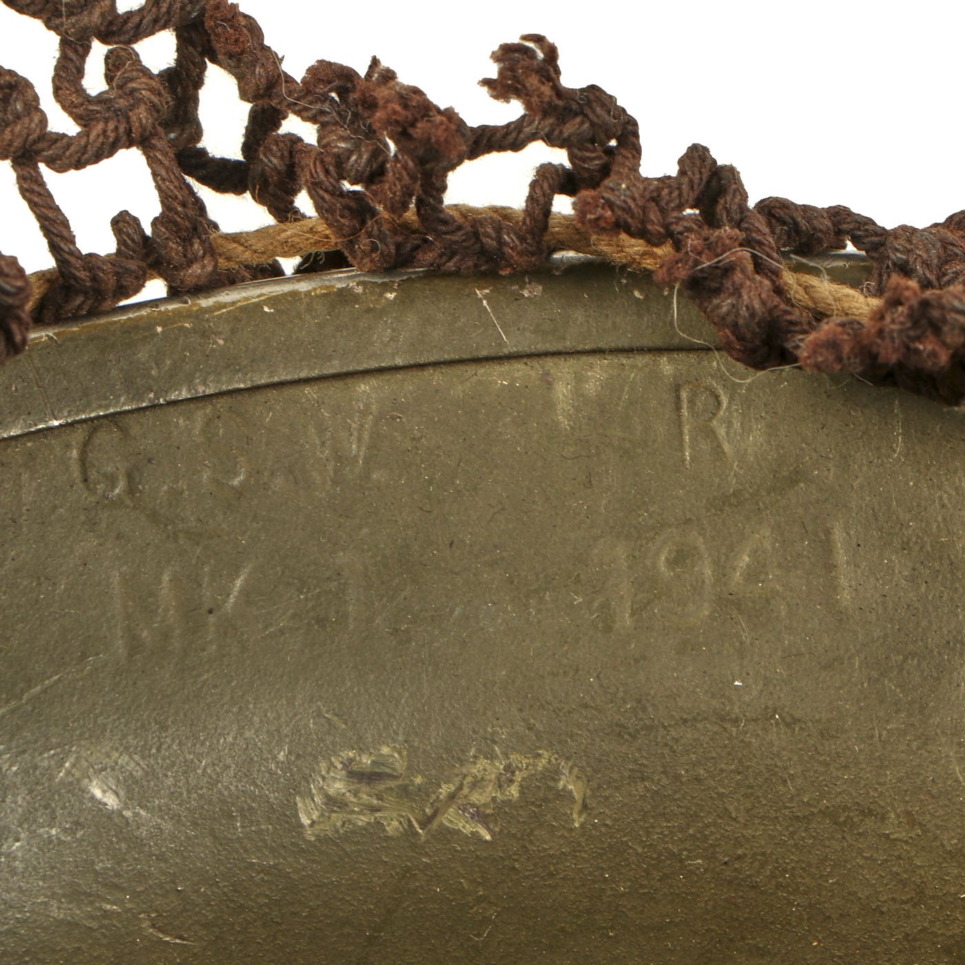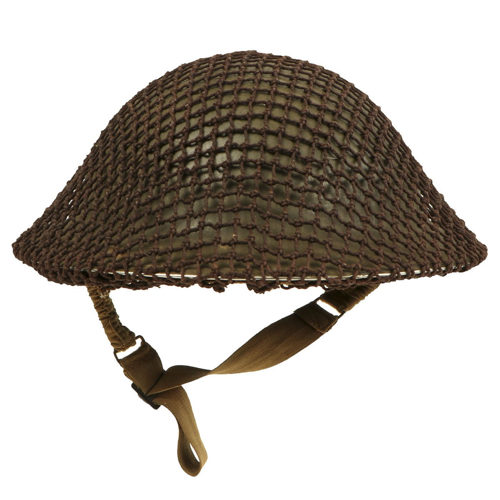 Original Item: Only One Available. This is a very good example of a genuine Canadian -manufactured Mark II steel helmet, dated 1941 on the shell, complete with a brown helmet net. It comes with the correct dark OD green satin paint used on Canadian helmets, which has only some light wear on the stainless steel rim.