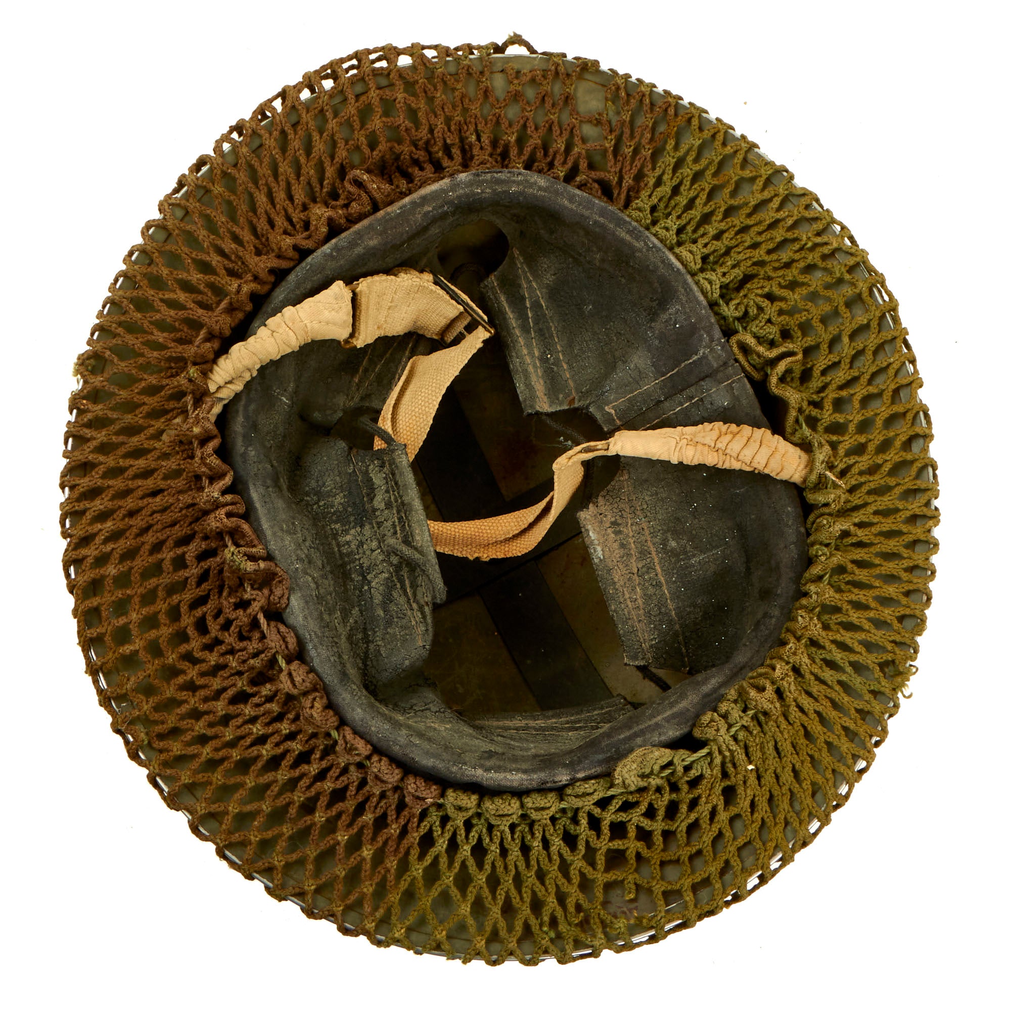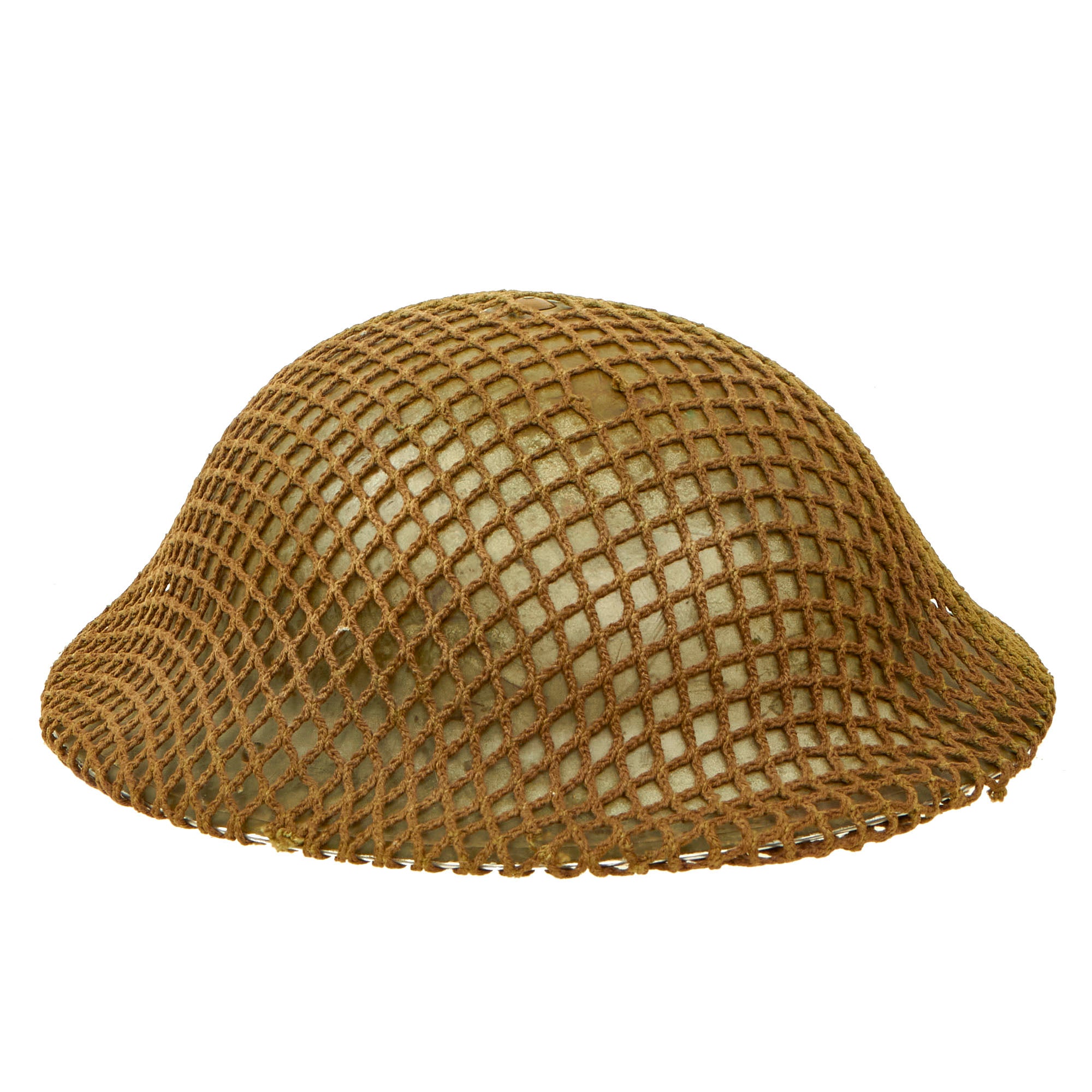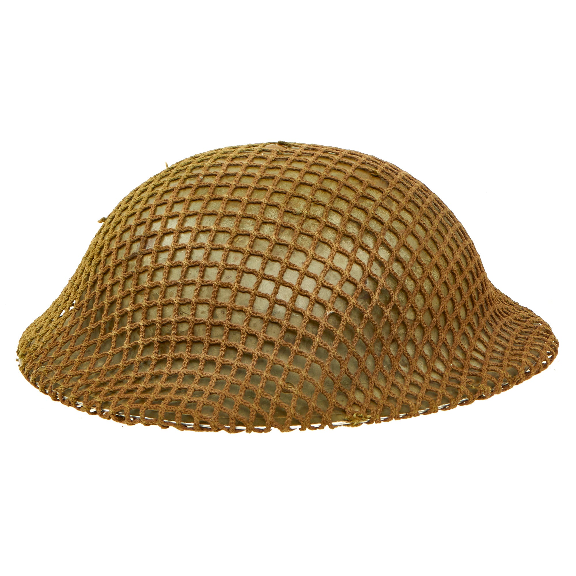 Original Item: Only One Available. This is a very good example of a genuine Canadian -Manufactured Mark II steel helmet, dated 1942 on the shell, complete with chinstrap, and a British Issue Helmet Net. It comes with the correct dark OD green satin paint used on Canadian helmets, which has only some light wear on the stainless steel rim. We cannot find a manufacturer’s stamp on the liner.
