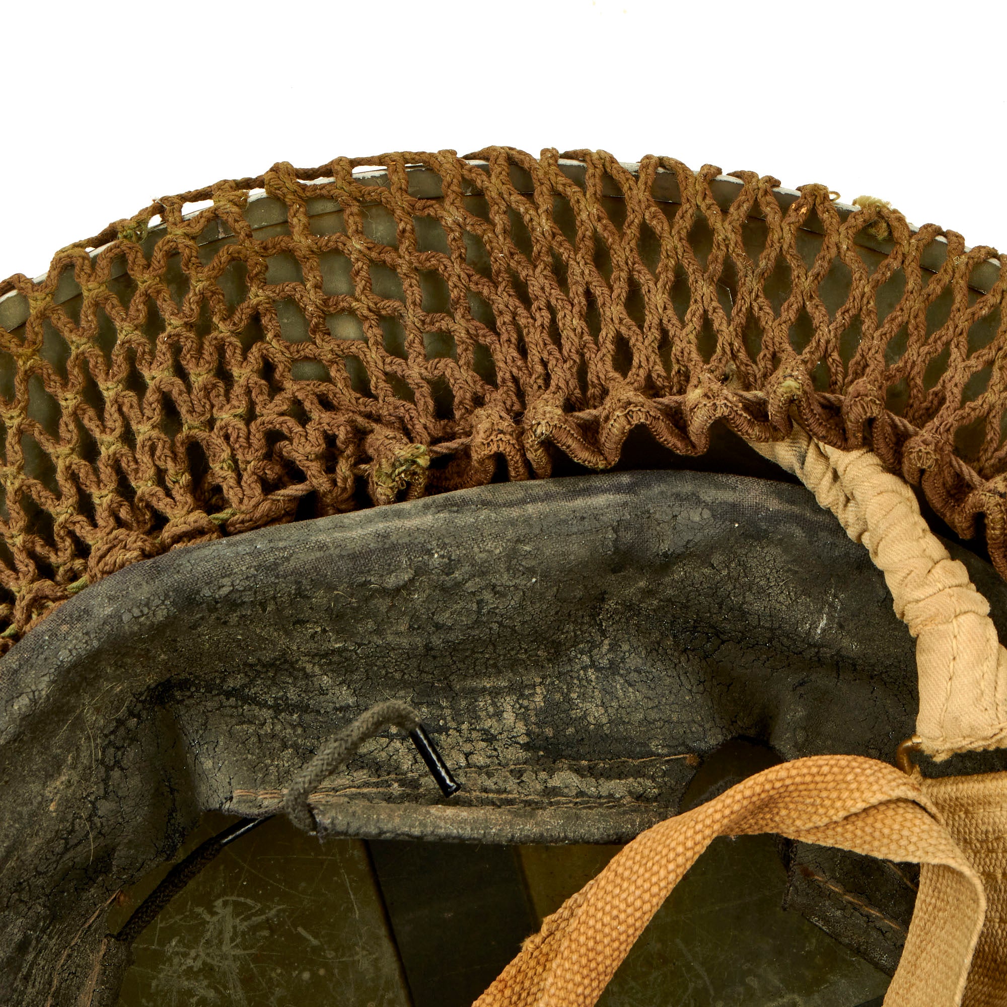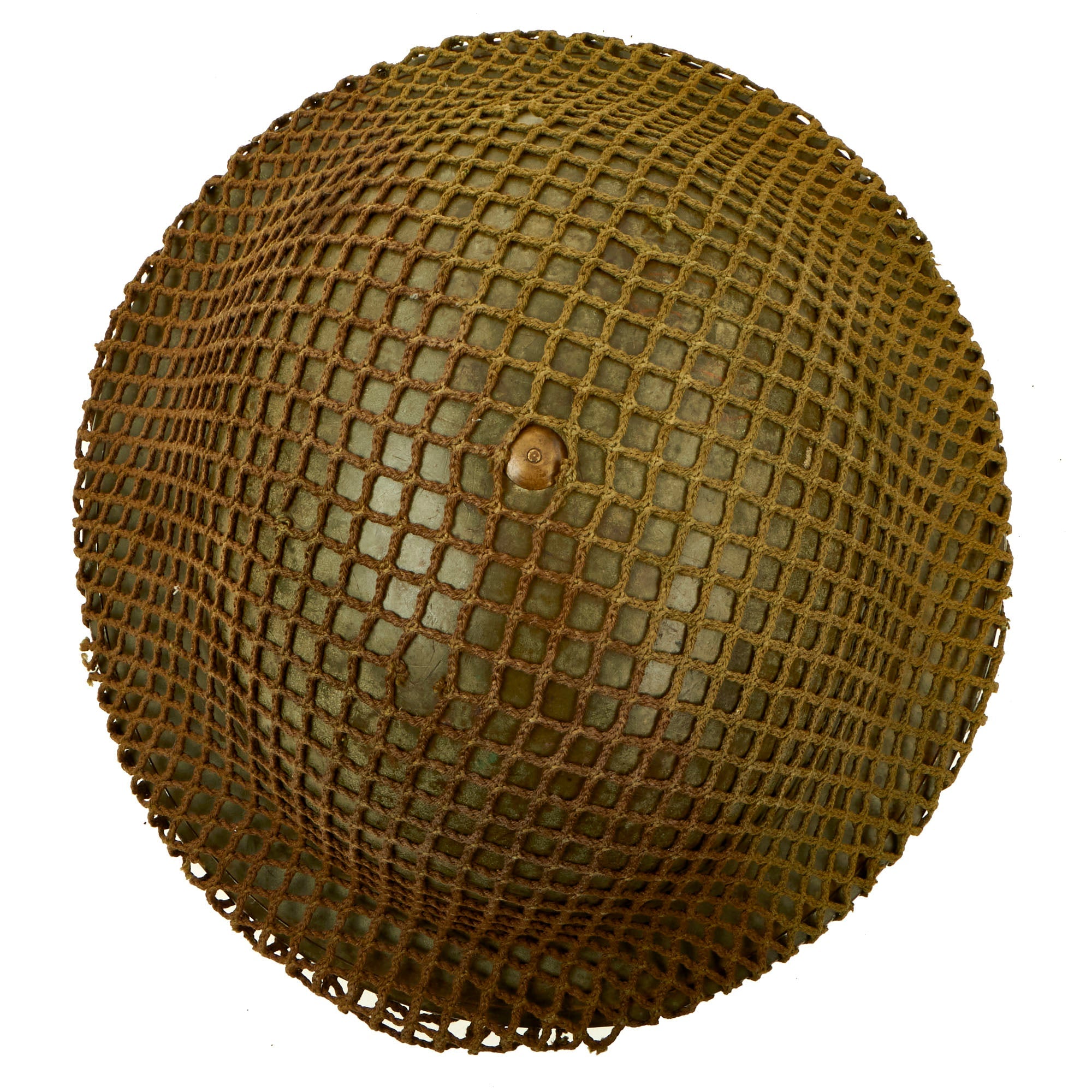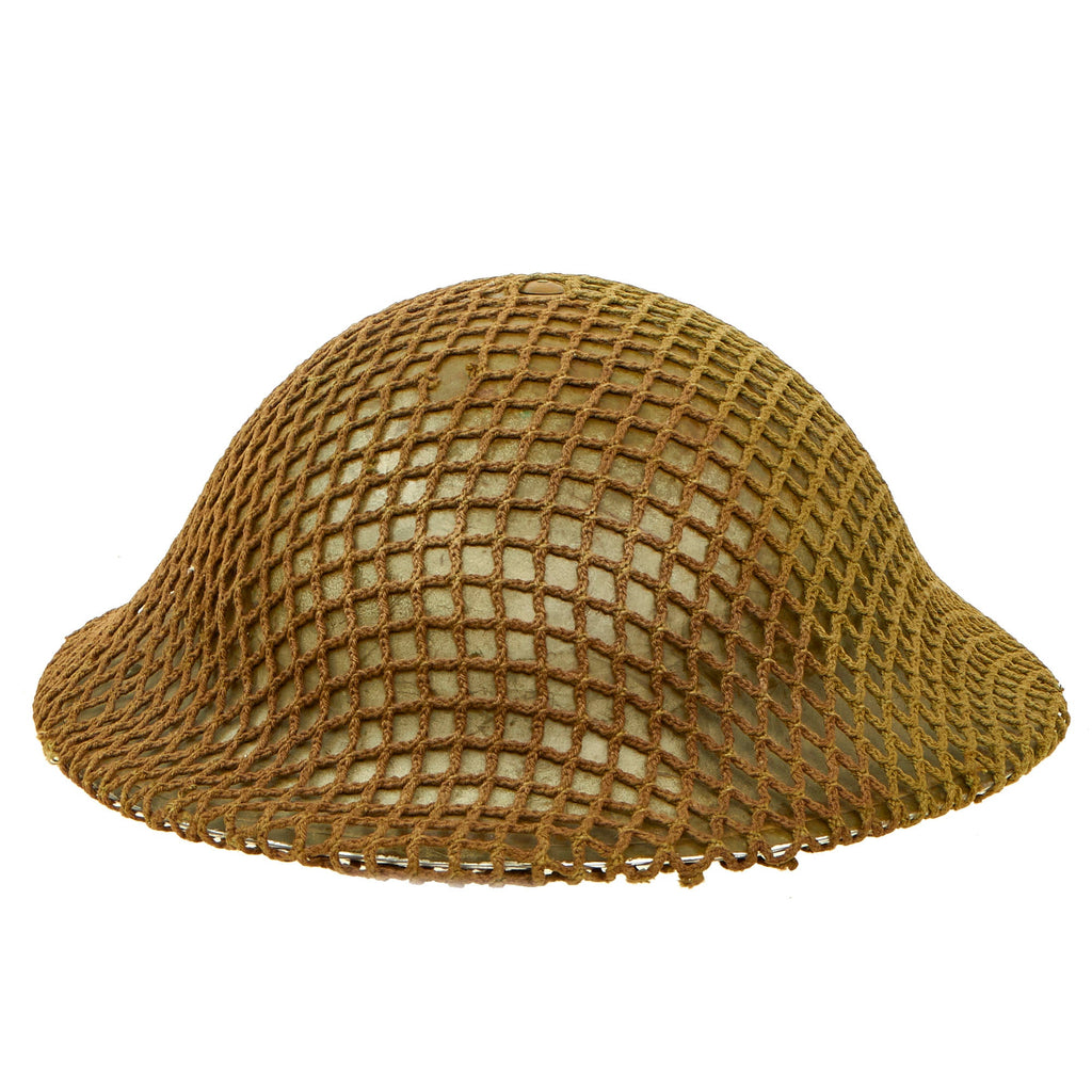 Original Item: Only One Available. This is a very good example of a genuine Canadian -Manufactured Mark II steel helmet, dated 1942 on the shell, complete with chinstrap, and a British Issue Helmet Net. It comes with the correct dark OD green satin paint used on Canadian helmets, which has only some light wear on the stainless steel rim. We cannot find a manufacturer’s stamp on the liner.