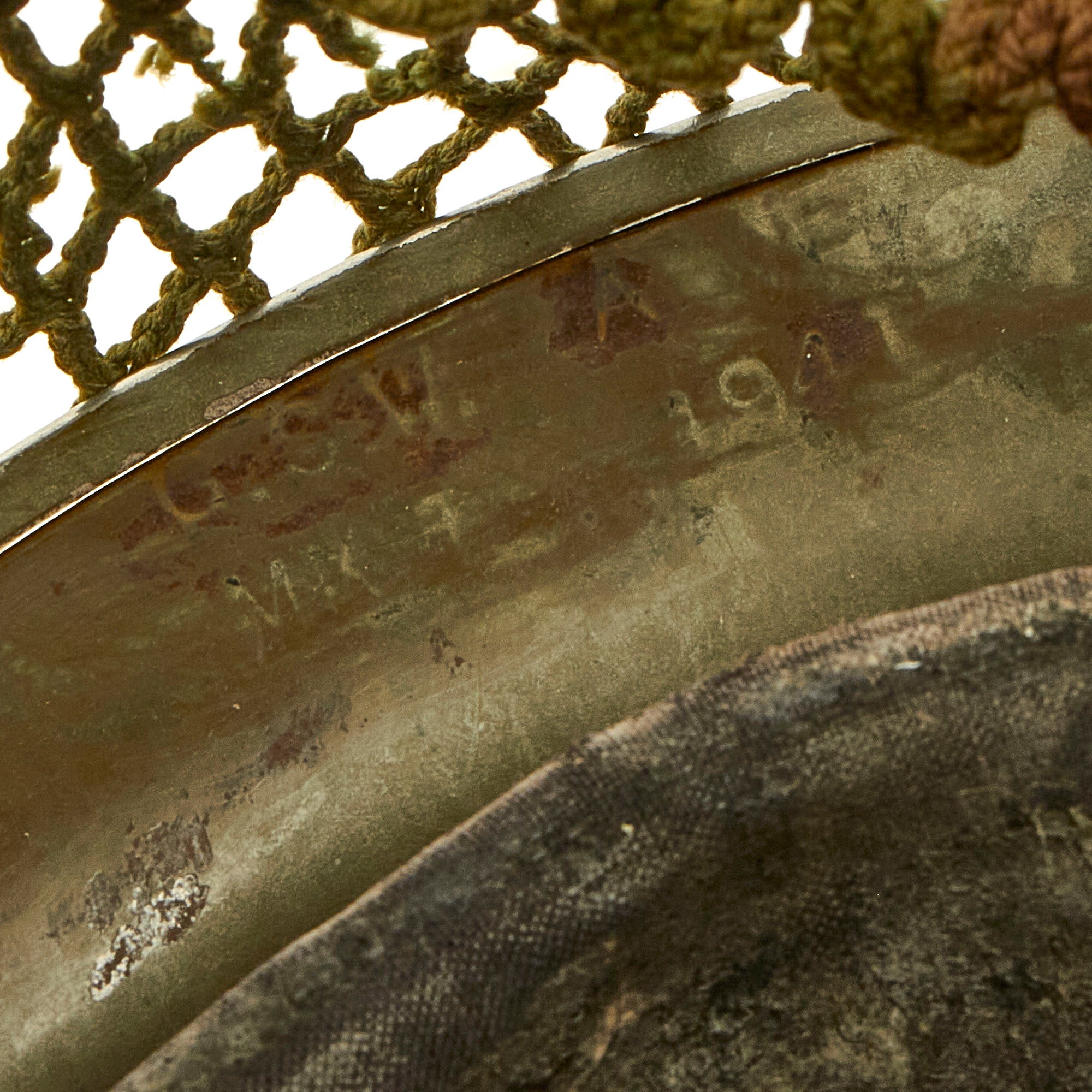 The shell is overall in great shape with no major issues. The helmet net is a dark brown green color, with nice cotton construction, typical of the type used by Canadian and British forces during WWII. The shell is stamped on the underside rim with G.S.W. 1941. G.S.W. is for General Steel Wares. of Toronto who made helmets from 1940 to 1942, making this a rather rare maker to come across.