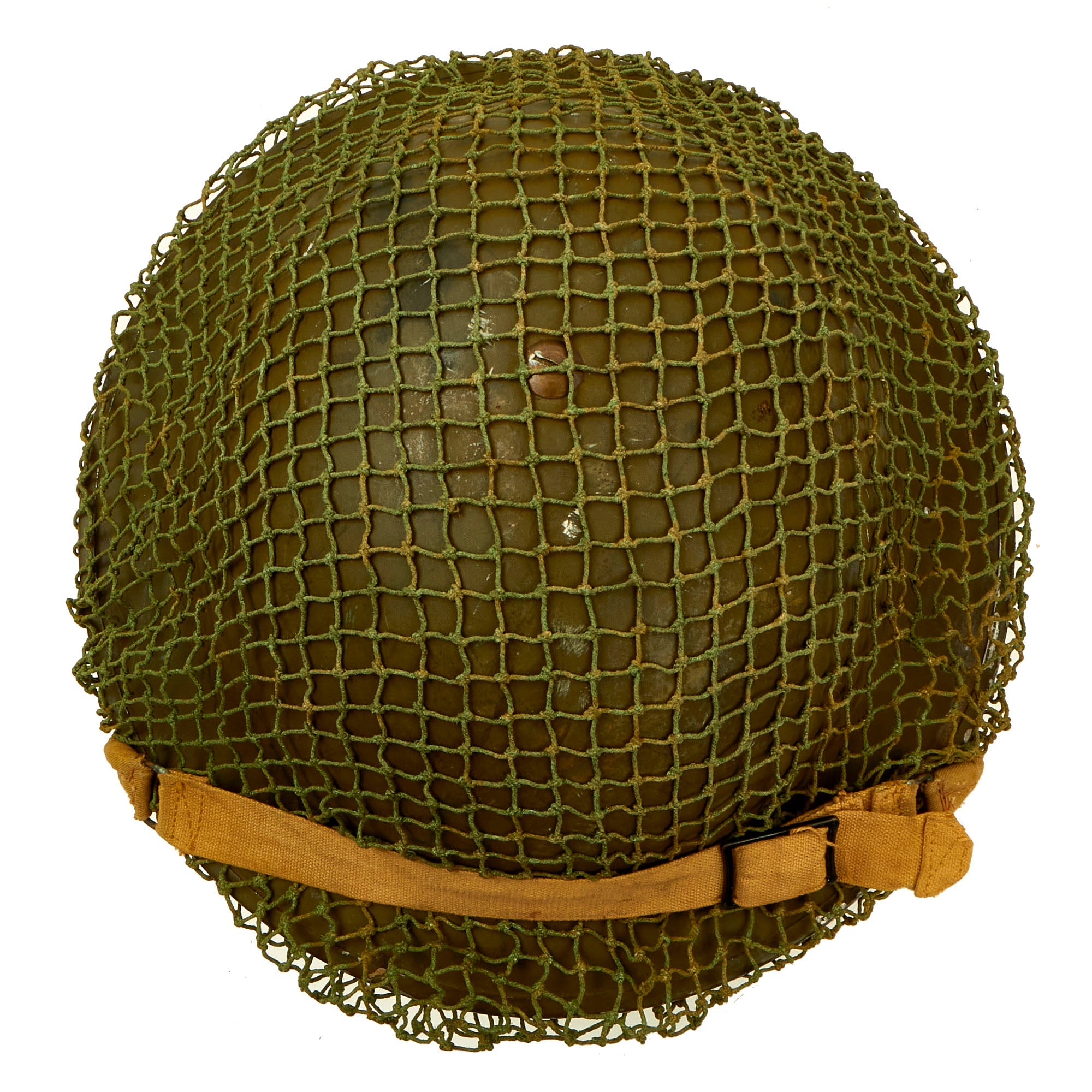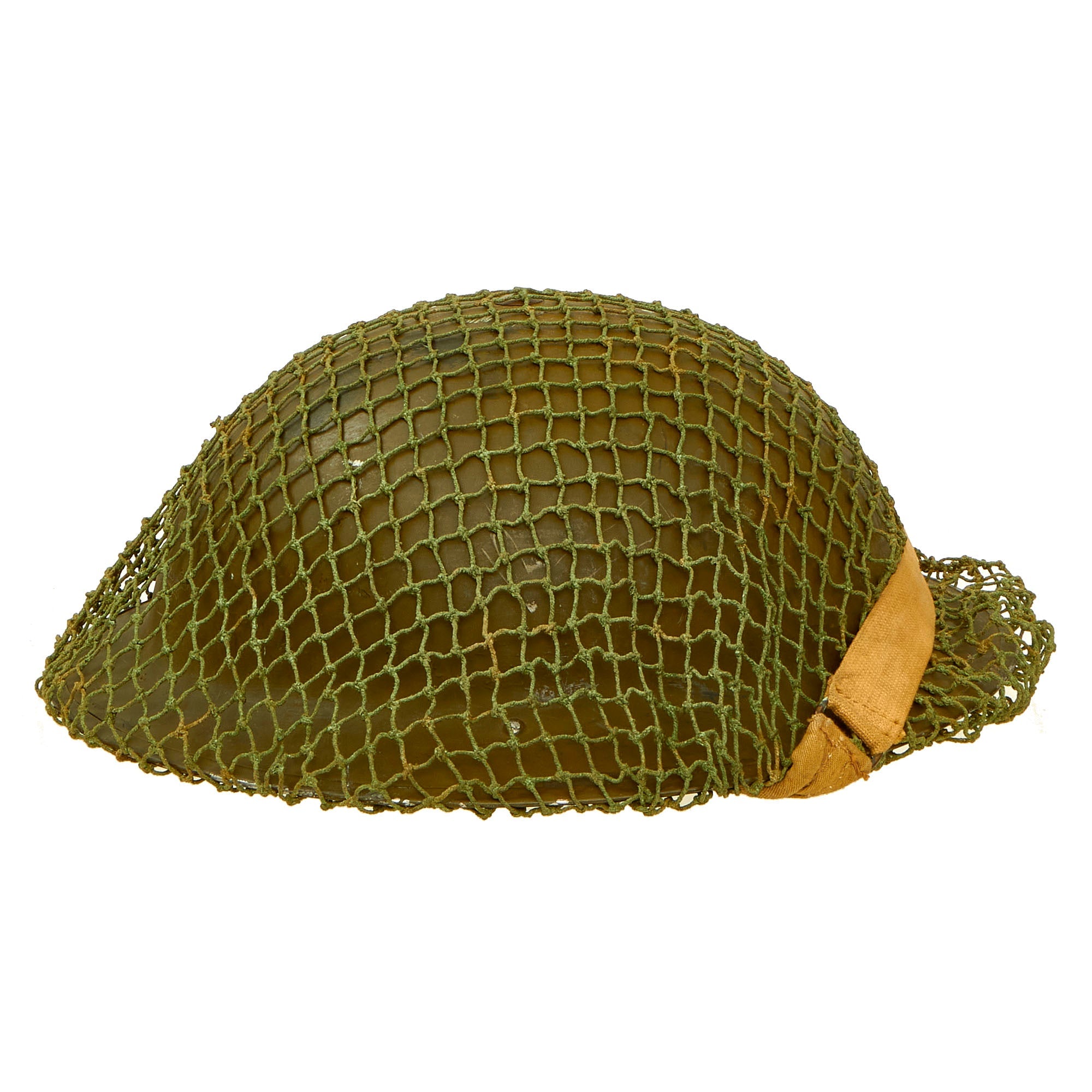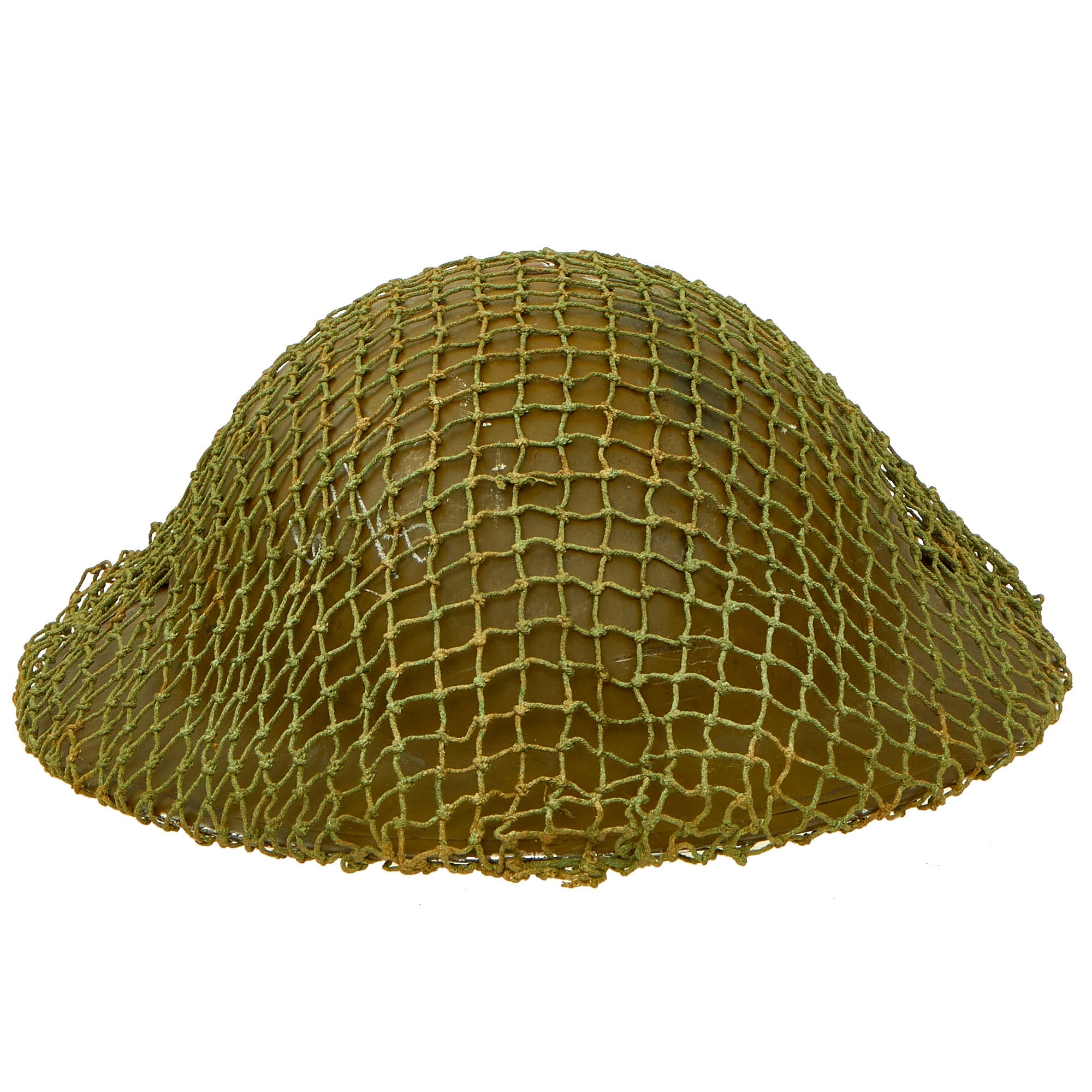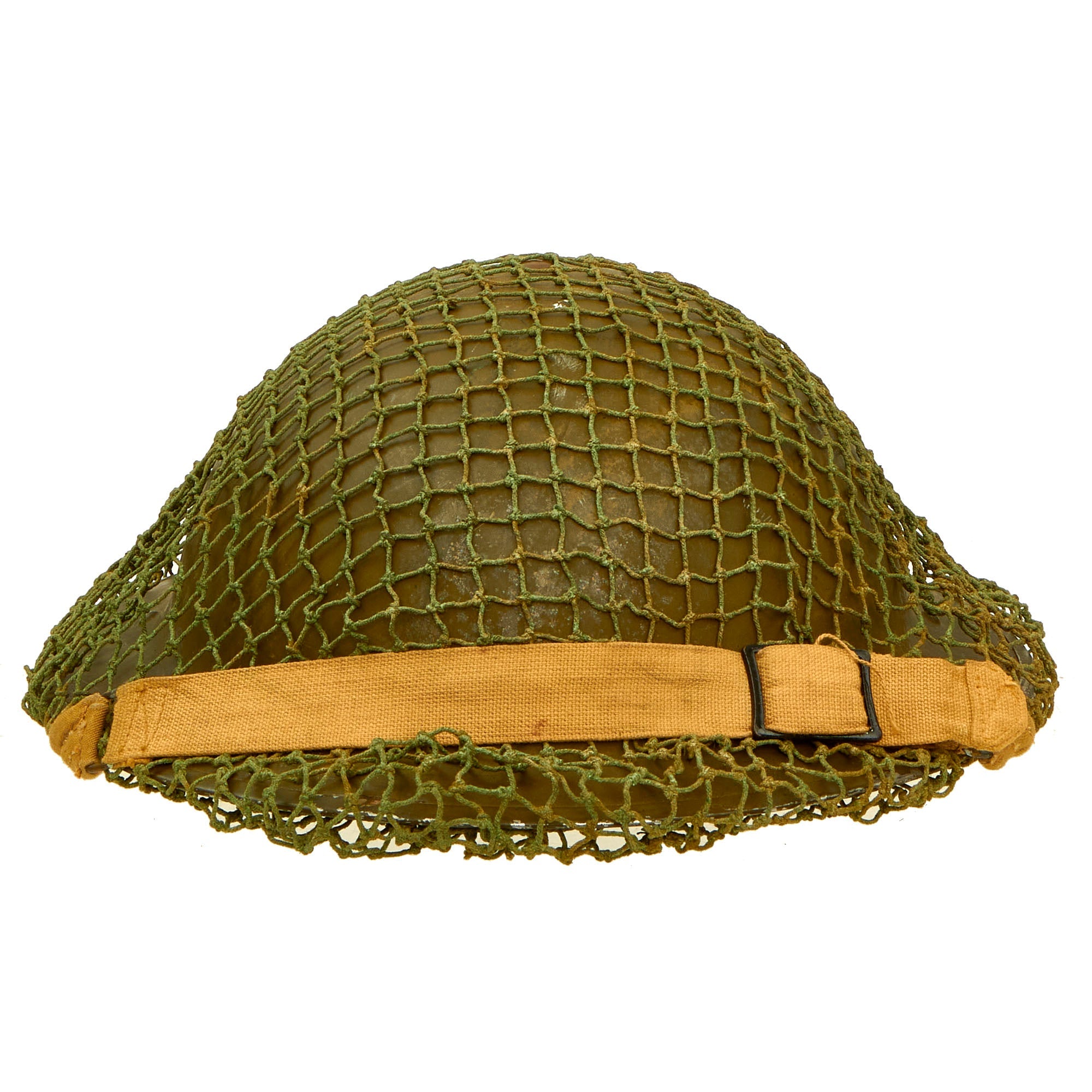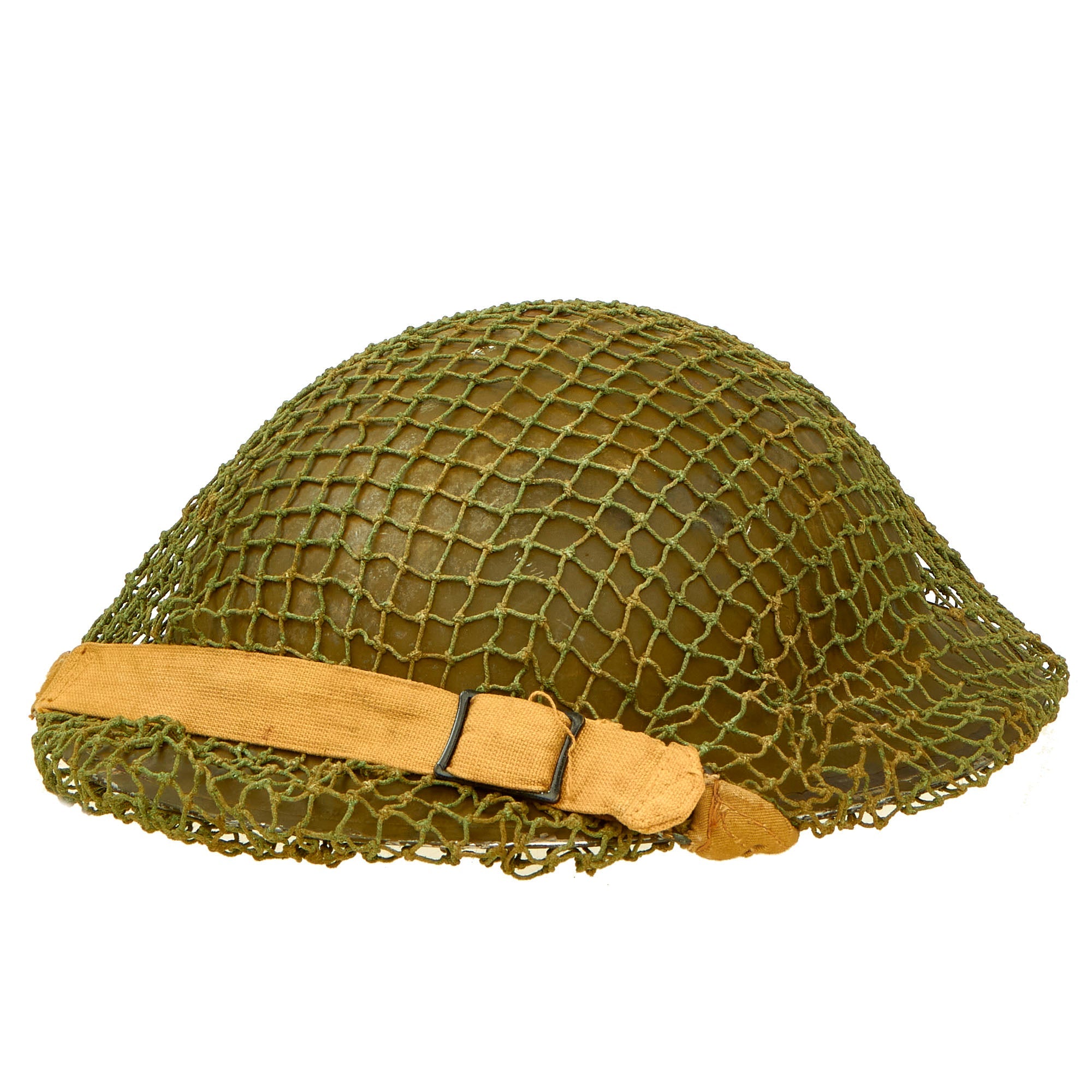 Original Item: Only One Available. This is a very good example of a genuine Canadian -Manufactured Mark II steel helmet, dated 1942 on the shell, complete with chinstrap, and a British Issue Helmet Net. It comes with the correct dark OD green satin paint used on Canadian helmets, which has only some light wear on the stainless steel rim. We cannot find a manufacturer’s stamp on the liner.