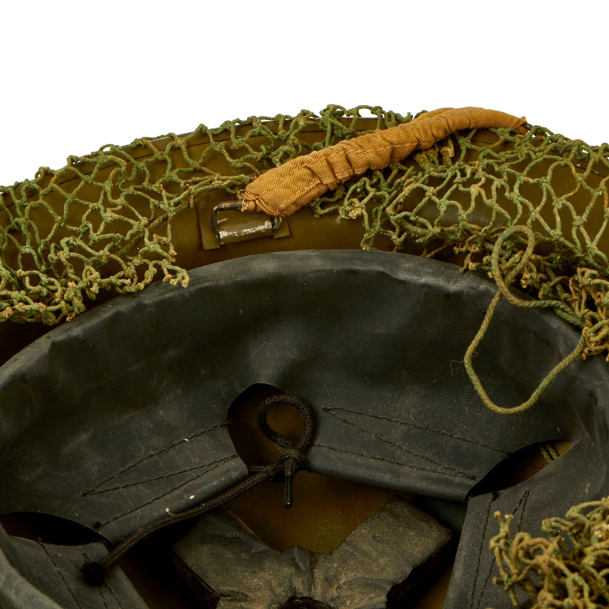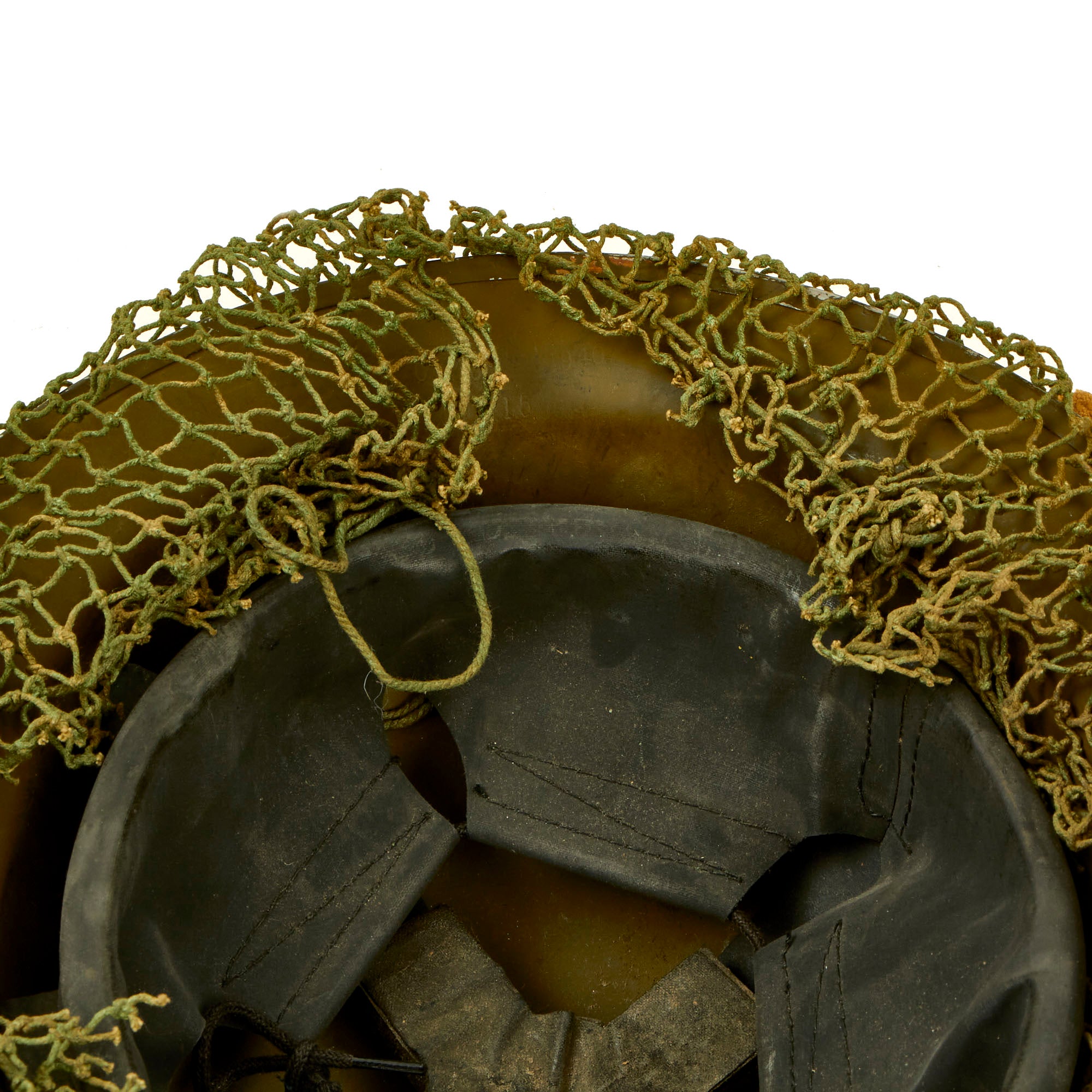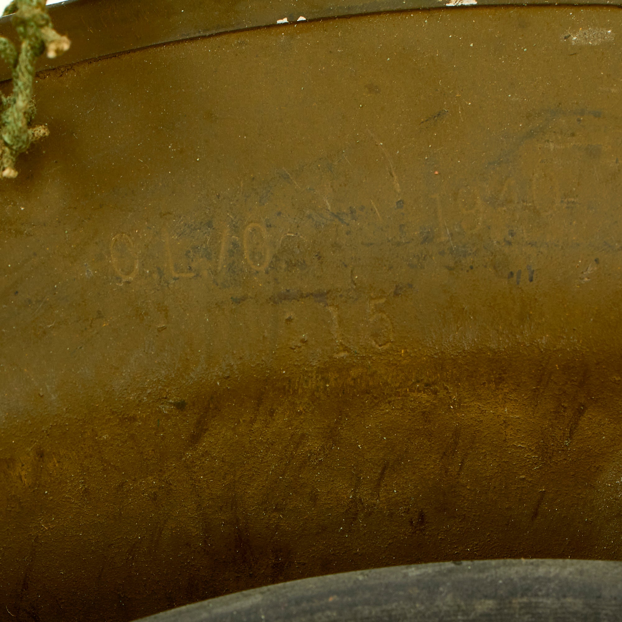 The shell is overall in great shape with no major issues. The helmet net is a dark green color, with nice cotton construction, typical of the type used by Canadian and British forces during WWII. The shell is stamped on the underside rim with C.L./C. 1940. C.L./C. stands for the Canadian Motor Lamp Company of Windsor, who made helmets from 1940 to 1943.