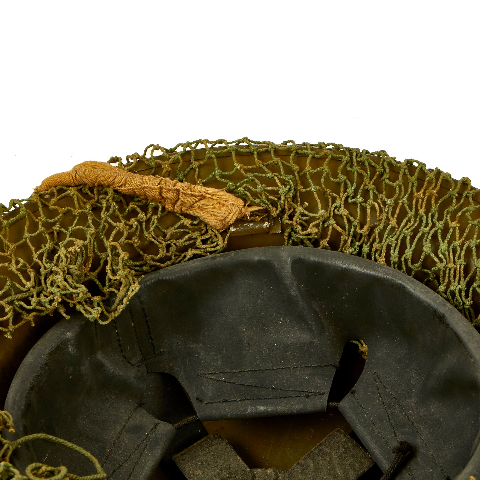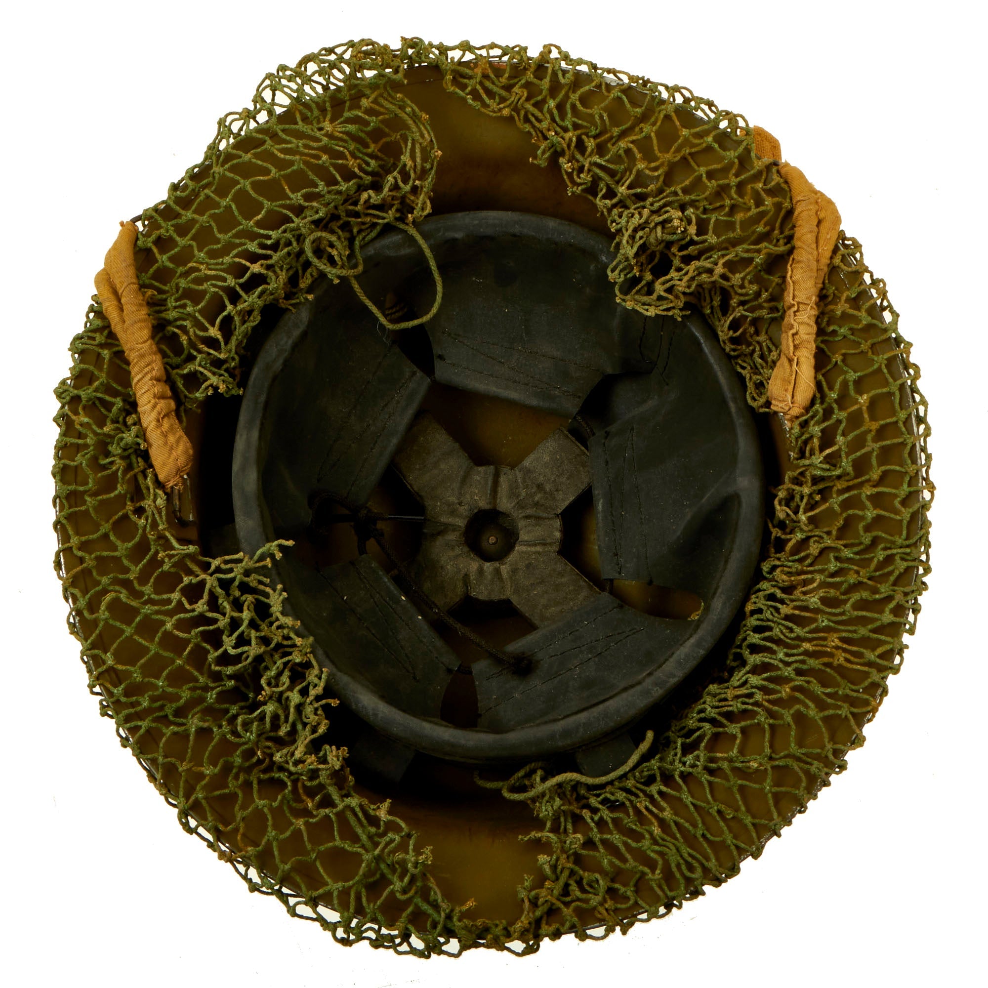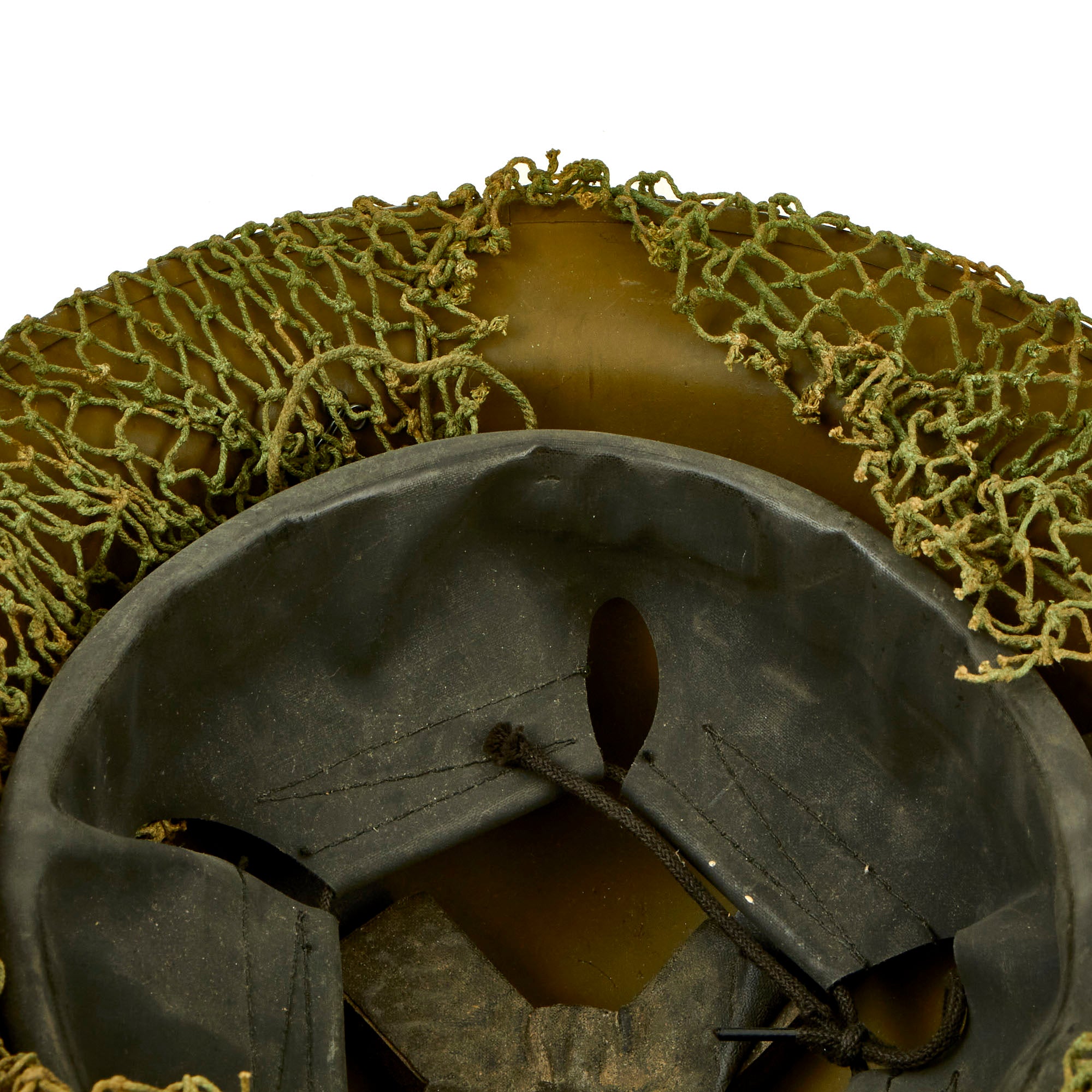 The shell is overall in great shape with no major issues. The helmet net is a dark green color, with nice cotton construction, typical of the type used by Canadian and British forces during WWII. The shell is stamped on the underside rim with C.L./C. 1940. C.L./C. stands for the Canadian Motor Lamp Company of Windsor, who made helmets from 1940 to 1943.