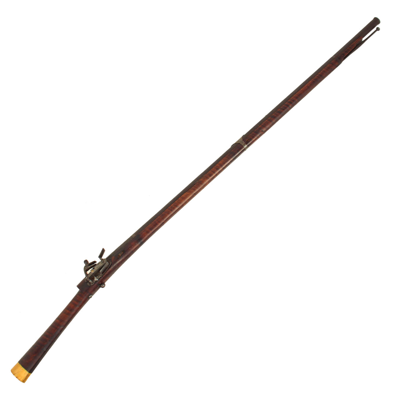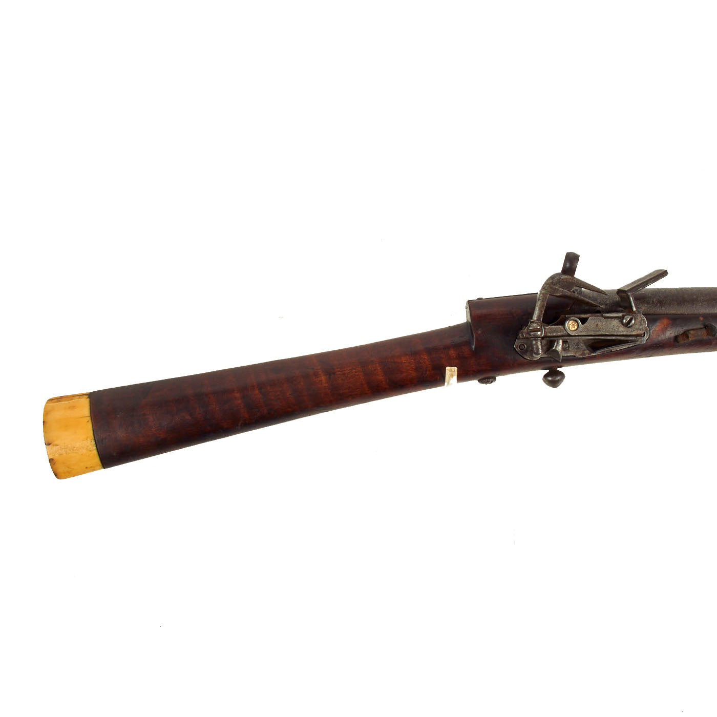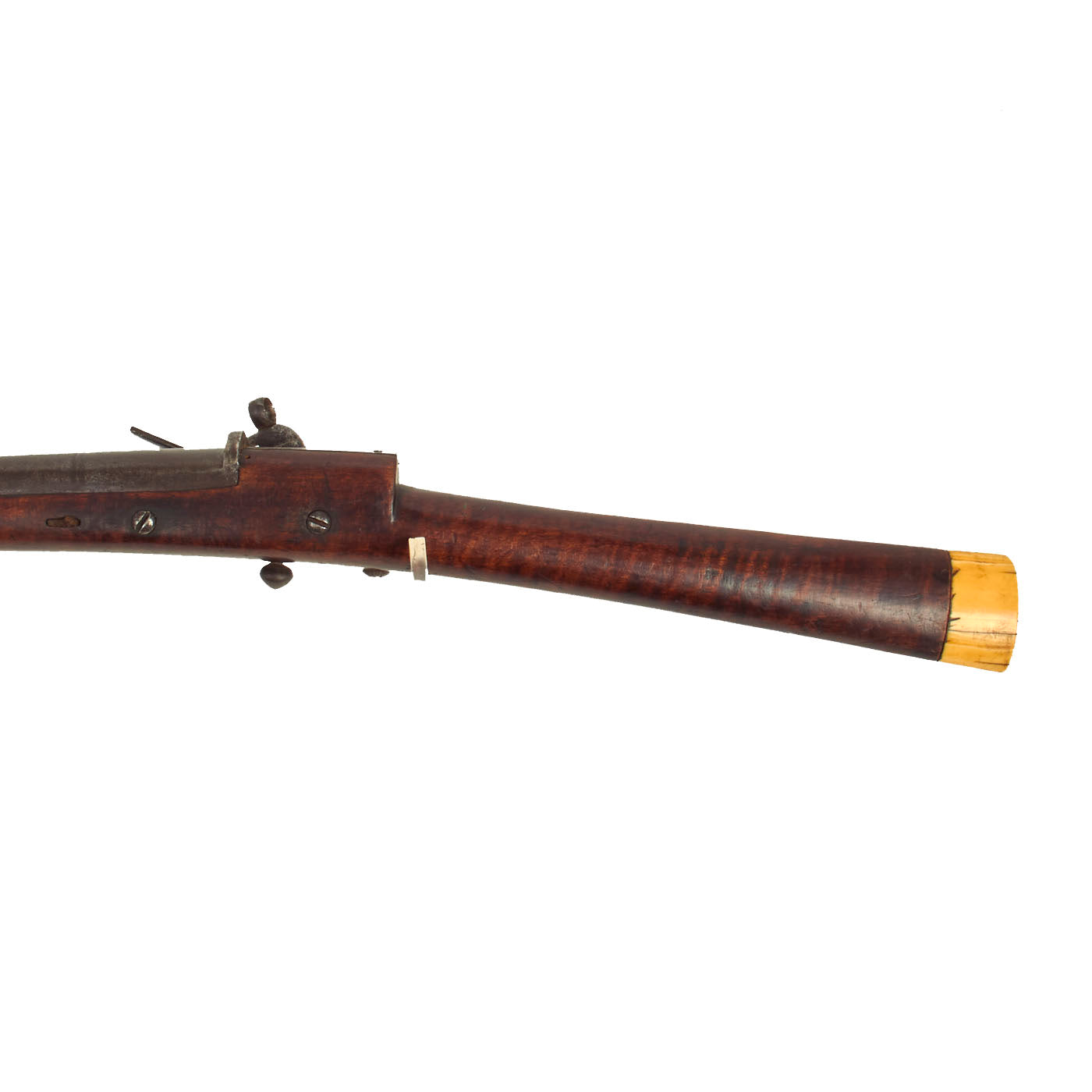 The stock is lovely, showing lovely "tiger" flame figuring from muzzle to butt. It looks like there was at one point some type of nose cap, but that is now missing. it also has a slot with a piece of leather in it, though we cannot tell if this is for some type of sling, or to attach the barrel to the stock. The butt of the gun bears a substantial 1 1/8 inch thick MARINE IVORY butt cap, which has a lovely matured yellow color.