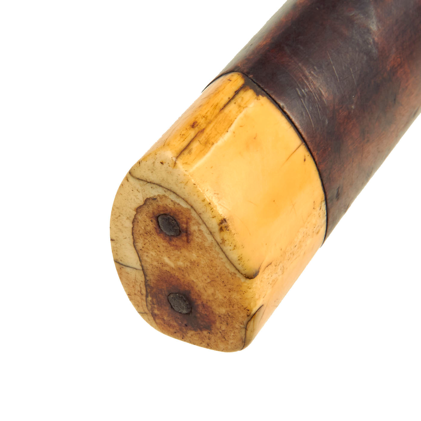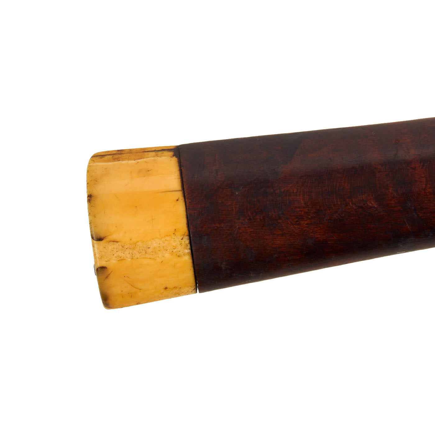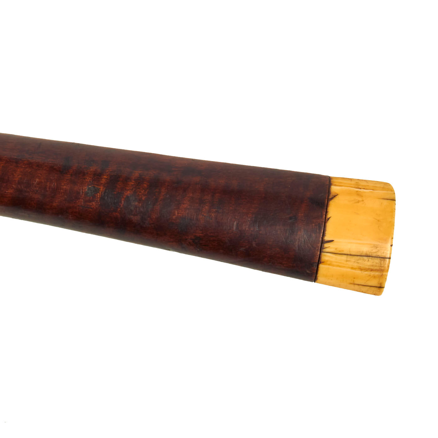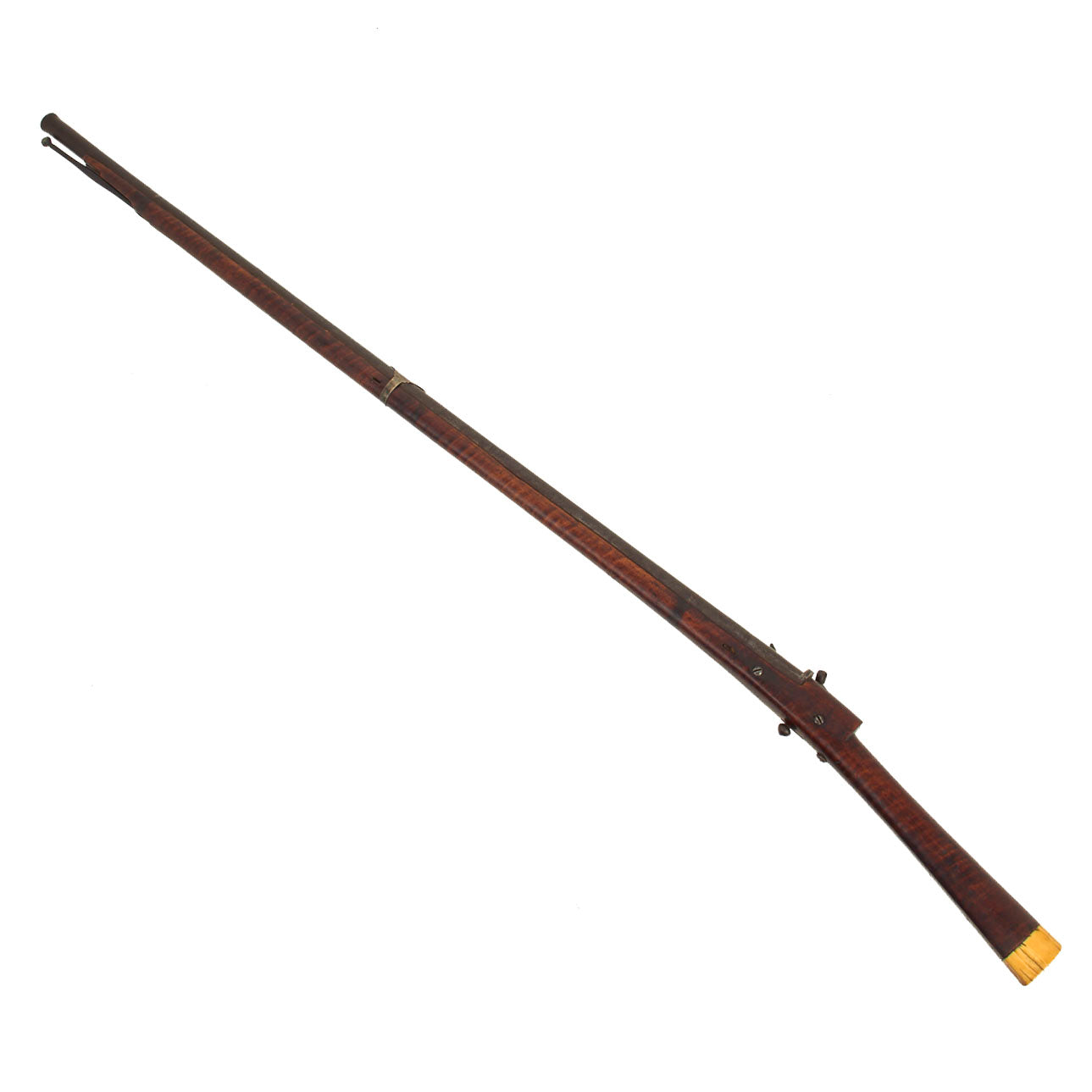 The stock is lovely, showing lovely "tiger" flame figuring from muzzle to butt. It looks like there was at one point some type of nose cap, but that is now missing. it also has a slot with a piece of leather in it, though we cannot tell if this is for some type of sling, or to attach the barrel to the stock. The butt of the gun bears a substantial 1 1/8 inch thick MARINE IVORY butt cap, which has a lovely matured yellow color.