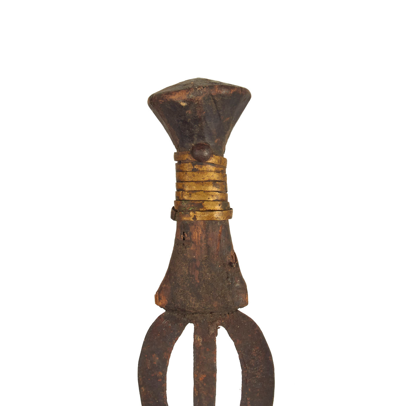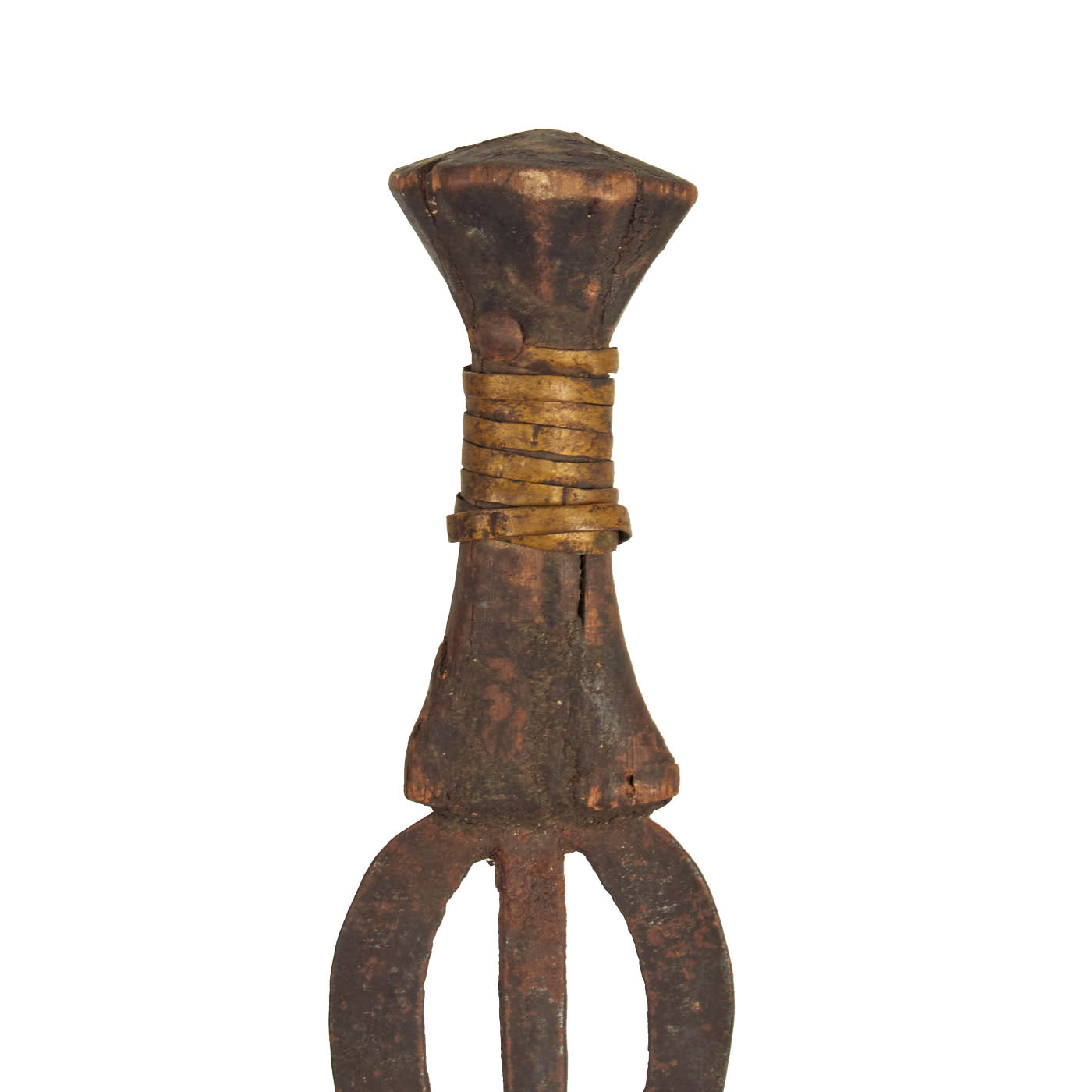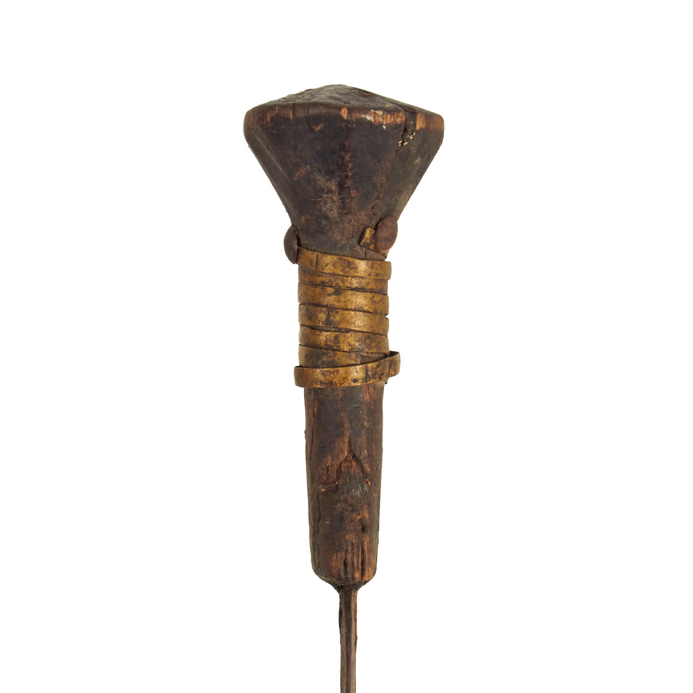 - Poto Ngombe Prestige Short Sword: These double edged forged iron blades existed in many different varieties. The Ngombe sword is a traditional sword or knife from Central Africa. Mainly the weapon is ascribed to the Ngombe but also to the Poto and Doko and partly to the Ndunga and Budja tribes. It is known by the local names ingonda and mopamba. The pommel of the handle would have been partially covered with fur, forming a pouch. The pouch is said to have contained magical substances that are supposed to protect the wearer. The handles are often wrapped with ribbons made of copper , brass or rattan. This example’s handle is partially wrapped with brass. Mainly used as a prestige object and a symbol of dignity for the chiefs.