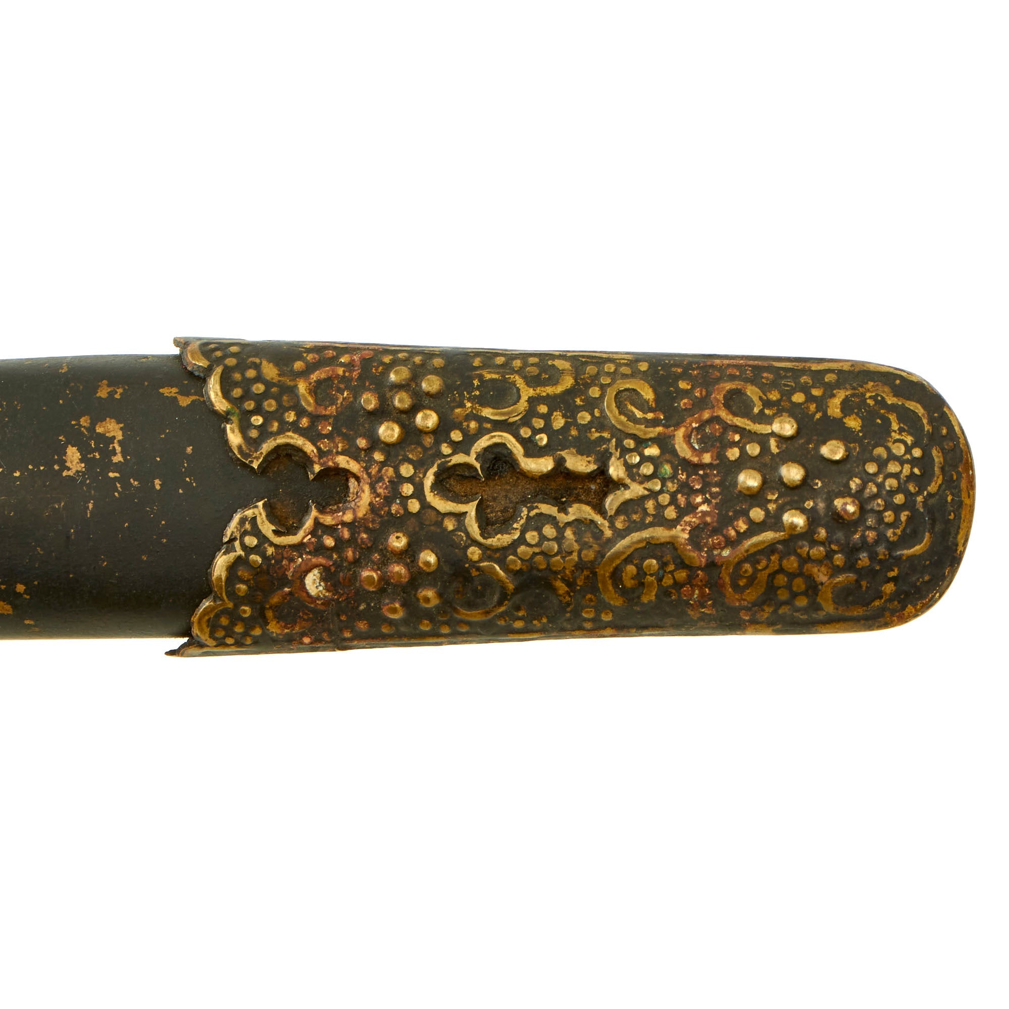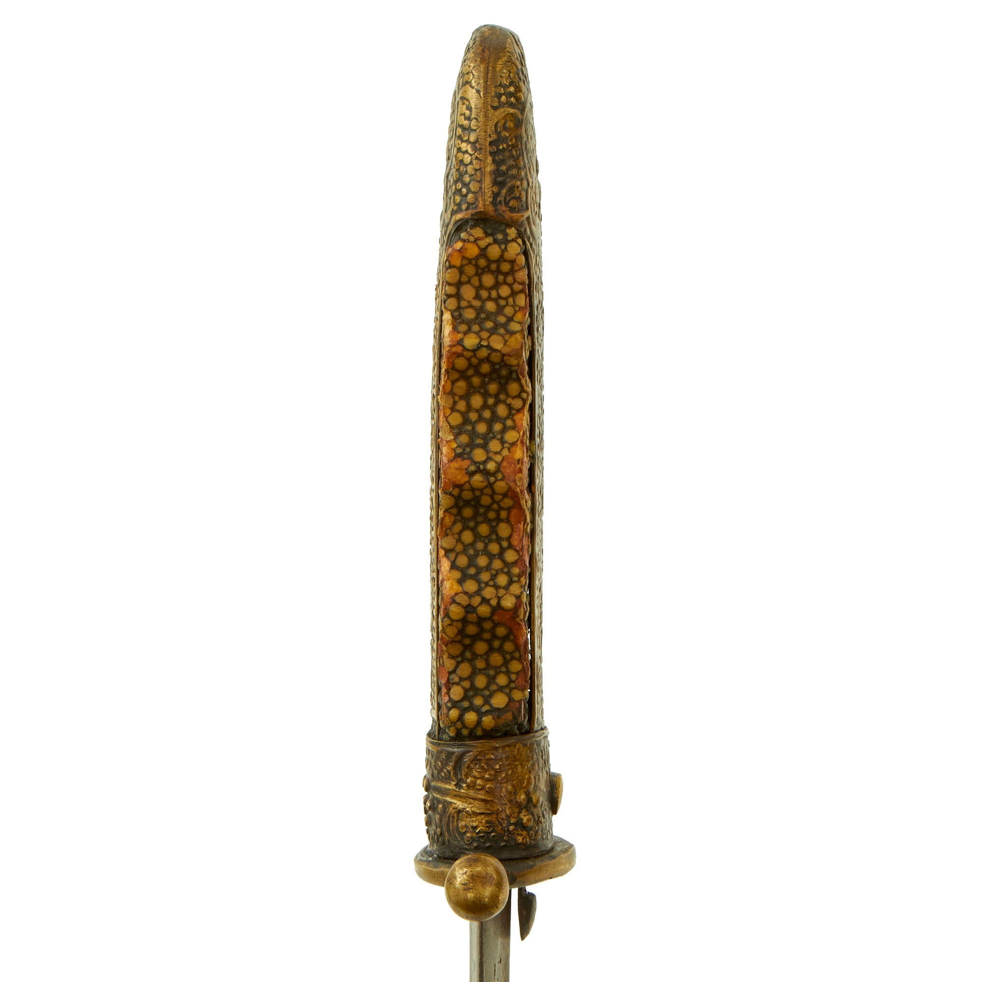 Gilt brass crossguard that sits tight against the adjoining ferrule, which is held in place with a single brass screw. It has a functional scabbard lock button, which releases the dagger. The handle is fabricated with a ray skin grip with decorative brass panels on each side, which come together at the pommel. These show multiple Chinese plum blossoms, a motif which is repeated on the pommel.