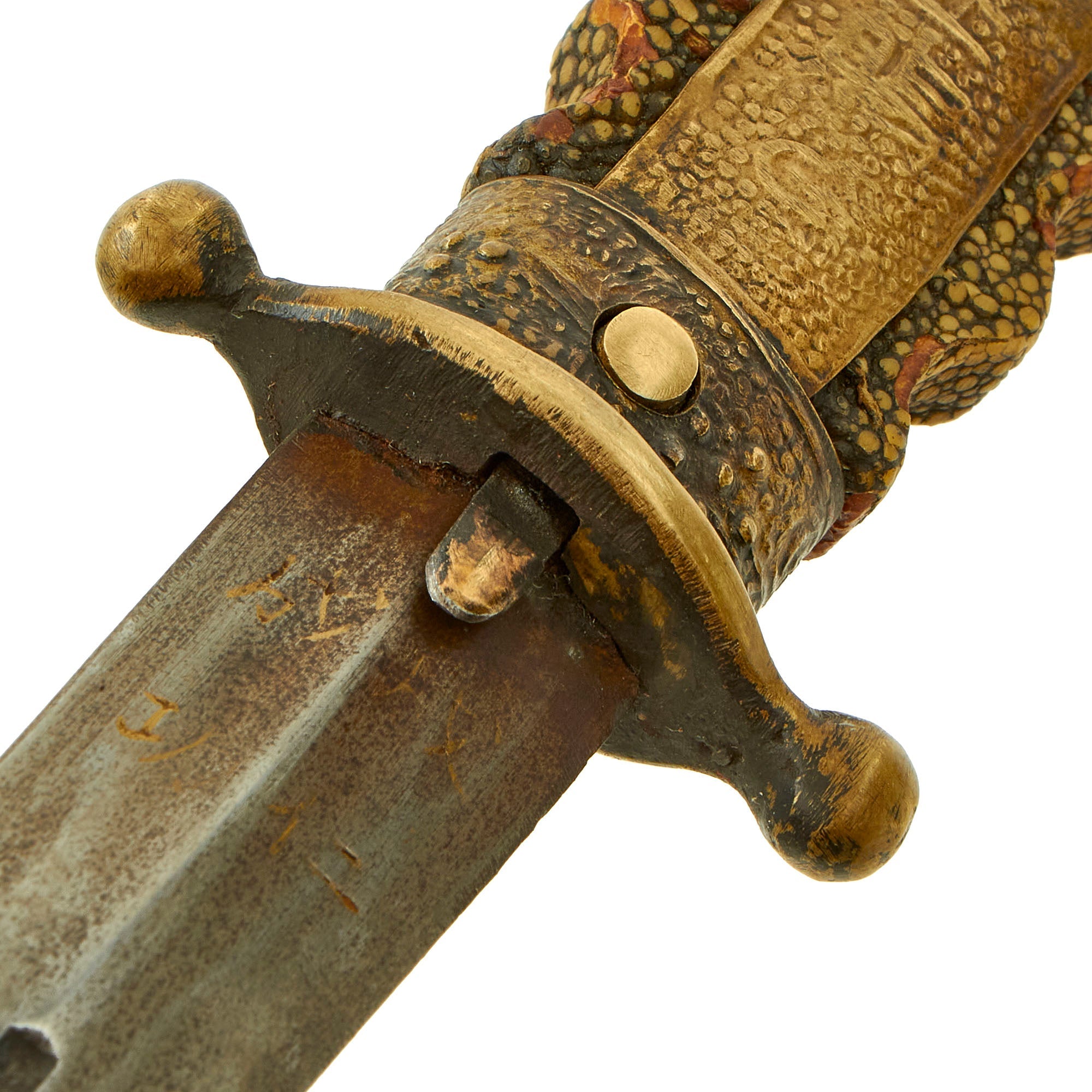 This is a example is very similar of the type of dress dagger that was approved for wear by officers of the Chinese National Revolutionary Army (國民革命軍) at the time of the Sino-Japanese war of 1937-1945. Often abbreviated as the NRA, the group was the military arm of the Kuomintang (KMT, or the Chinese Nationalist Party) from 1925 until 1947.