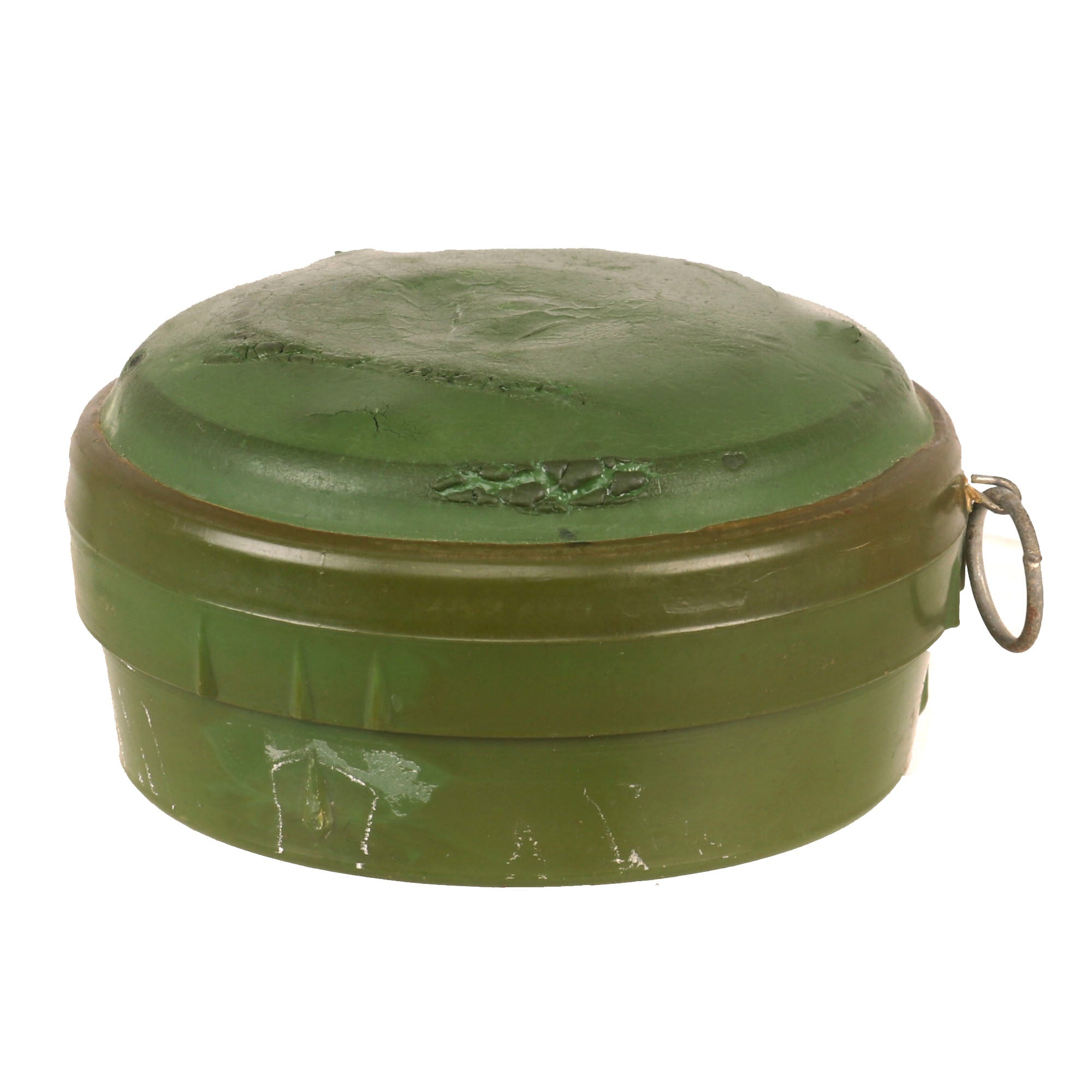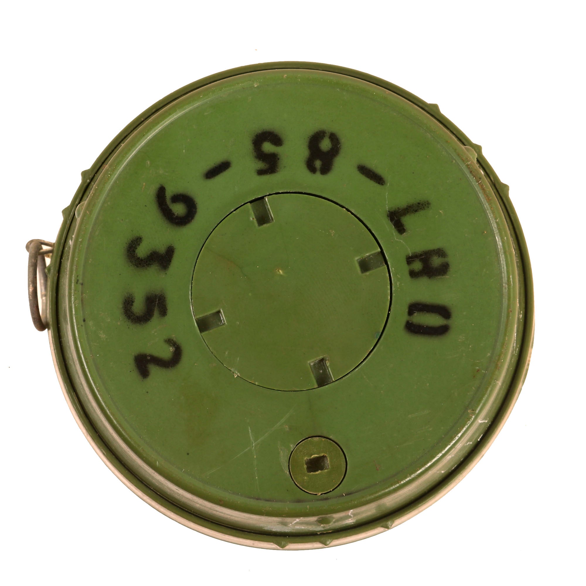 Original Item. Only One Available. The Type 72 anti-personnel blast mine is a small plastic mine made in China. It is known to have been used in Afghanistan, Angola, Cambodia, China, Eritrea, Iraq, Kurdistan, Kuwait, Lebanon, Mozambique, Namibia, Peru, Somalia, Sri Lanka, Sudan and Thailand. The mine is green with a green rubber inset on the top. This is a minimum-metal mine and can be very difficult to detect.This example is totally inert and is unable to be used as a destructive device. It is completely void of any explosive content and is in direct compliance with the current BATF standards governing ownership of inert ordnance. Not Available For Export.This is an interesting Chinese mine brought back during the War in Afghanistan. This example has a modern label wrapped around the body which could be removed. The bottom of the mine is marked 087-85-9352. It measures roughly 3” in diameter and 1⅝” tall.The rubber top of the mine has some cracks as shown along with some very small areas of dry rot. The top of the mine can be unscrewed to inspect the interior. There are two discs left inside, but all other internals appear to be gone. This is the first example of this mine we’ve offered.Comes ready for further research and display.The Type 72a is operated by applying pressure which causes a non-metallic belville spring to 'click-through'. A metal pin in the centre of the belville spring strikes a small aluminium cased pyrotechnic, which fires the detonator that is beneath it inside an RDX booster. The booster detonates and its shock-wave initiates the 50g TNT main charge in the mine.