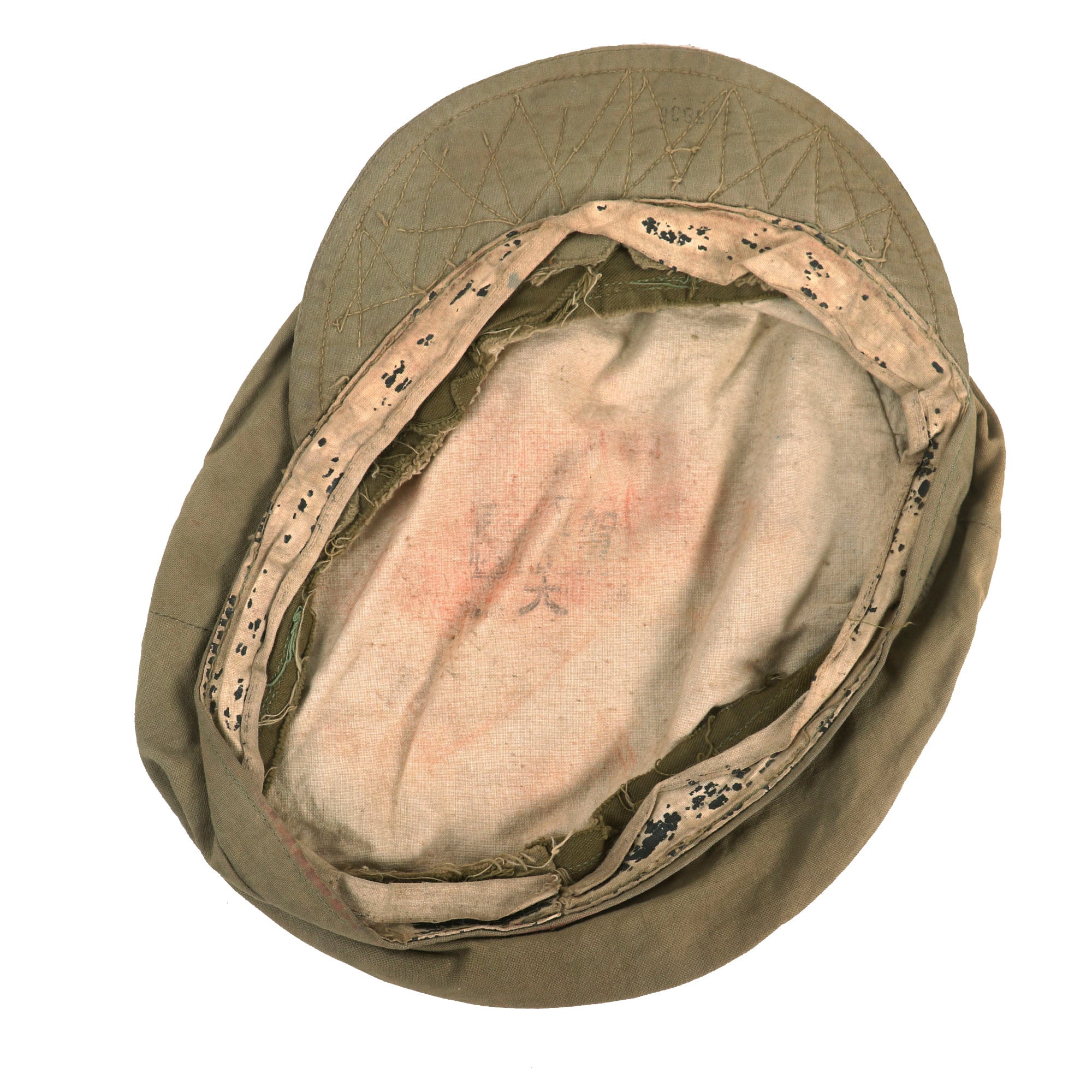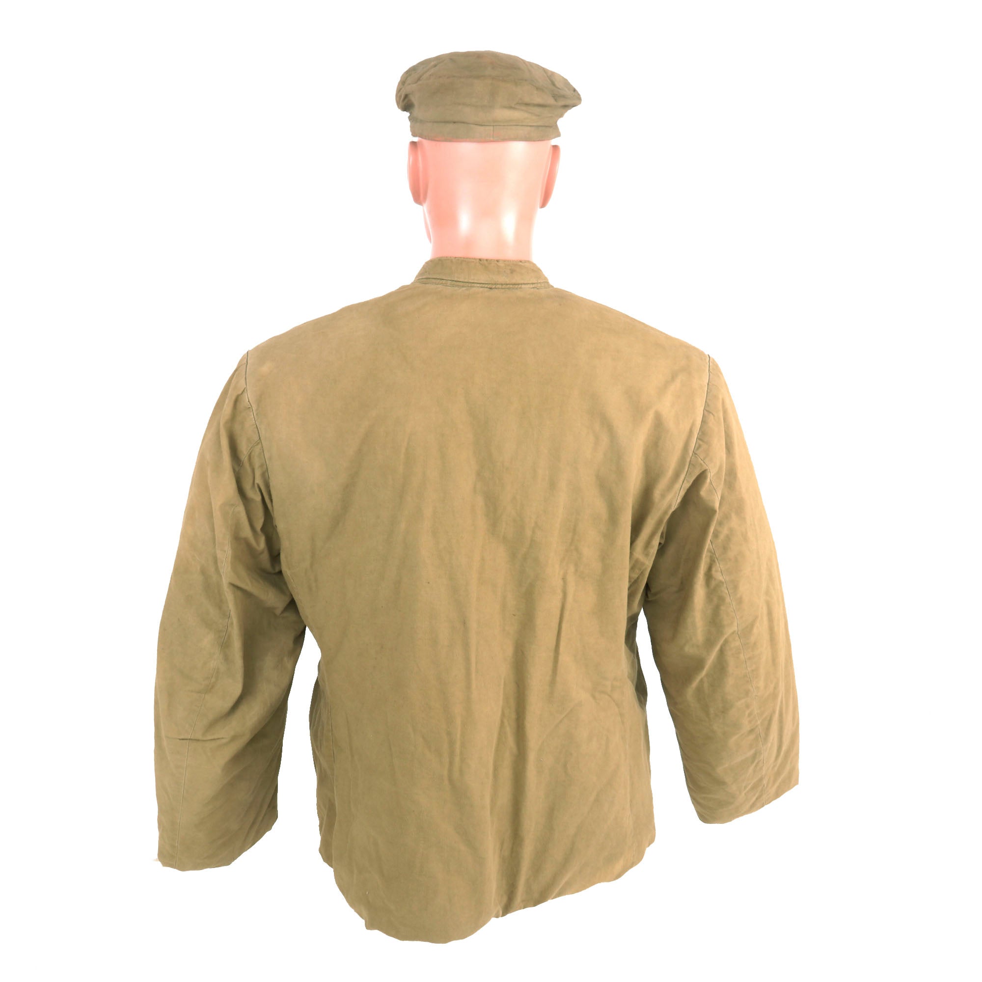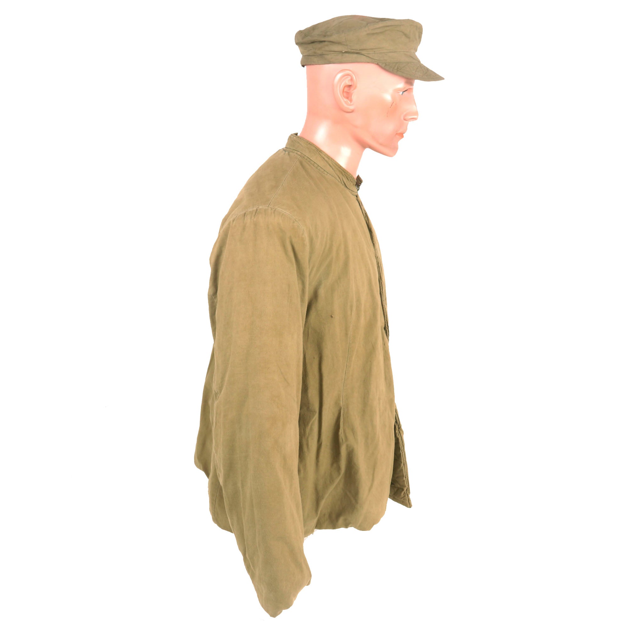 This is a fantastic example of a Chinese-manufactured padded jacket & summer field cap used by Chinese and Korean troops during the Korean War. The jacket has five large buttons on the front which are well-retained. There are no markings on the jacket we can find. This jacket is a great research project as there is likely a name written here.