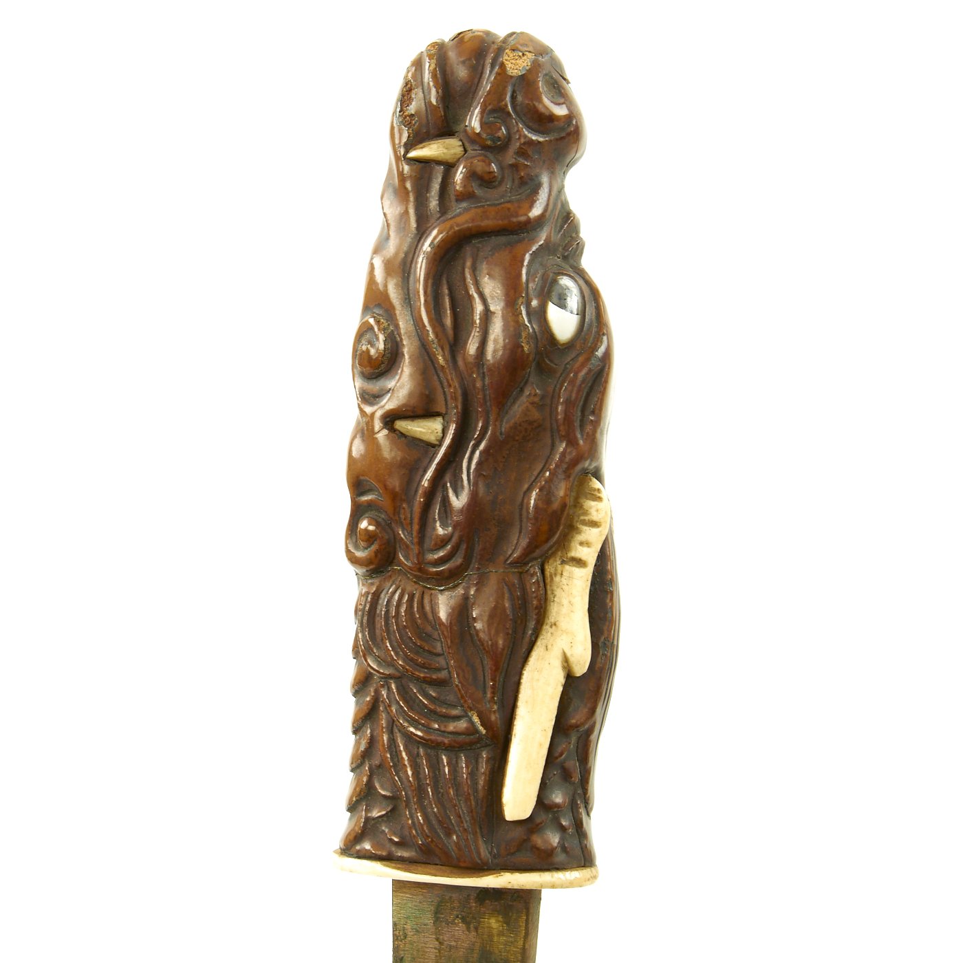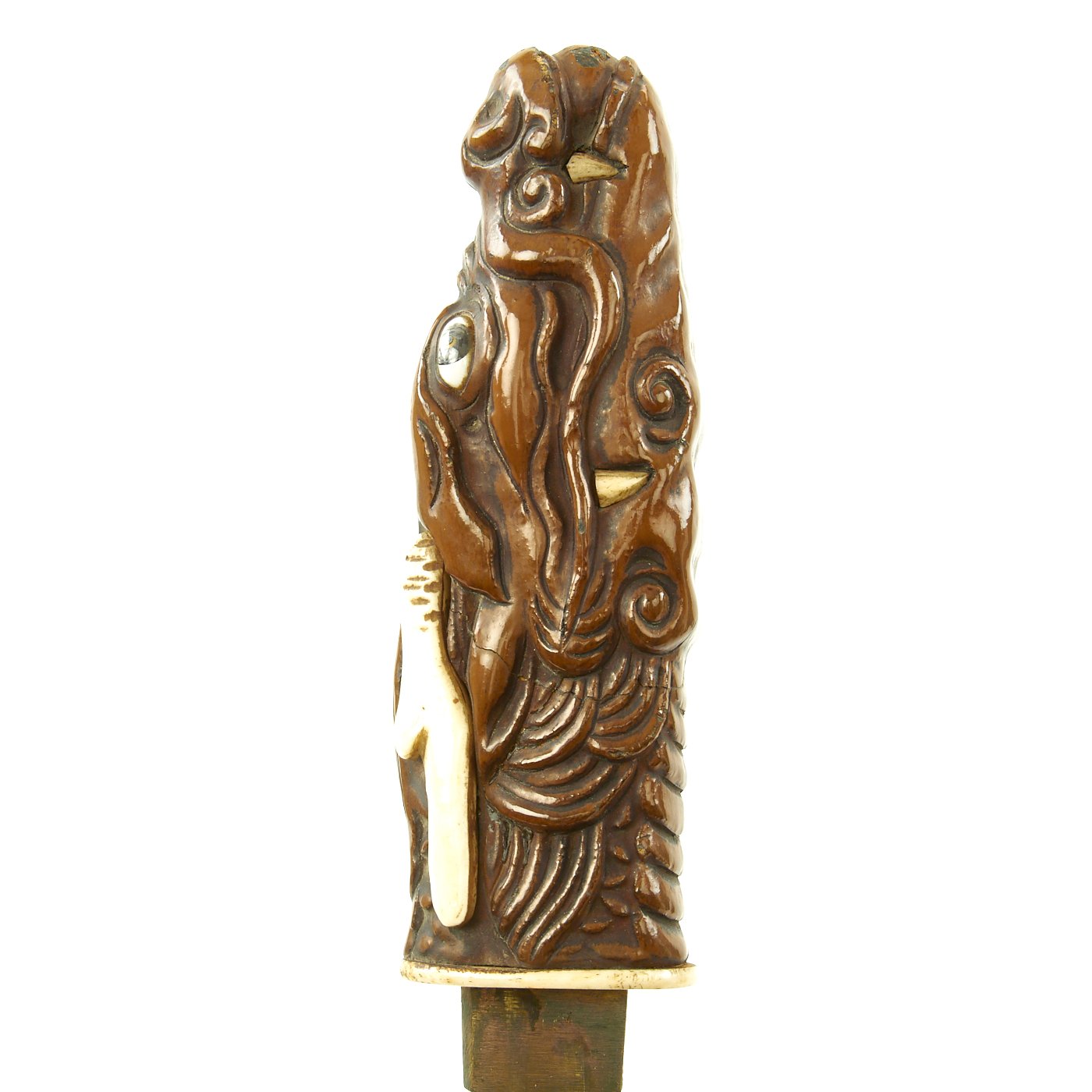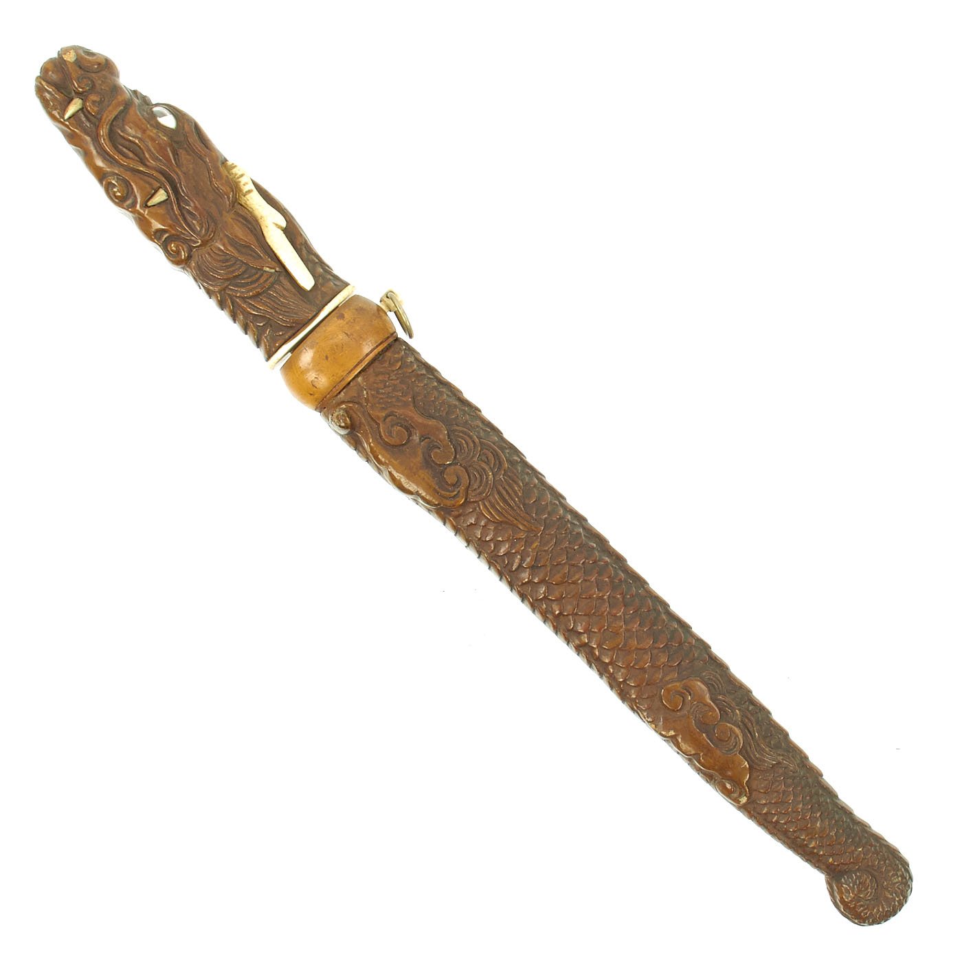 Original Item: Only One Available. We just received this lovely ornate Chinese short sword from the estate of a collector. It is really quite nice, with a beautiful hand carved Dragon handle and scabbard. It has a very nice 9 1/4 inch long Tanto-style single edged blade, made in the Japanese style with a faux temper line. The shot sword measures 15 1/2 inches overall, and is 18 inches long in the scabbard. The dragon's head is highlighted with some bone inlays as well as what look to be glass eyes. Truly a lovely piece!