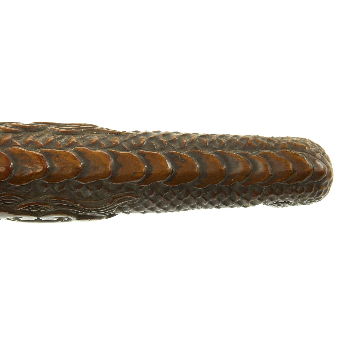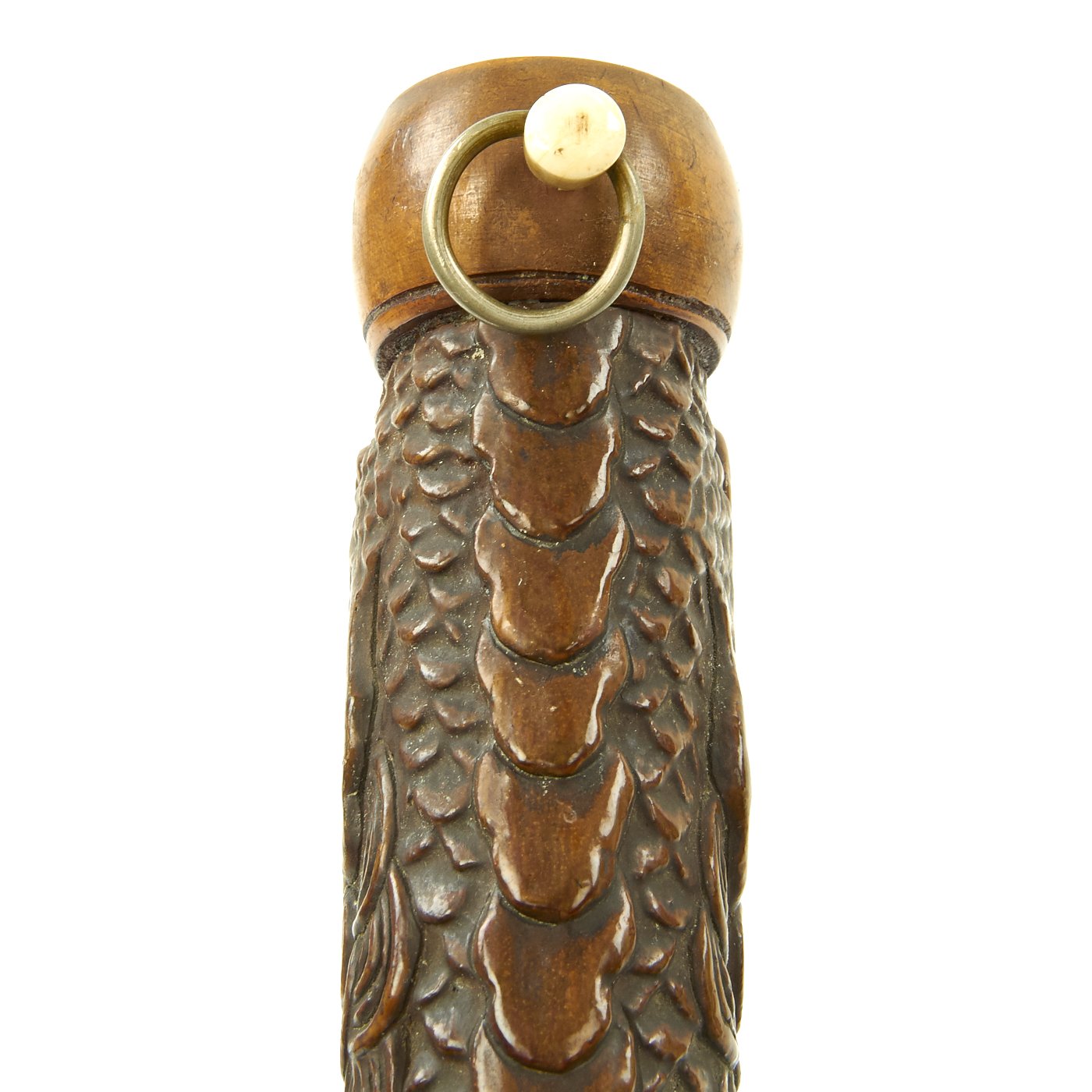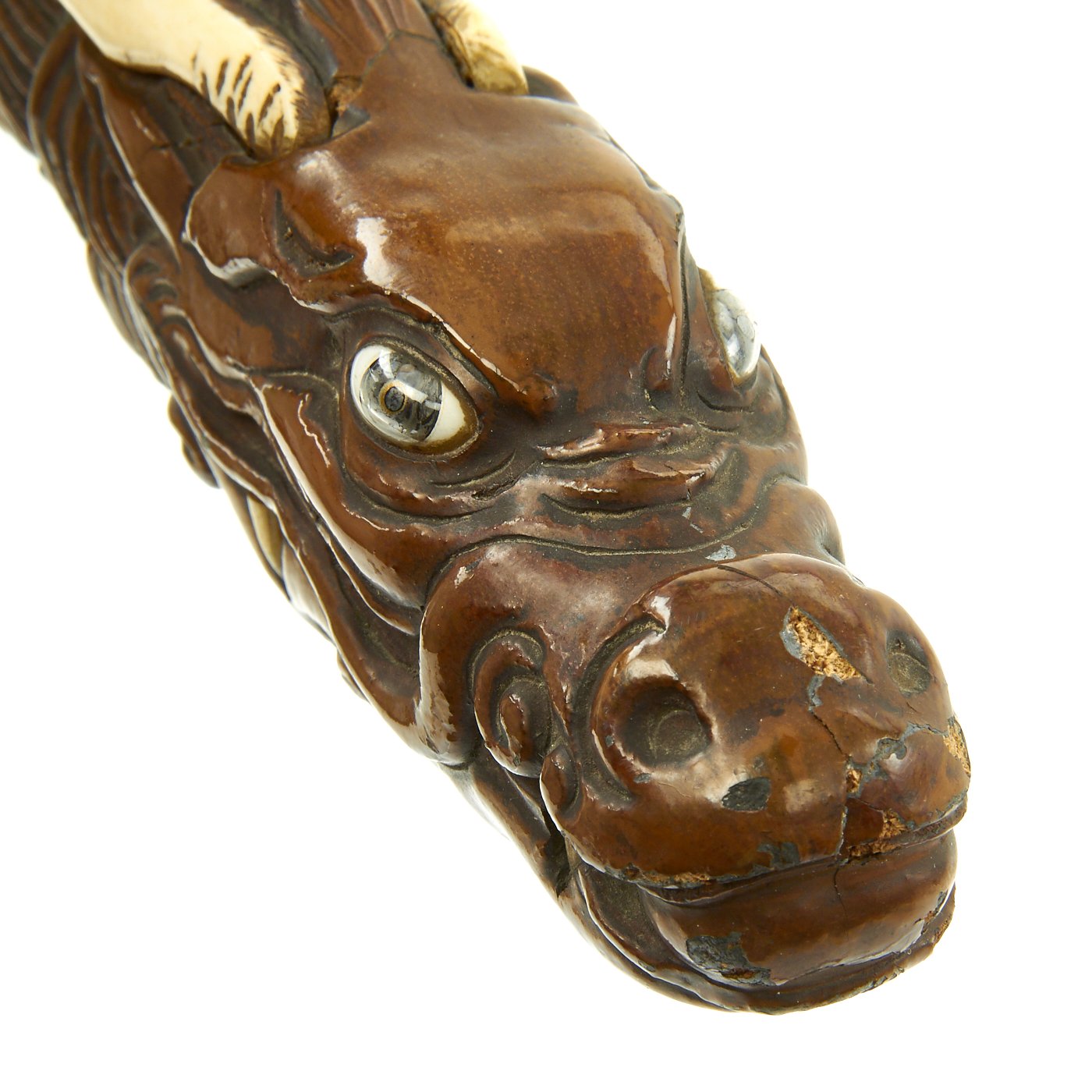 Original Item: Only One Available. We just received this lovely ornate Chinese short sword from the estate of a collector. It is really quite nice, with a beautiful hand carved Dragon handle and scabbard. It has a very nice 9 1/4 inch long Tanto-style single edged blade, made in the Japanese style with a faux temper line. The shot sword measures 15 1/2 inches overall, and is 18 inches long in the scabbard. The dragon's head is highlighted with some bone inlays as well as what look to be glass eyes. Truly a lovely piece!