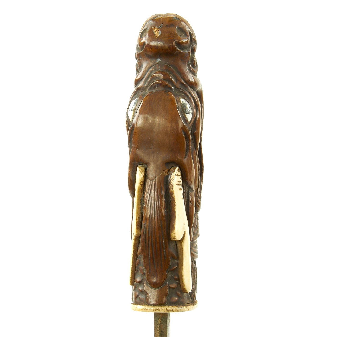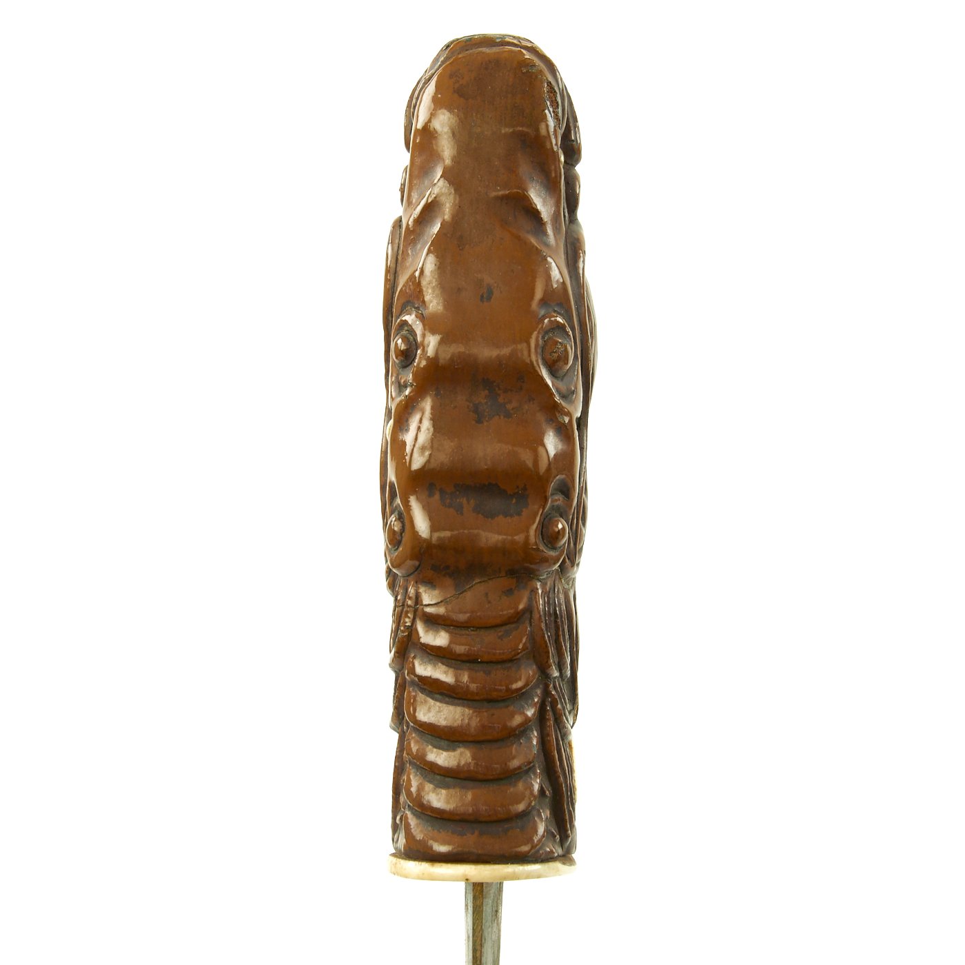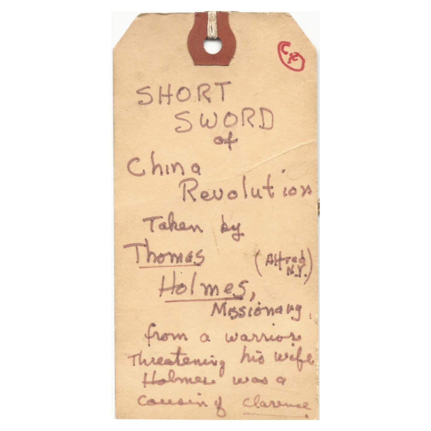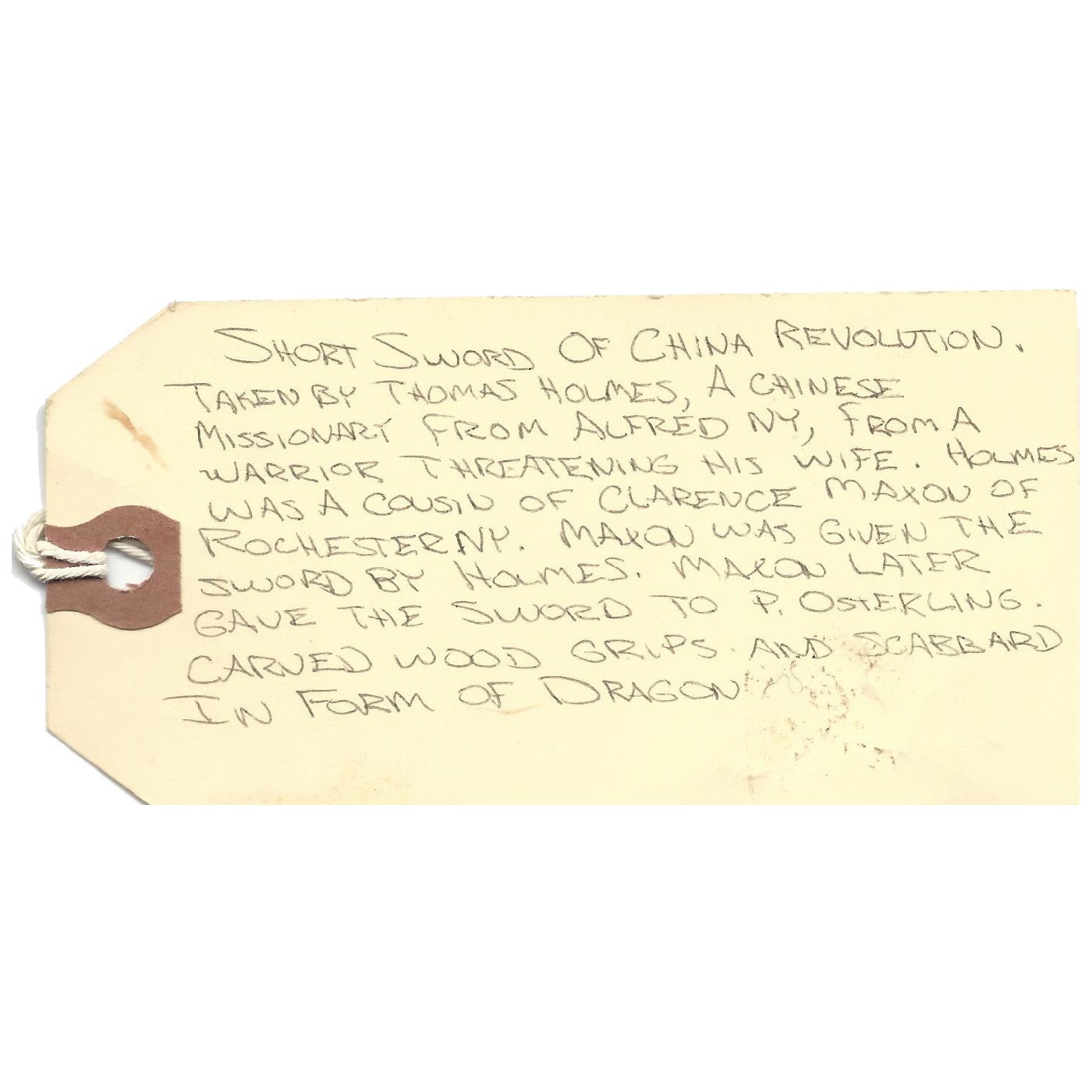 SHORT SWORD OF CHINA REVOLUTION. TAKEN BY THOMAS HOMES, A CHINESE MISSIONARY FROM ALFRED NY, FROM A WARRIOR THREATENING HIS WIFE. HOMES WAS A COUSIN OF CLARENCE MAXON OF ROCHESTER NY. MAXON WAS GIVEN THE SWORD BY HOLMES. MAXON LATER GAVE THE SWORD TO P OSTERLING. CARVED WOOD GRIPS AND SCABBARD IN FORM OF DRAGON.