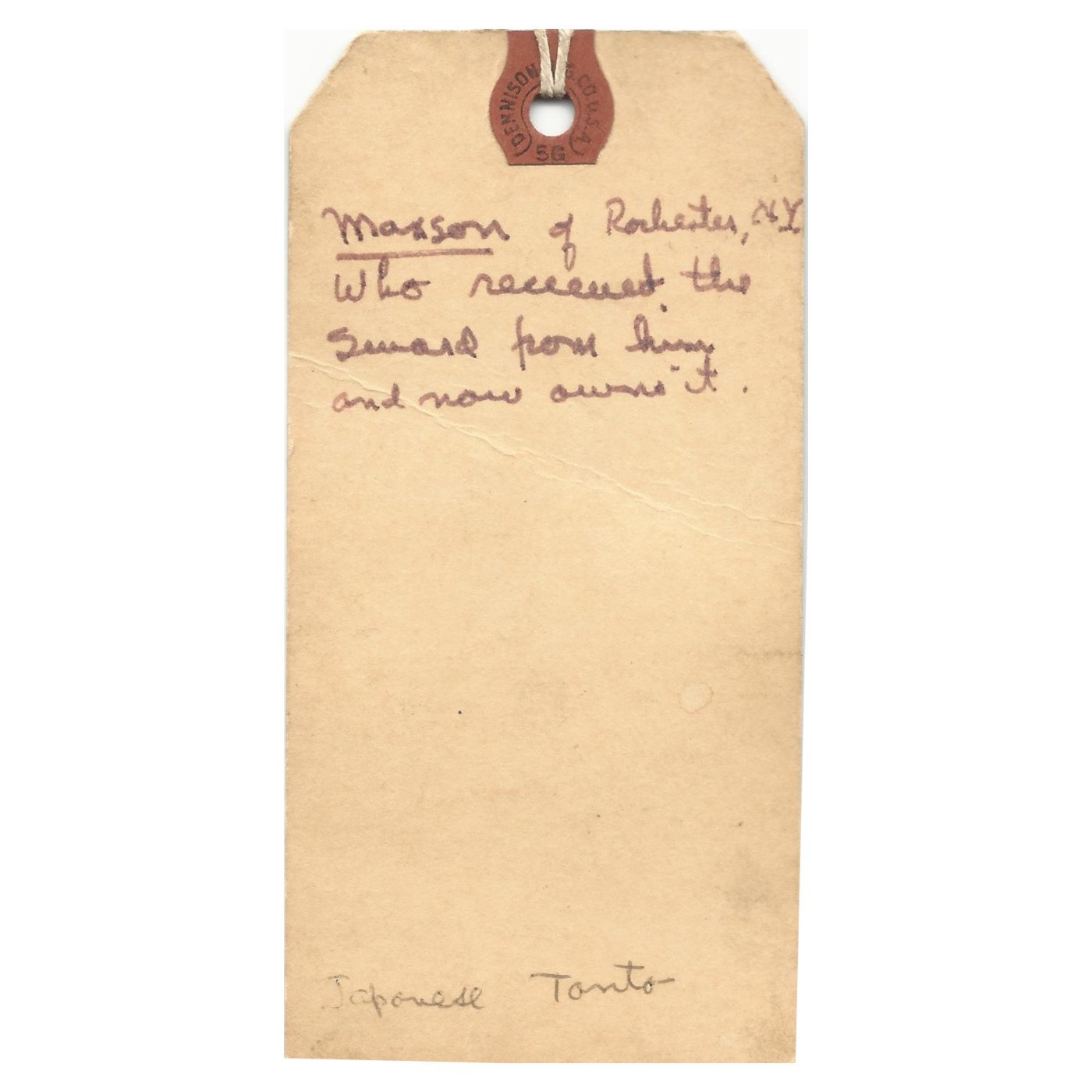 What makes it even more interesting though is the story that comes with it. Per the tag attached to the sword, it was brought back during the Chinese revolution by a missionary, who took it from a warrior threatening his life:
