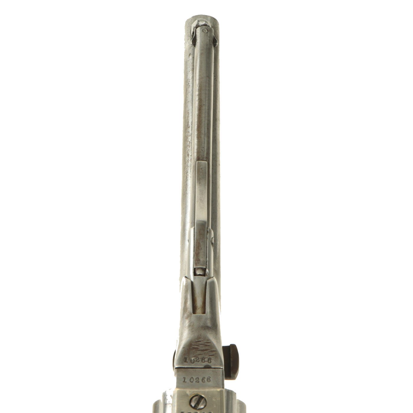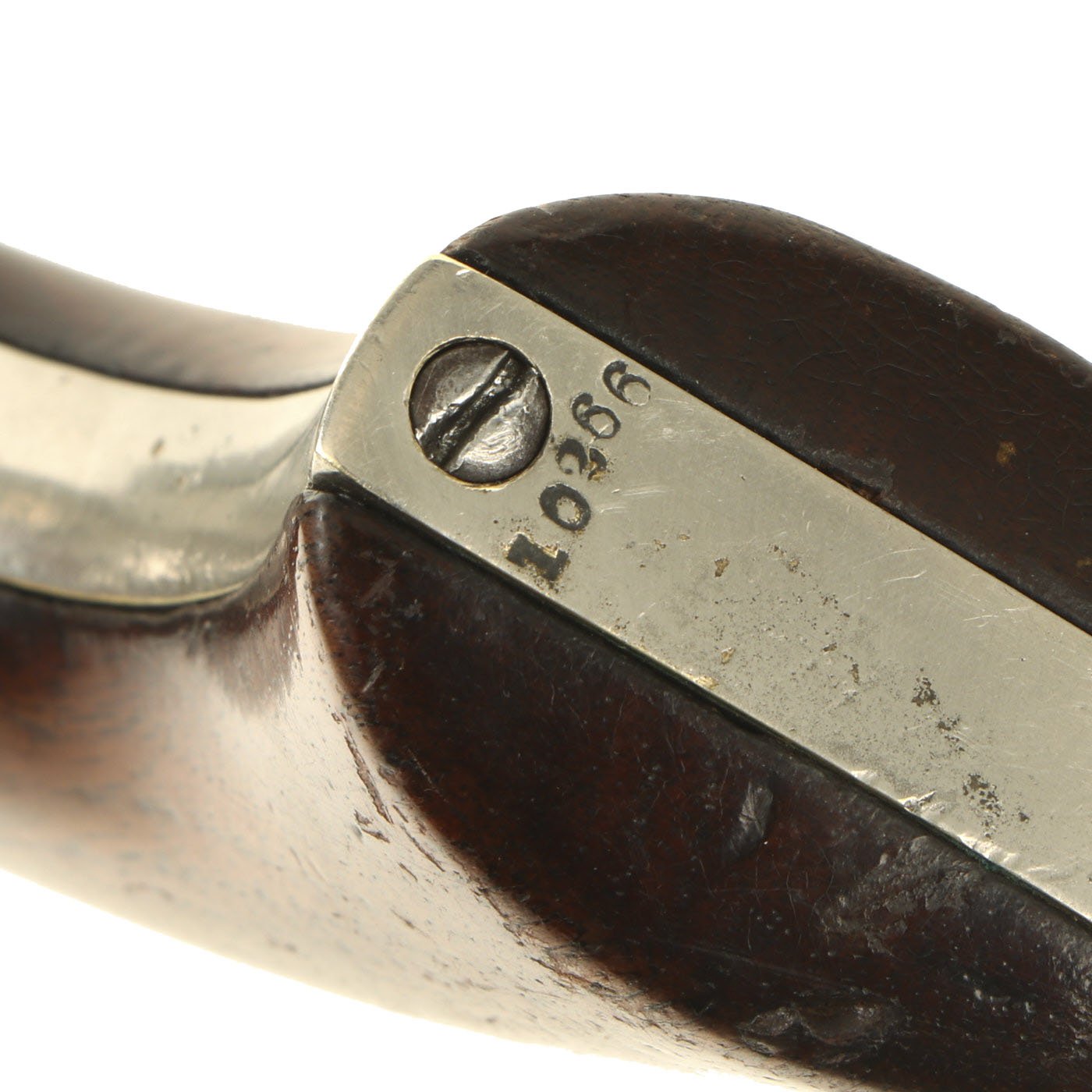 This very nice example is in choice condition, and has matching serial number 10266 on most parts, including the barrel, frame, grip frame, trigger guard, and the rear of the cylinder! The cylinder axis pin is marked with shortened serial number 0266, which makes this a great "ALL MATCHING" example! This indicates production in 1862, according to Colt firearms records, so it was made right at the beginning of the Civil War, and most likely was used during the conflict. The cylinder still has the original PAT SEPT 10th 1853 marking, and the frame is correctly marked COLTS PATENT. The trigger guard is marked with the usual caliber marking of 36 CAL.