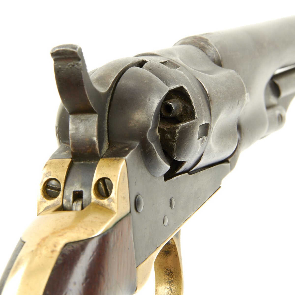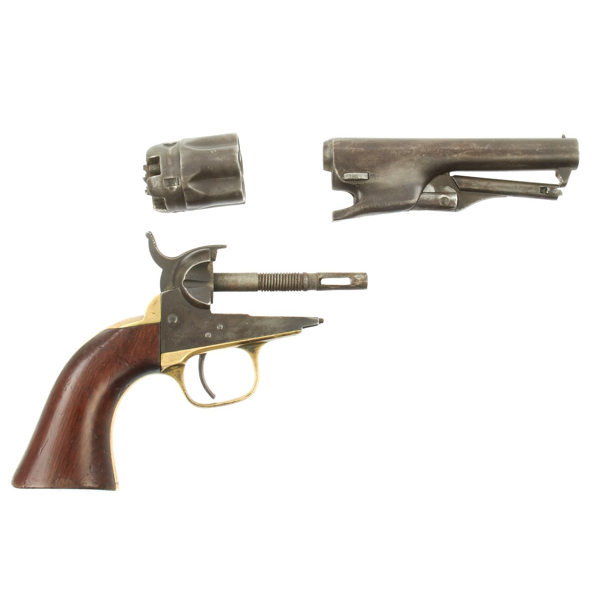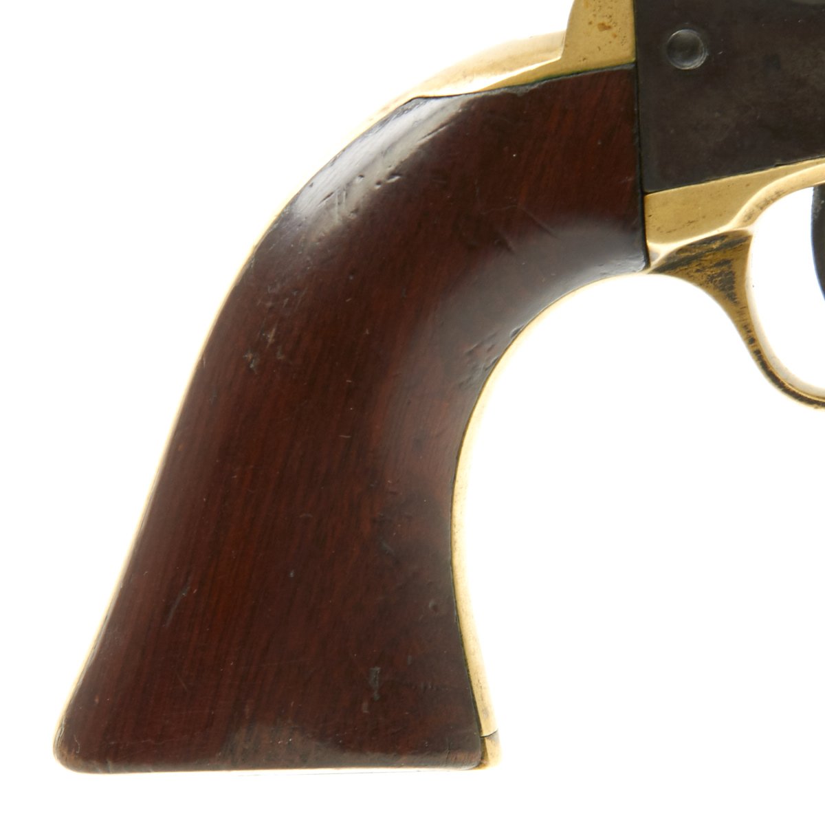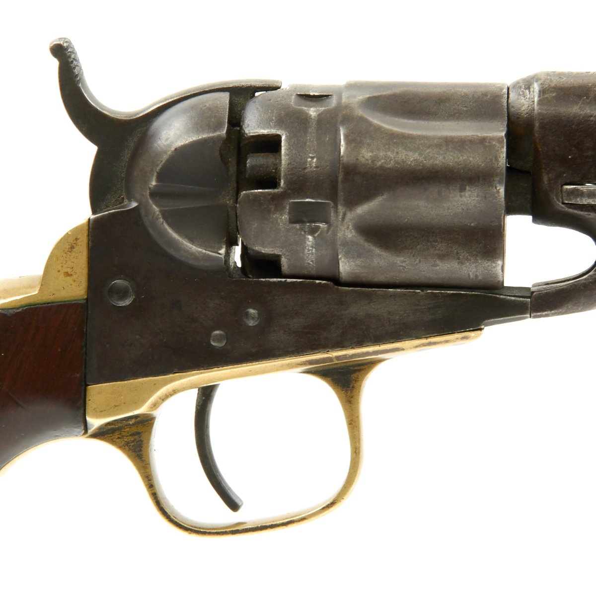 The revolver not only looks great but it is in tight fully functional condition, though as with any gun this age, it can be finicky. The pistol metalwork retains much Blue, brass trigger guard and grip frame have a great patina, and the walnut grips are still very nice and crisp.