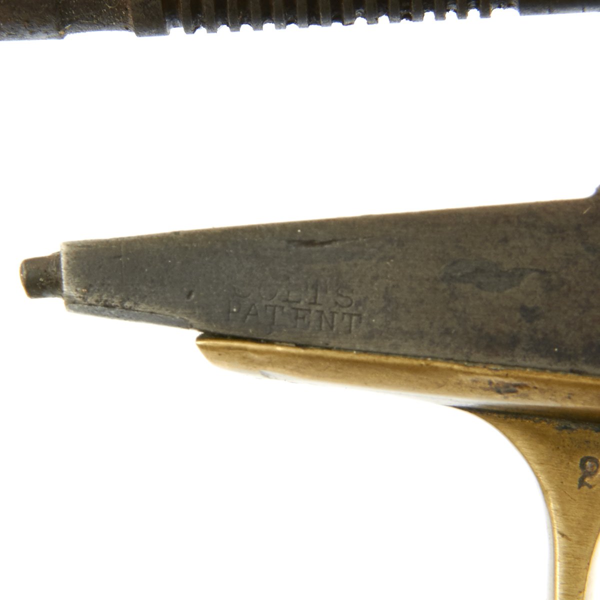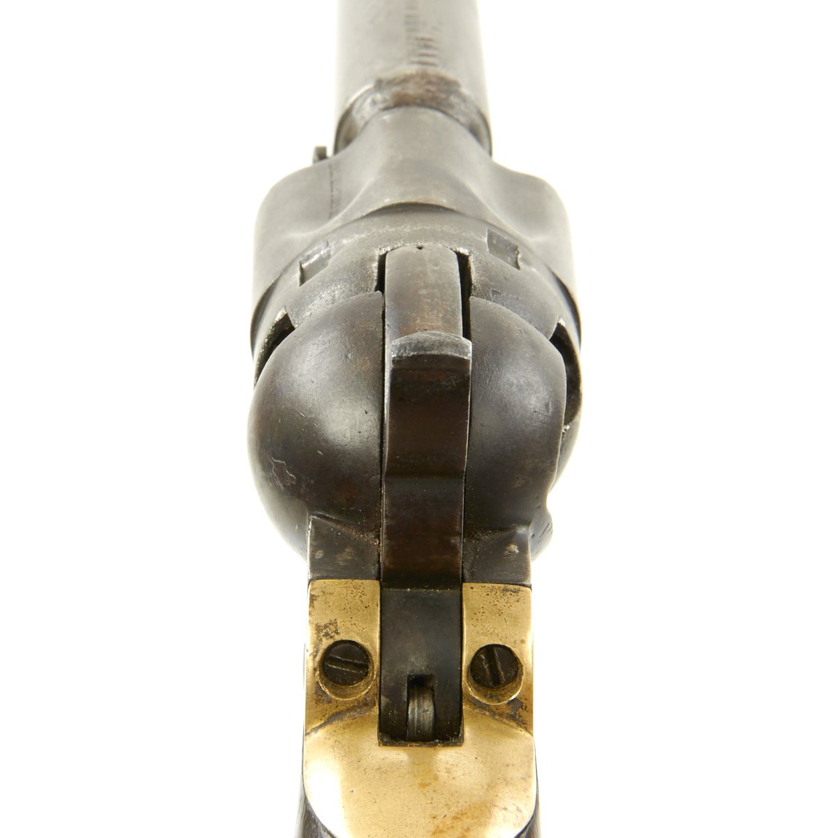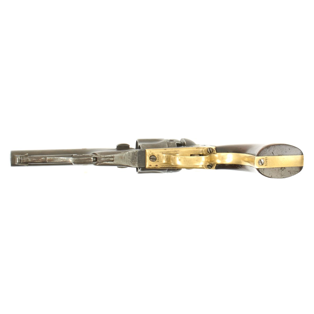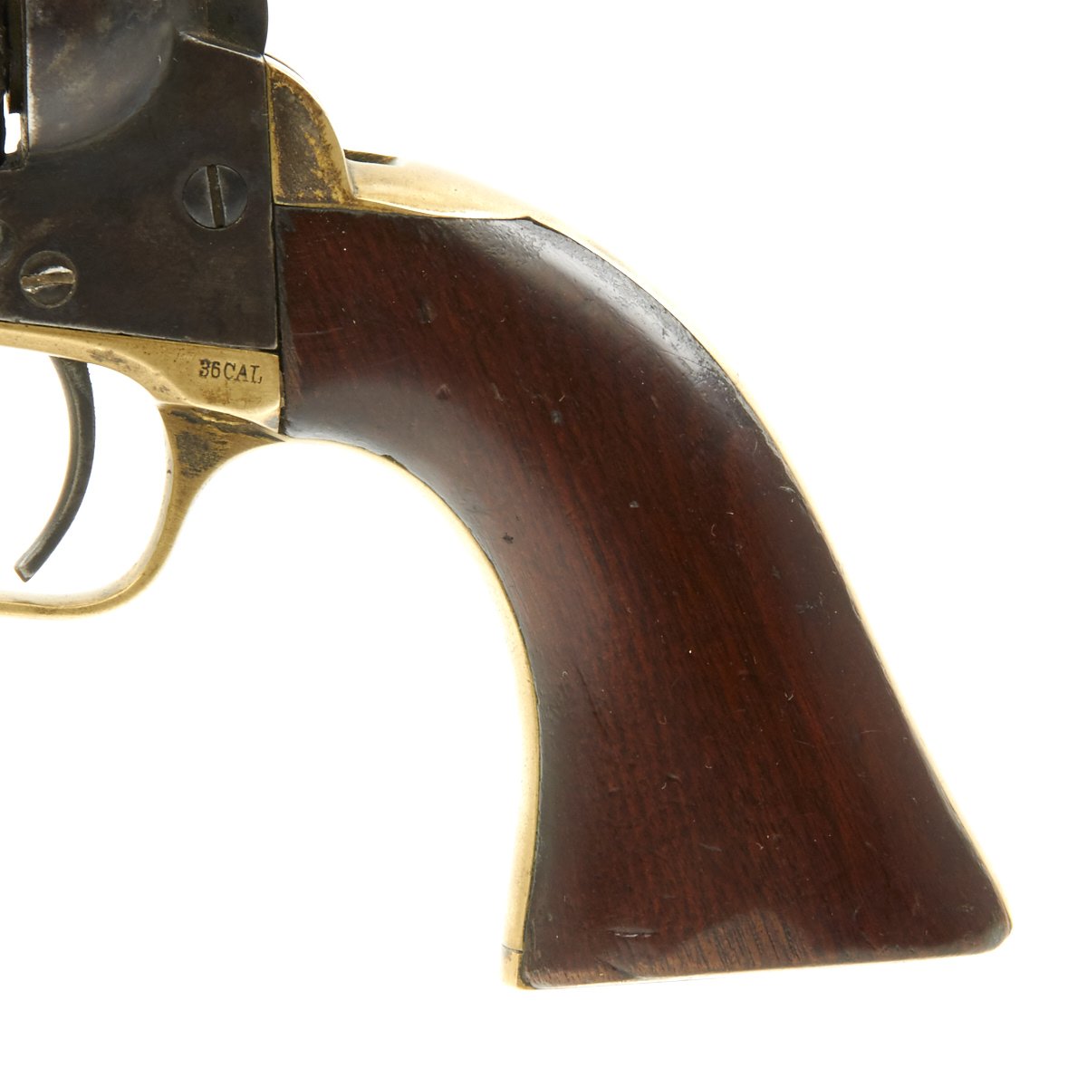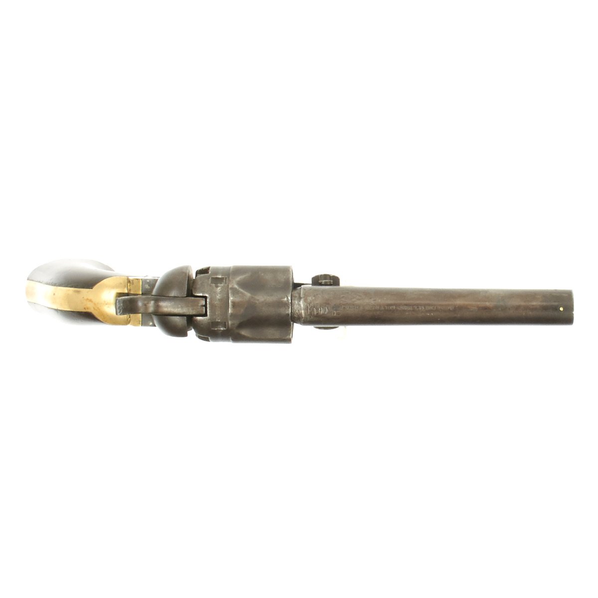 The revolver not only looks great but it is in tight fully functional condition, though as with any gun this age, it can be finicky. The pistol metalwork retains much Blue, brass trigger guard and grip frame have a great patina, and the walnut grips are still very nice and crisp.