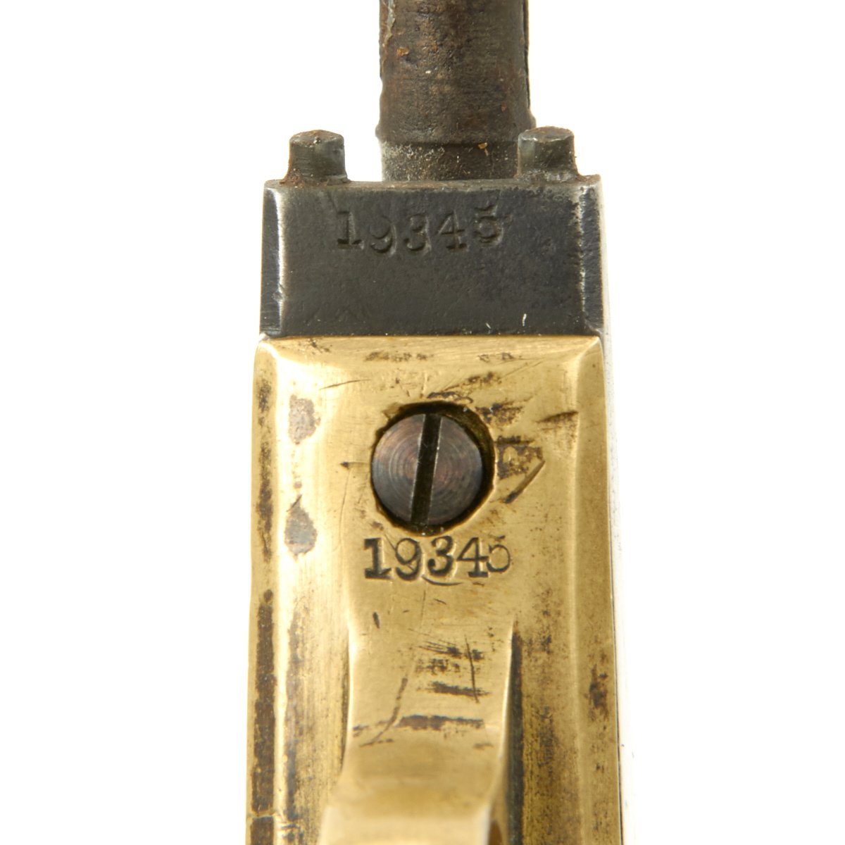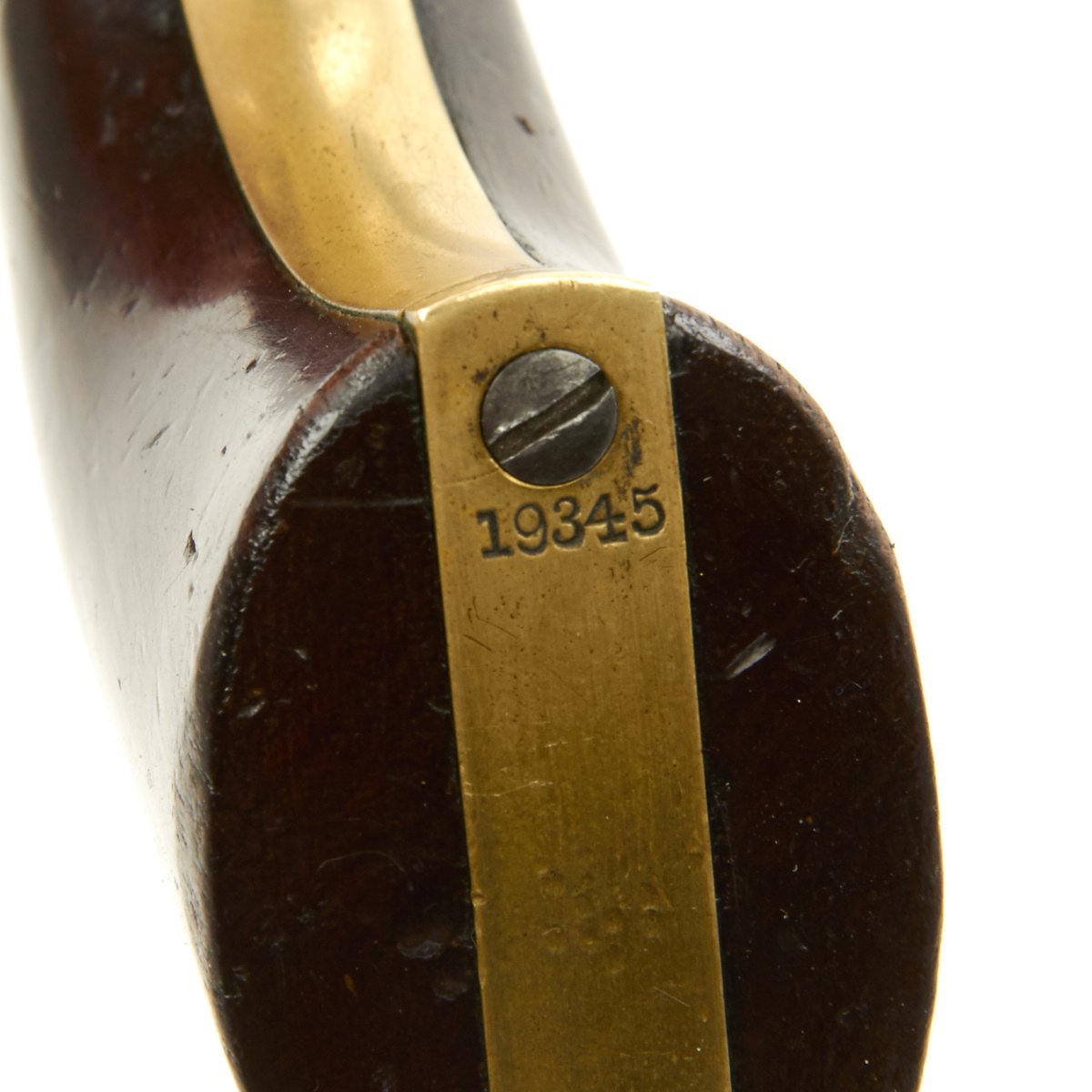 This very nice example is in choice condition, and has matching serial number 19345 on all parts including barrel, frame, grip, barrel wedge, and trigger guard! This indicates production in 1863, according to Colt firearms records. The fluted cylinder did not really have a good location for the serial number, though it is still marked with the patent markings, as does the frame. The trigger guard is marked with the usual caliber marking of 36 CAL.
