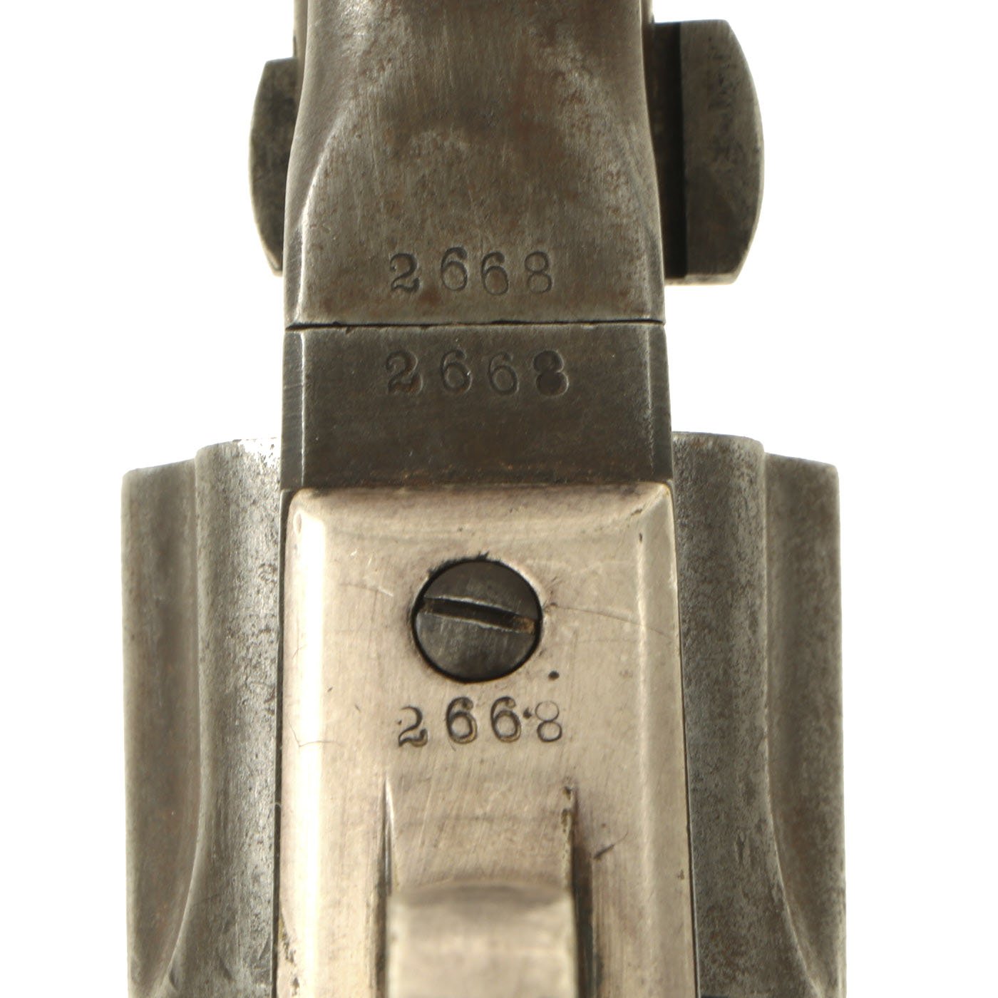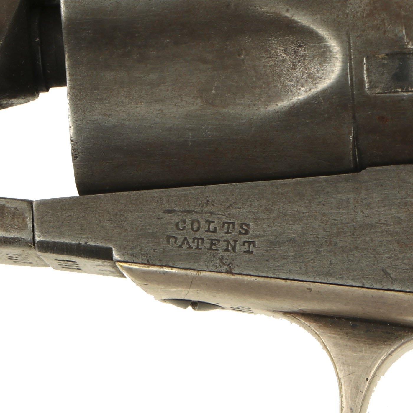 This very nice example is in choice condition, and has matching serial number 2668 on most parts, including the barrel, frame, grip, cylinder, cylinder axis pin, and trigger guard! Only the barrel wedge is non matching replacement from another revolver. The serial number indicates production in 1861, according to Colt firearms records, even though this is a model 1862, as production started in 1861. The revolver made right at the beginning of the Civil War, and most likely was used during the conflict. The cylinder still has the original PAT SEPT 10th 1853 marking, and the frame is correctly marked COLTS PATENT.