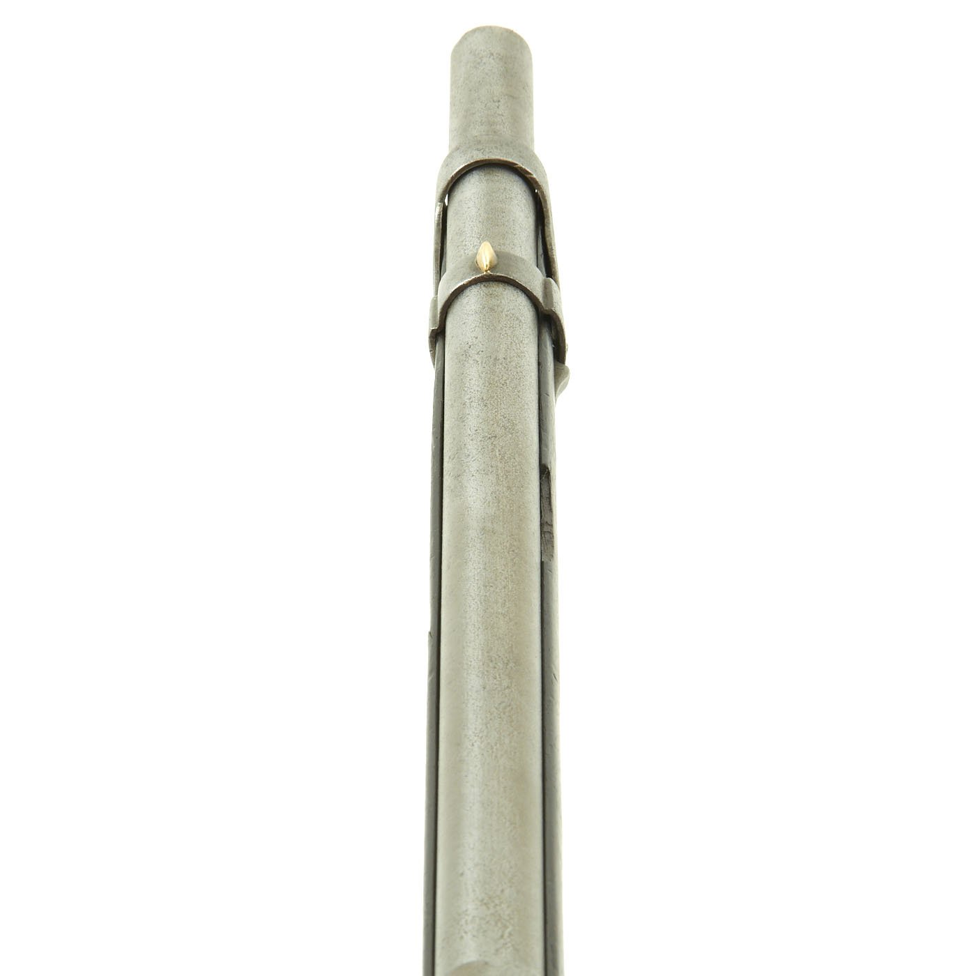The stock does still have traces of a cartouche on the right side, which appears to show a 1834 date. The butt plate is also marked 3871 / 1838, but we do not know if this is a date, or just a serial number. There are a few proof marks still visible on the barrel and lock, but they are unclear. Condition is quite nice, with a solid stock, which still retains the cheek cut-out on the left side. The metal work is a nice aged and polished steel, with a dull light gray patina. The bore is clear, and still shows rifling, though there is also oxidation and powder fouling. The lock functions correctly, holding at half cock and firing at full.