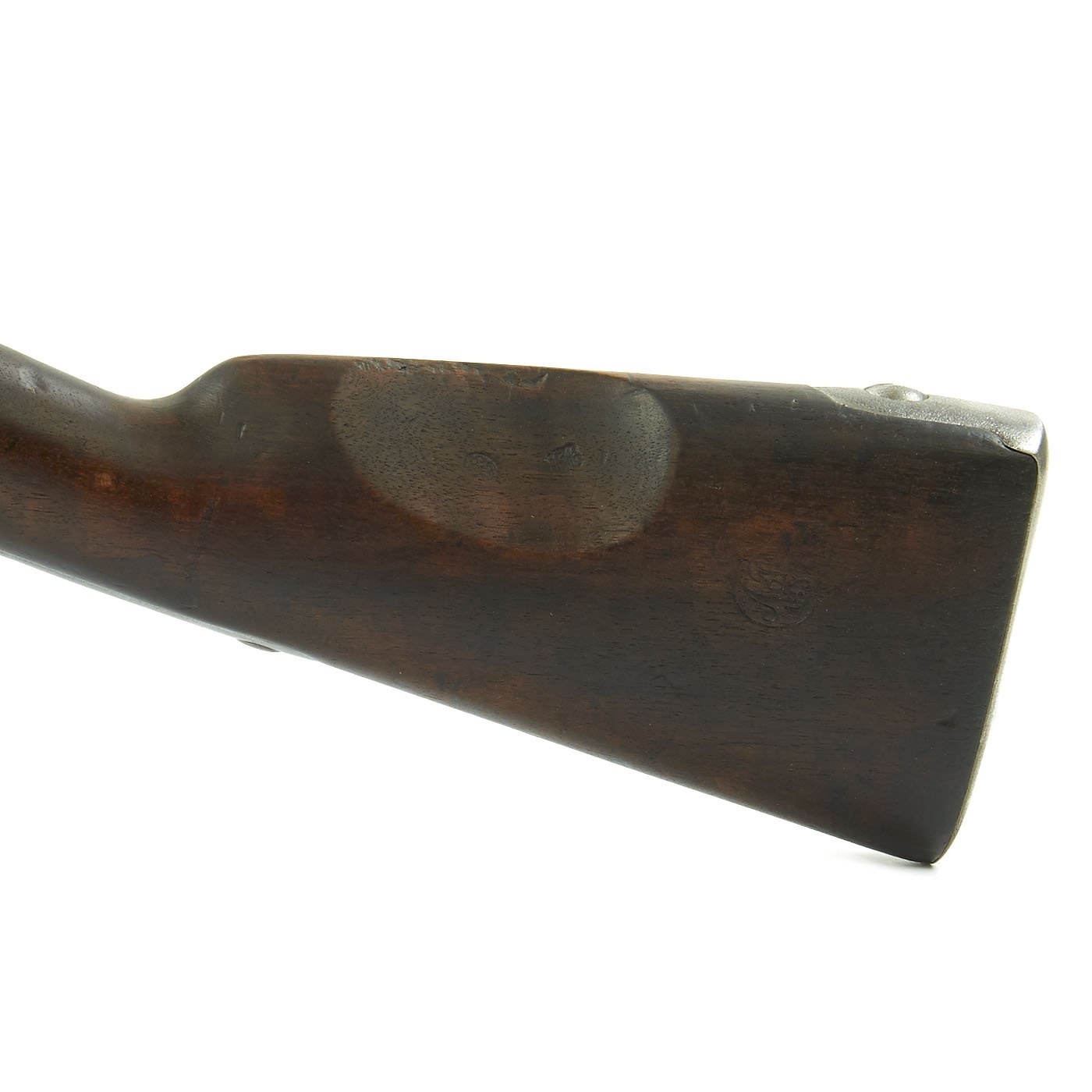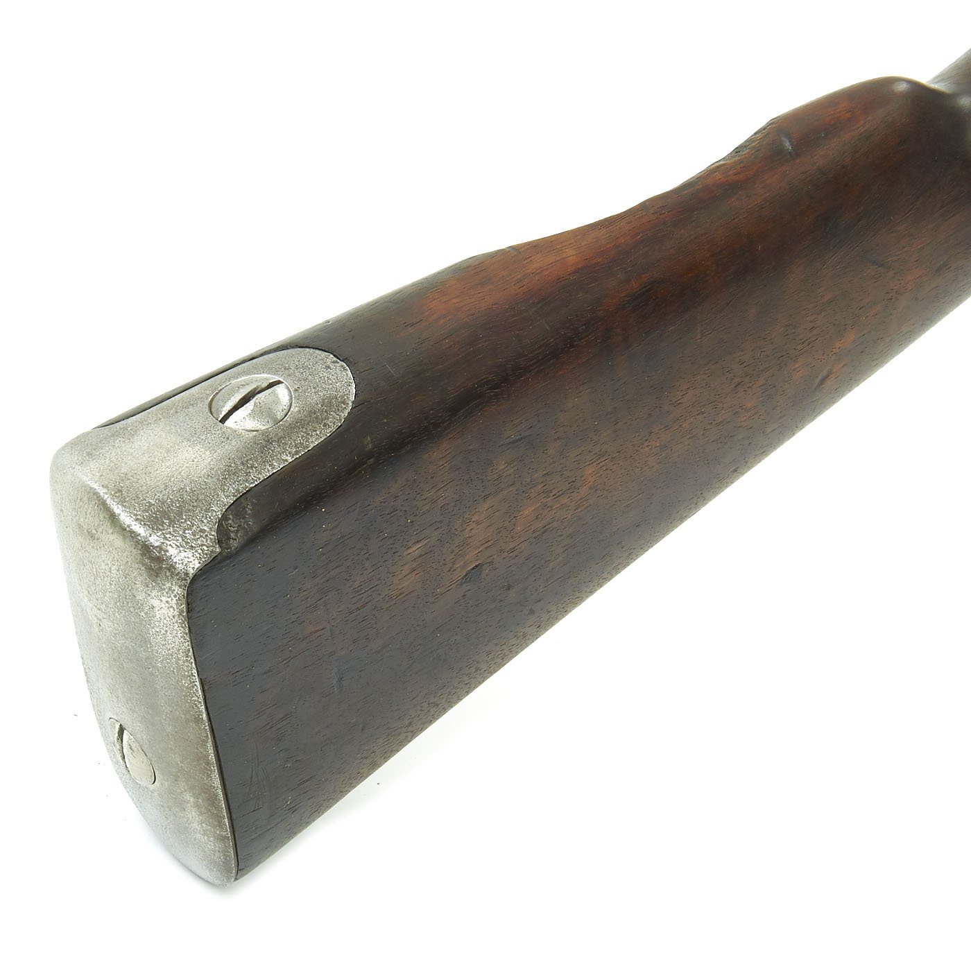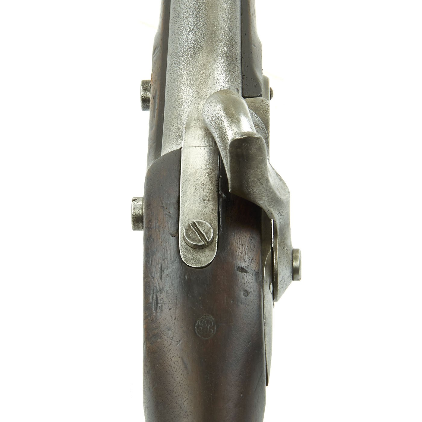 The stock has a nice cartouche on the left side, with an 1852 date, most likely from when it was converted to a rifled percussion musket. There are a few proof marks still visible on the barrel and lock, such as CROWN / IP / 19, and G B in a circle. There are also some other stock cartouches, which we have not been able to identify. Condition is quite nice, with a solid stock, which still retains the cheek cut-out on the left side. The metal work is a nice aged and polished steel, with a dull light gray patina. The bore is clear, and still shows clear rifling, with a lot of reflection, so it is not very oxidized. The lock functions correctly, holding at half cock and firing at full.