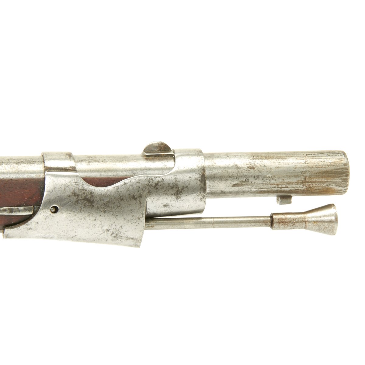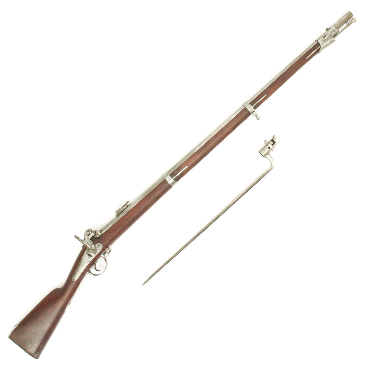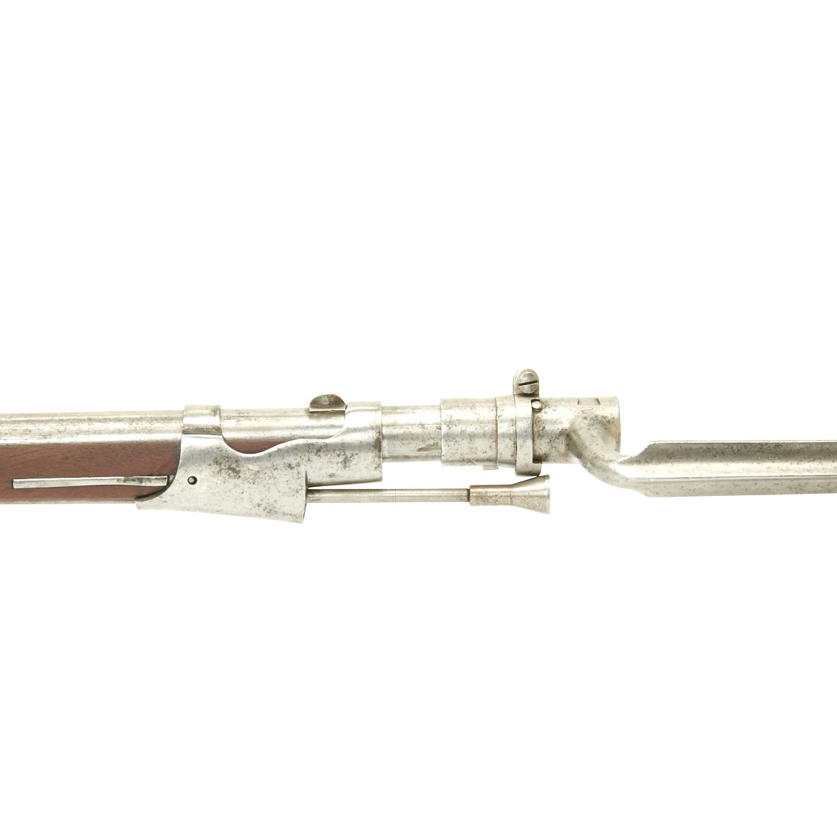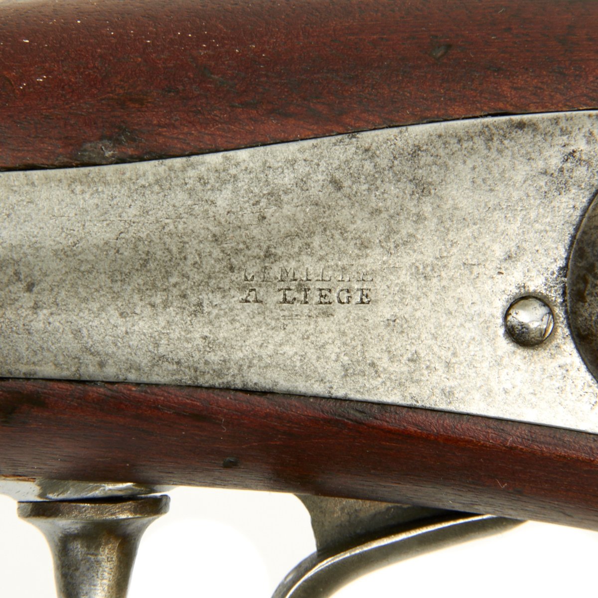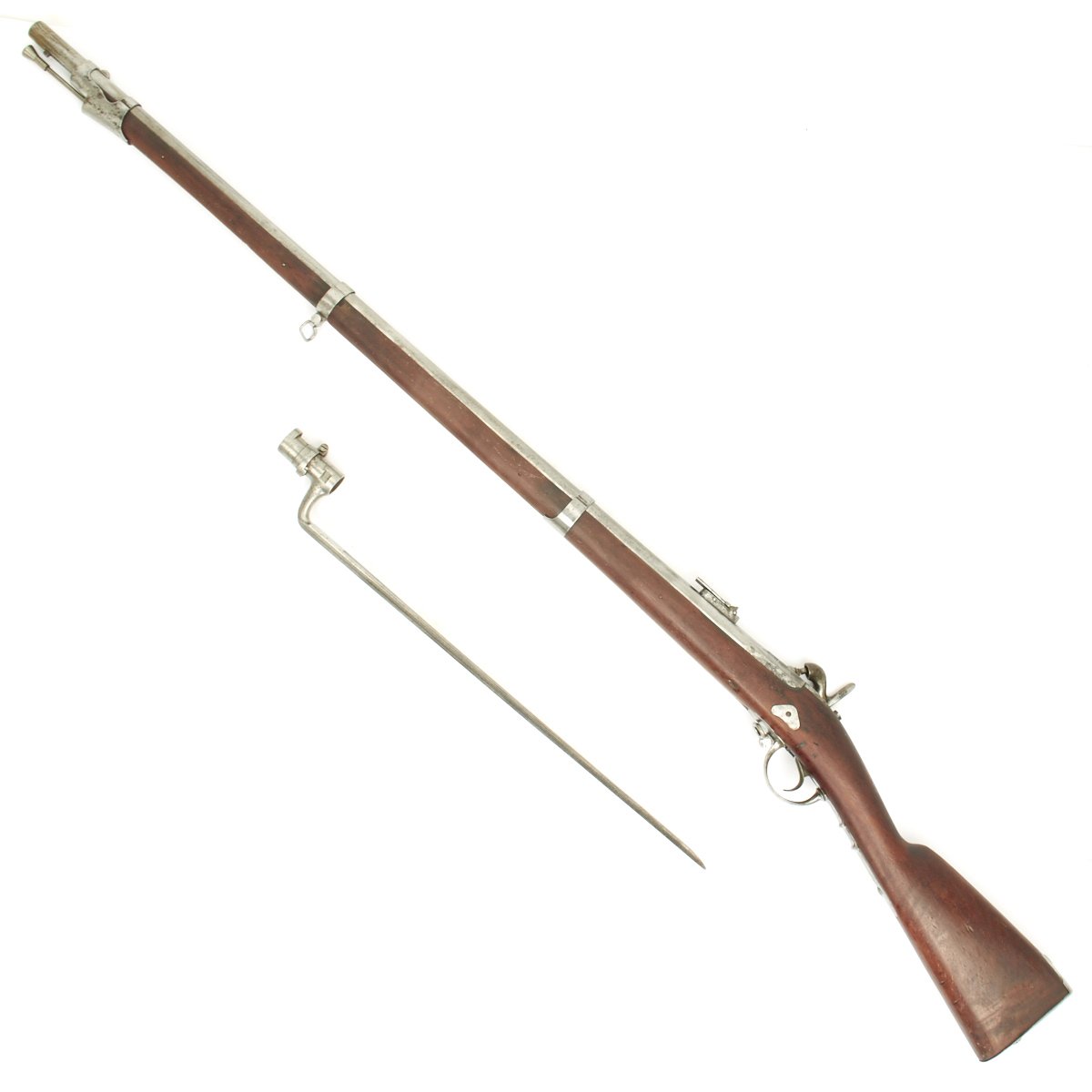 These were usually produced as muskets, but the export trade required rifles, indicating this was made for export to the U.S.. It is fully steel mounted and does bear a maker marking on the lock plate: LEMILLE / A LIEGE. The French usually removed all markings before allowing them to be shipped to a war zone, however some of the Belgian markings survived on the barrel knoxform. There are however no French markings. The barrel is 40" in length and the rifle is 55" overall, an comes complete with a 20 inch bladed socket bayonet.
