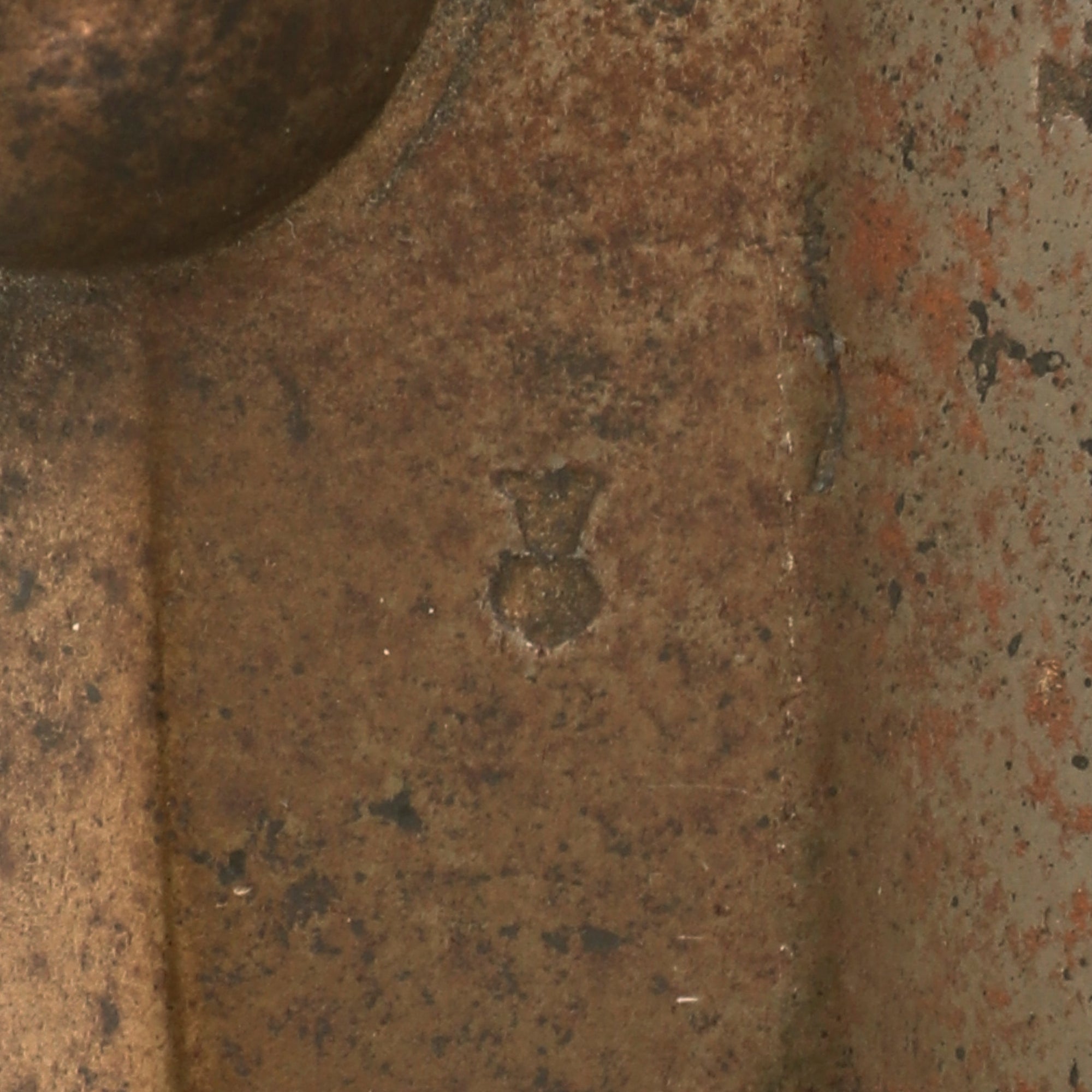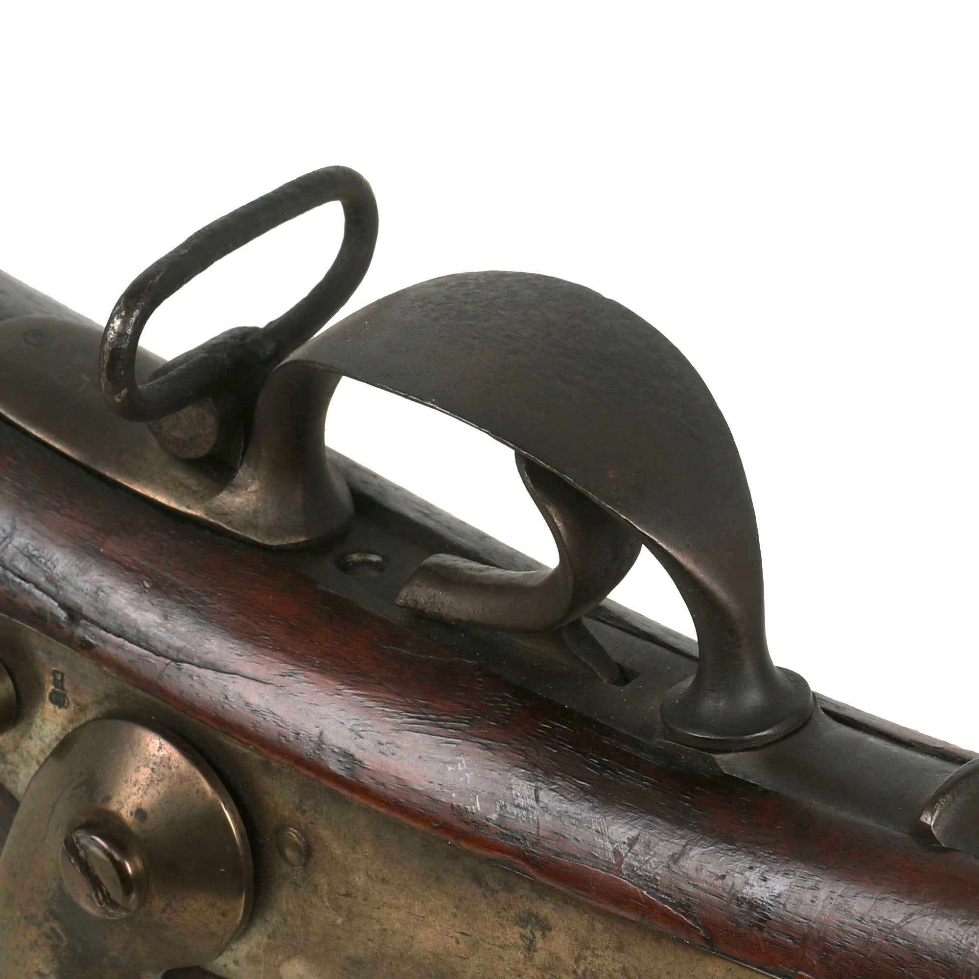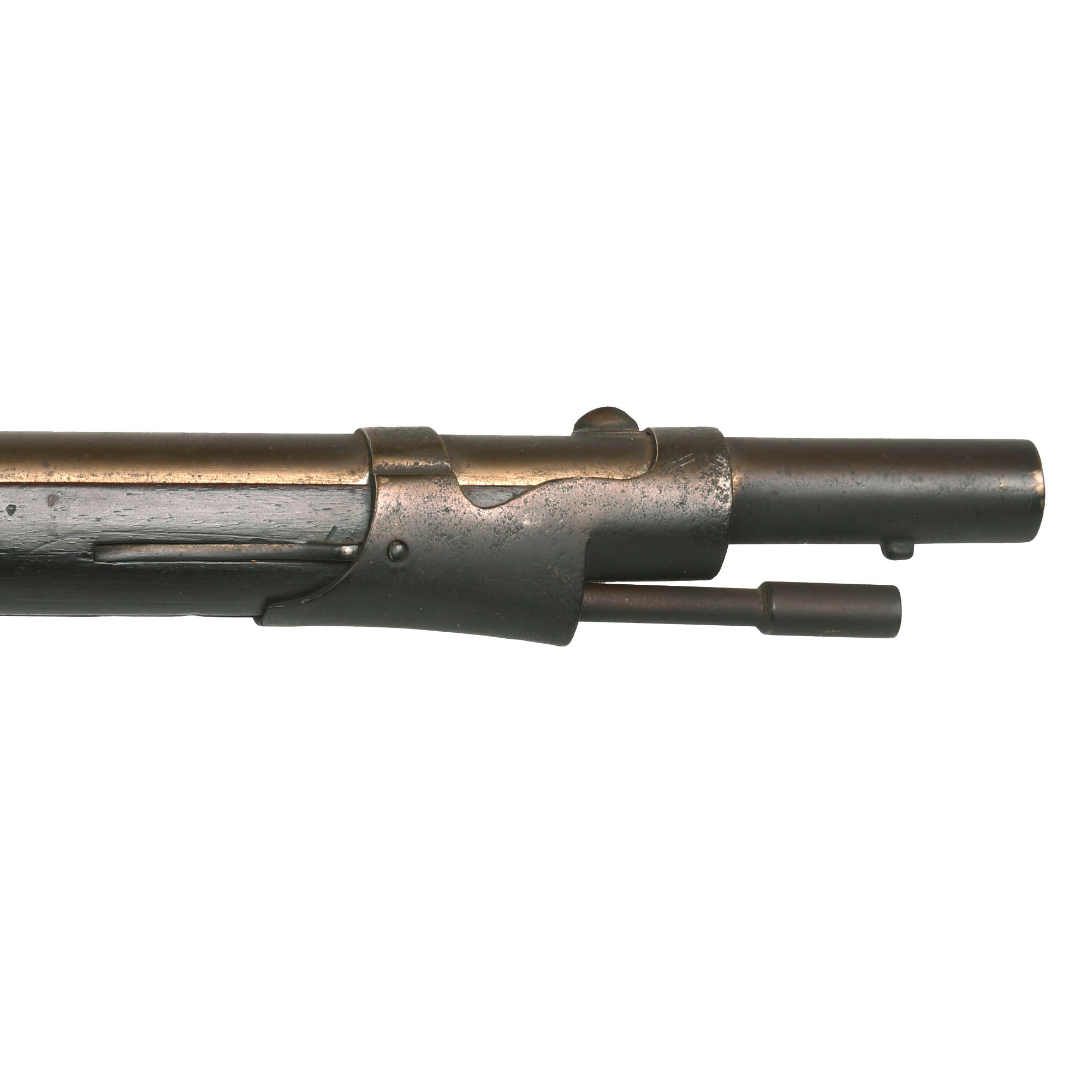 The barrel is 40 1/2" in length and the rifled musket is 56" overall. The rifled musket has all steel mounts including the nose cap also covered in patination, as is the trigger guard, barrel bands, and small side plate. Both swing swivels are retained as well as the original ram rod. There’s also still a mount for the socket bayonet. The cap nipple cone is still intact and the lock functions at both half and full cock, firing at full. We checked the bore, and the four-groove rifling is still visible with great lands and grooves and a mostly bright finish. There is just a bit of fouling and oxidation in the grooves, and the channel through the cap nipple cone is even still open!