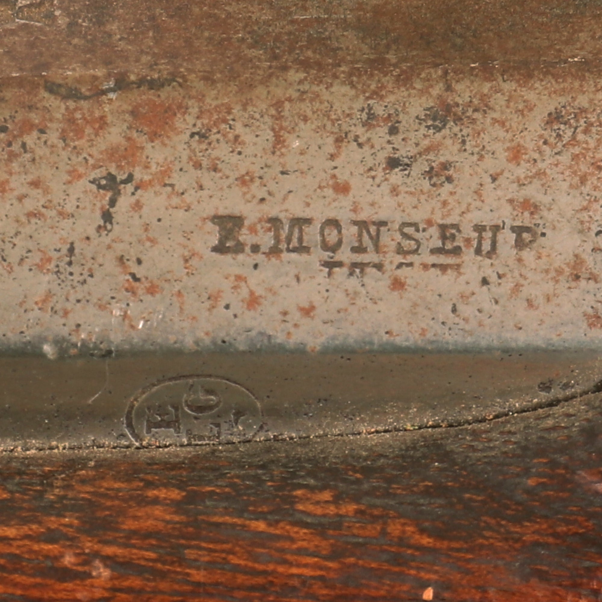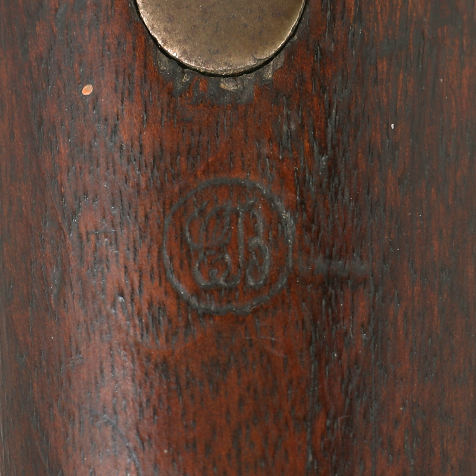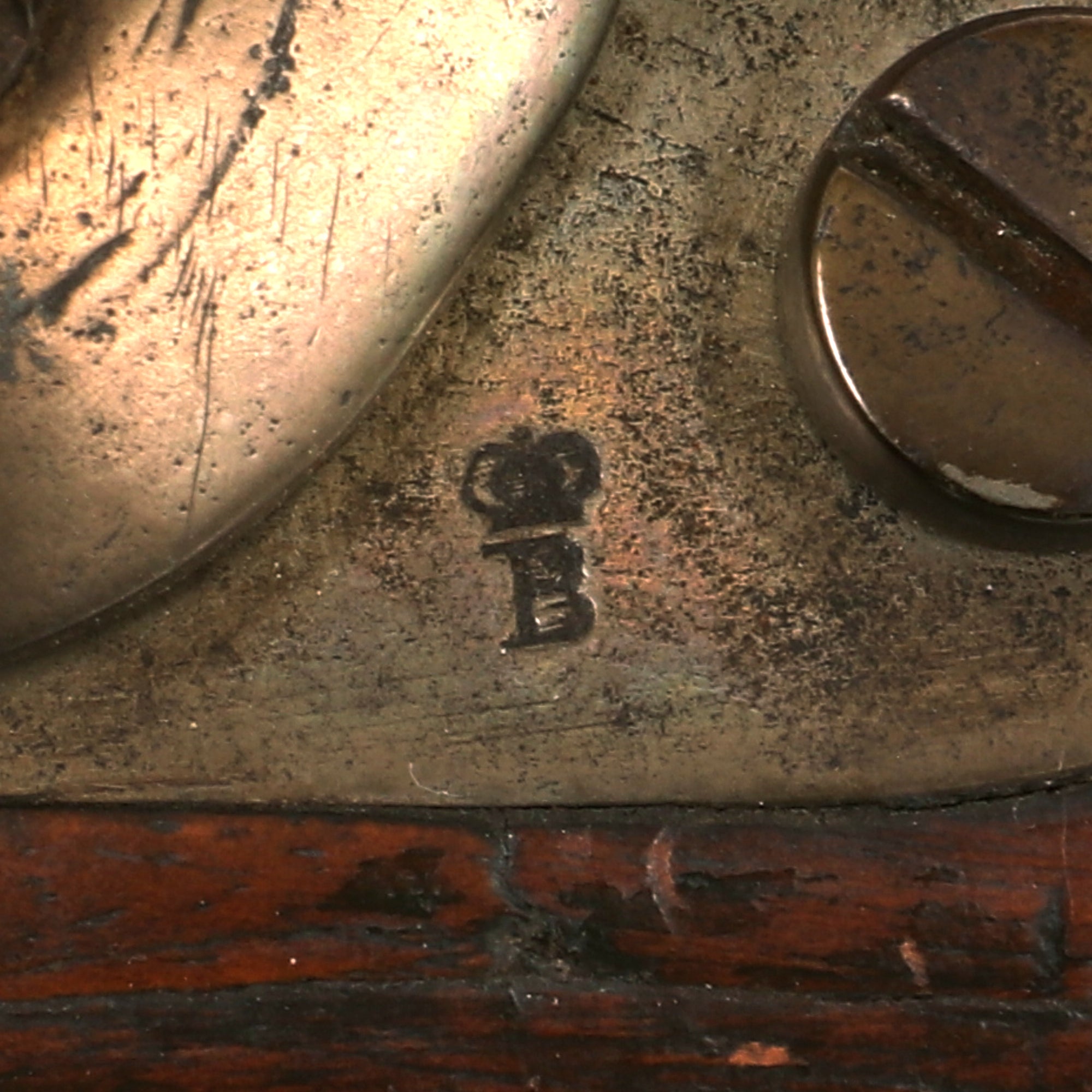 It is fully steel mounted, but bears no visible markings on the lock plate besides the CROWN over B proof mark. This was often done when the musket was rifled, or when it was imported during the American Civil War, as countries did not want to be seen as "taking sides.". It is however marked on the side of the barrel E. MONSEUR / LIÈGE, a Belgian maker known to have supplied the U.S. during the Civil war. Below this is an E / L G / * in an oval on the left hand side, indicating manufacture and inspection in Liège, Belgium. We believe the entire musket was manufactured by this firm, but as the markings are scrubbed from the lock-plate, there is no way for us to be certain. The exact year of manufacture has also been lost.