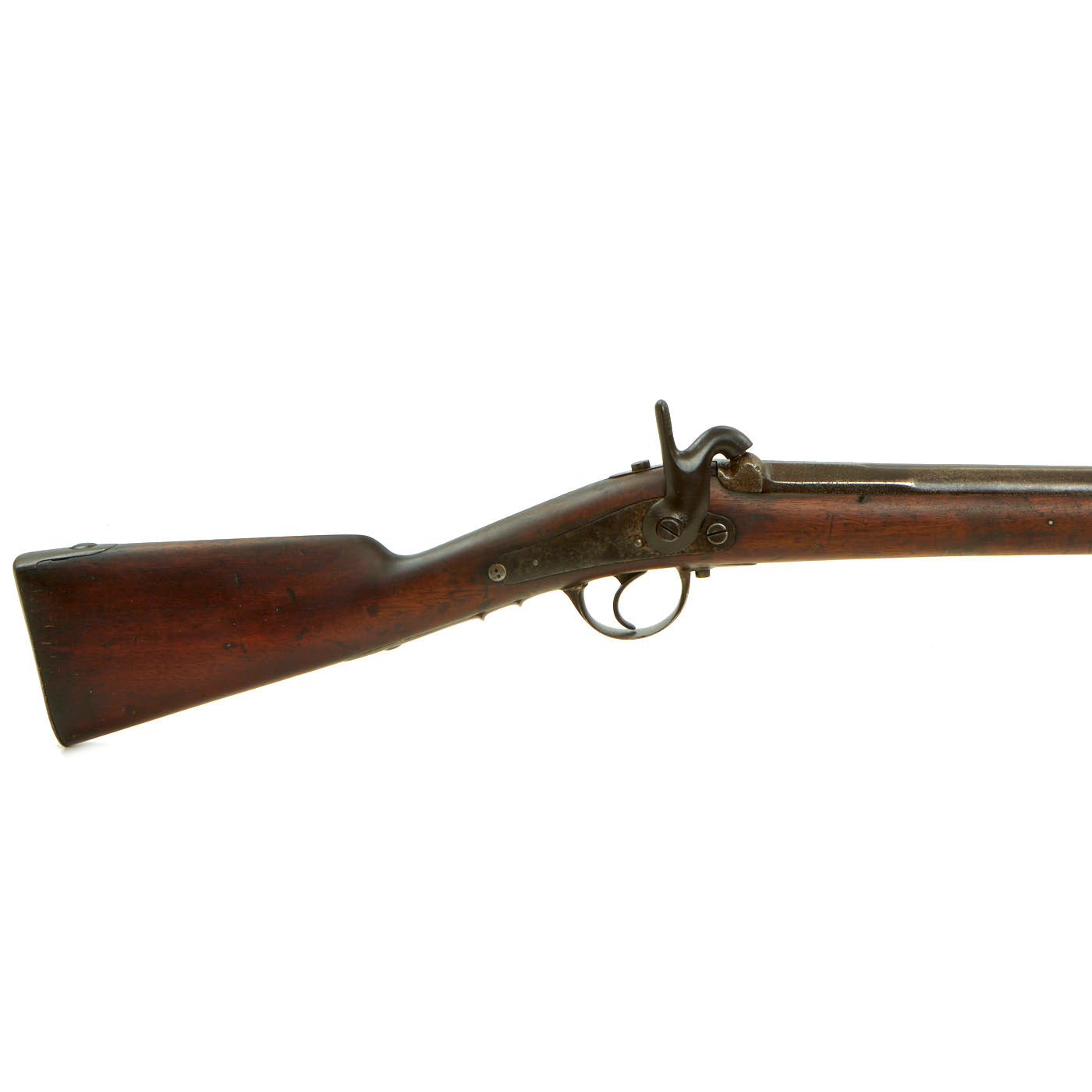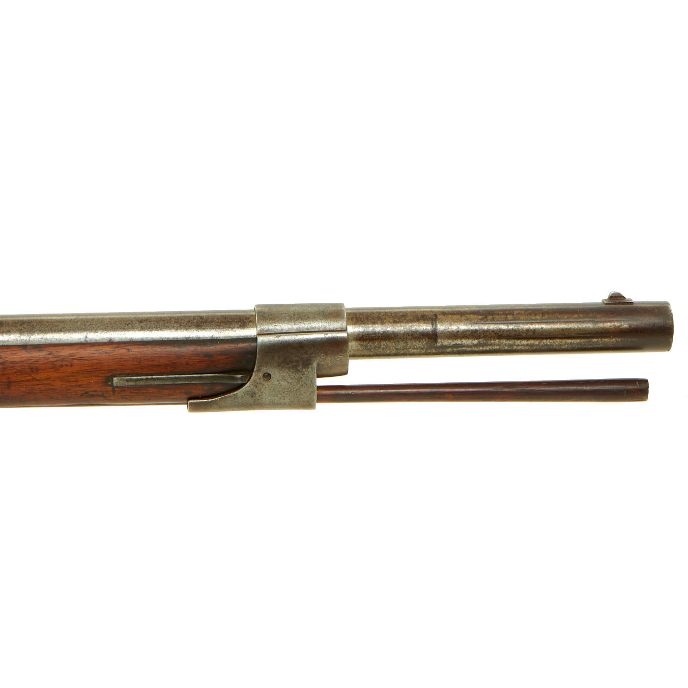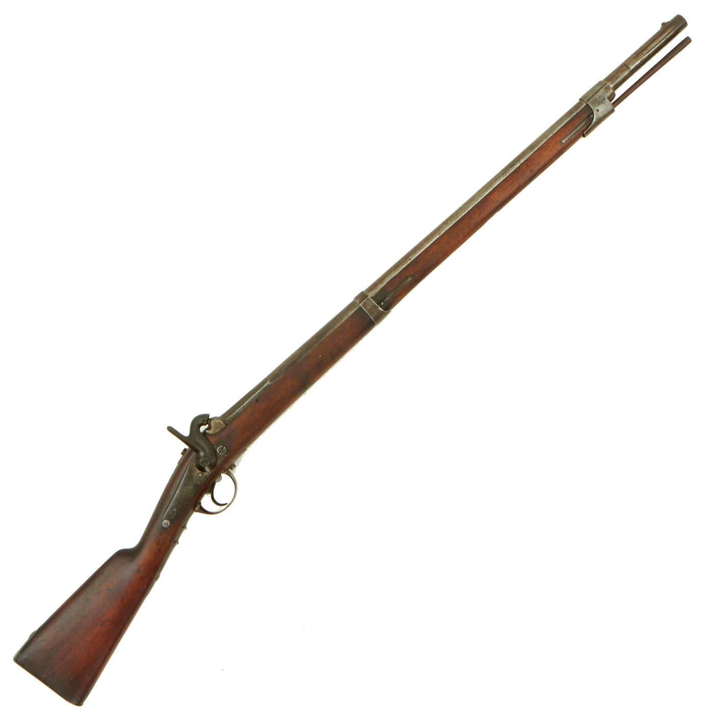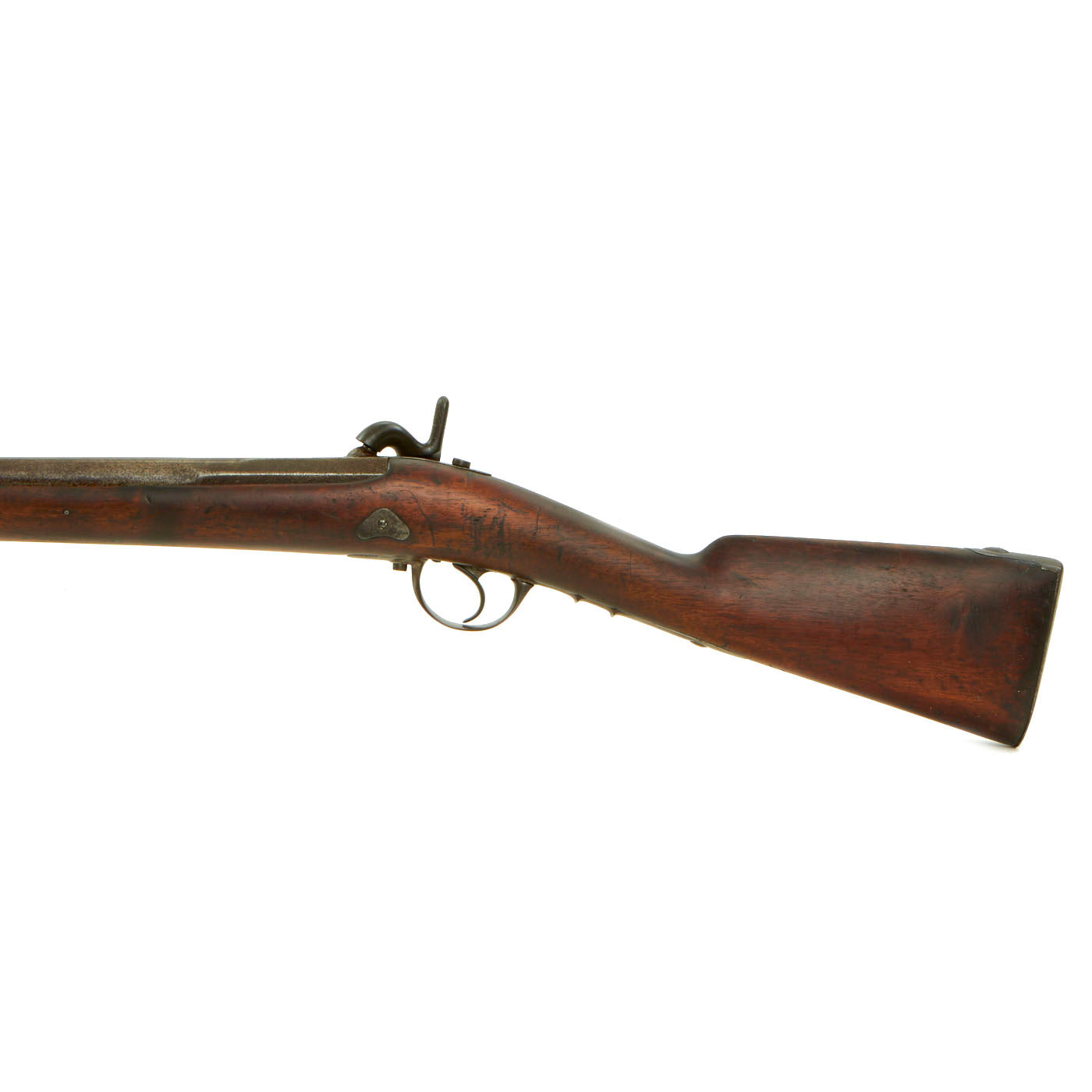 Original Item: Only One Available. This is exactly the type of "Rifled" Musket that the Confederacy imported from Western Europe before and during the Civil War. Here we have a French Model of 1842 Rifled Musket with a back action lock. These were usually produced as smoothbore long muskets, but the export trade required rifles, indicating this was possibly made for export to the U.S. Civil War Market. This example has a lovely "service worn" look to it, with a lot of powder burn around the cap bolster. It also is in a "short musket" configuration, usually used by artillery soldiers for close range firing.