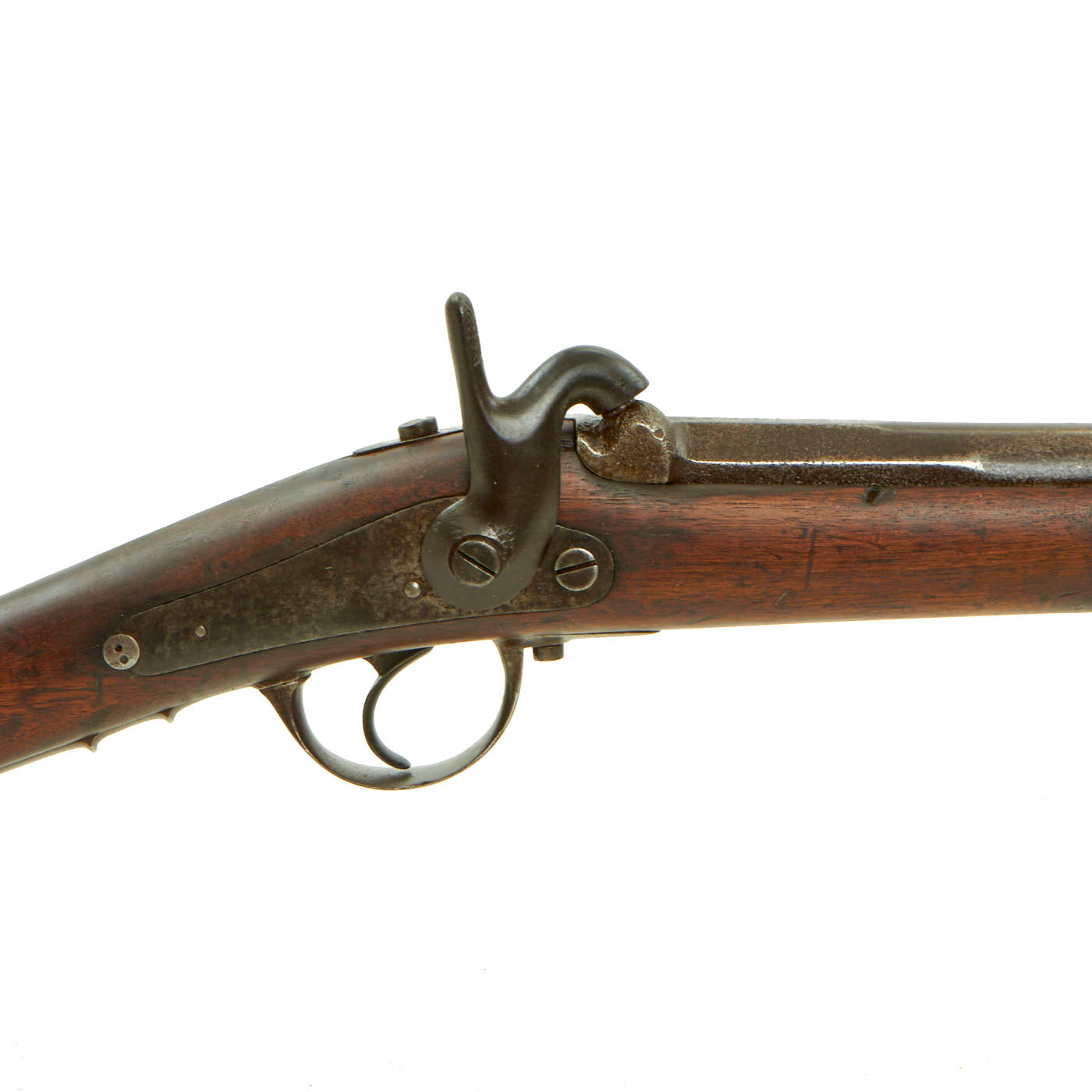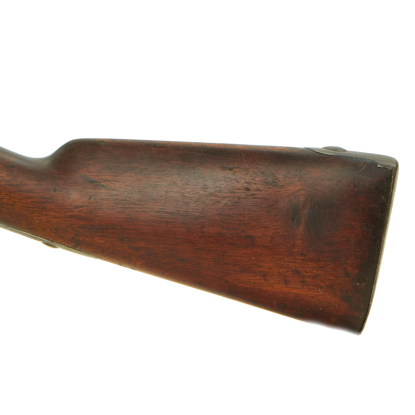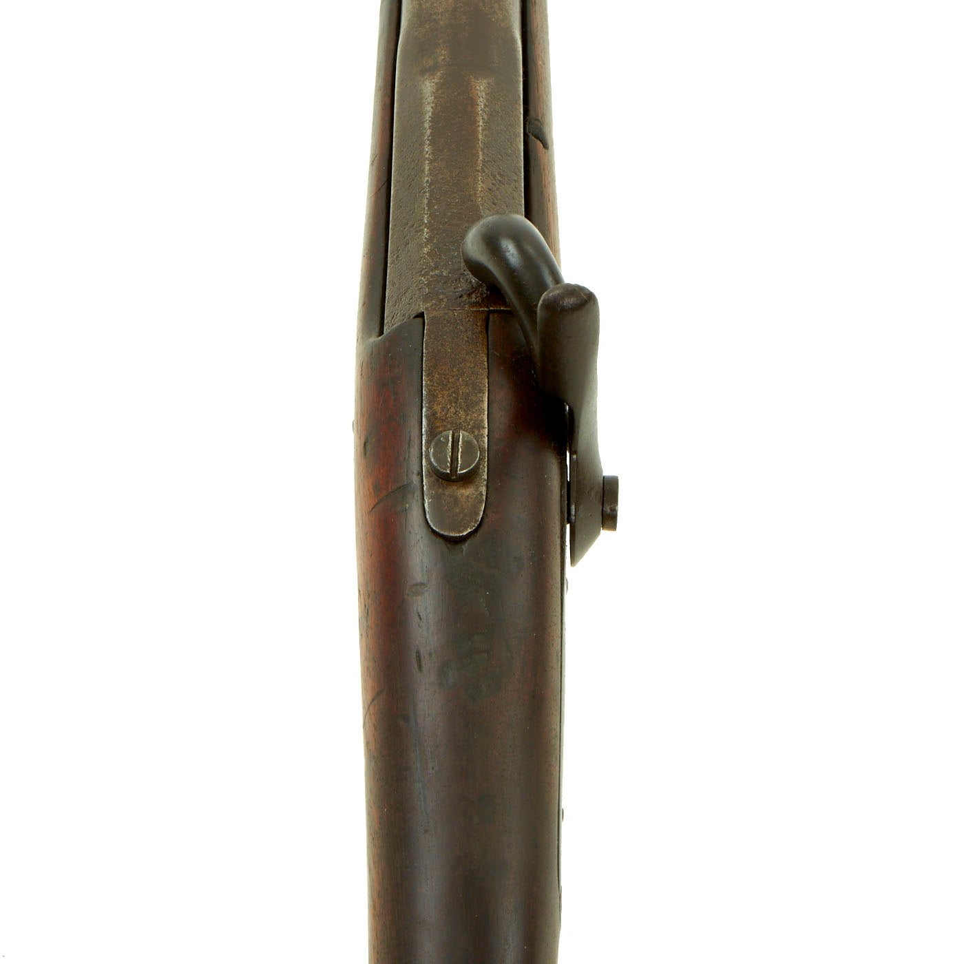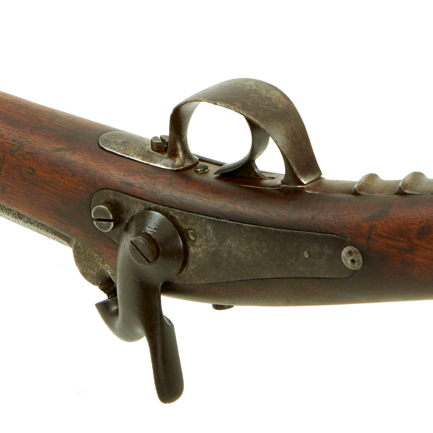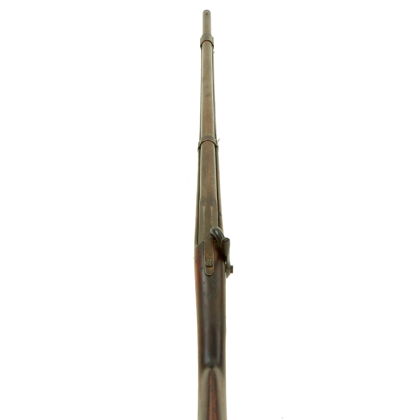 Original Item: Only One Available. This is exactly the type of "Rifled" Musket that the Confederacy imported from Western Europe before and during the Civil War. Here we have a French Model of 1842 Rifled Musket with a back action lock. These were usually produced as smoothbore long muskets, but the export trade required rifles, indicating this was possibly made for export to the U.S. Civil War Market. This example has a lovely "service worn" look to it, with a lot of powder burn around the cap bolster. It also is in a "short musket" configuration, usually used by artillery soldiers for close range firing.