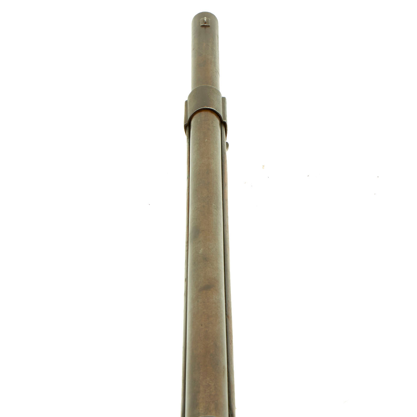 The barrel is 34" in length and the rifled musket is 49 1/2" overall. The musket has lovely patination on the iron mounts including nose cap, trigger guard, barrel bands, and small side plate. The butt plated shows a bit more advanced rusting, but no pitting or scaling. The original cap nipple is present, but broken, and the lock tumbler is worn, and will fire at both half and full cock. We checked the bore, and the four groove rifling is still fully visible, showing light wear. The bore is mostly clean, with fouling and oxidation in the grooves, as expected for a black powder muzzle loader.