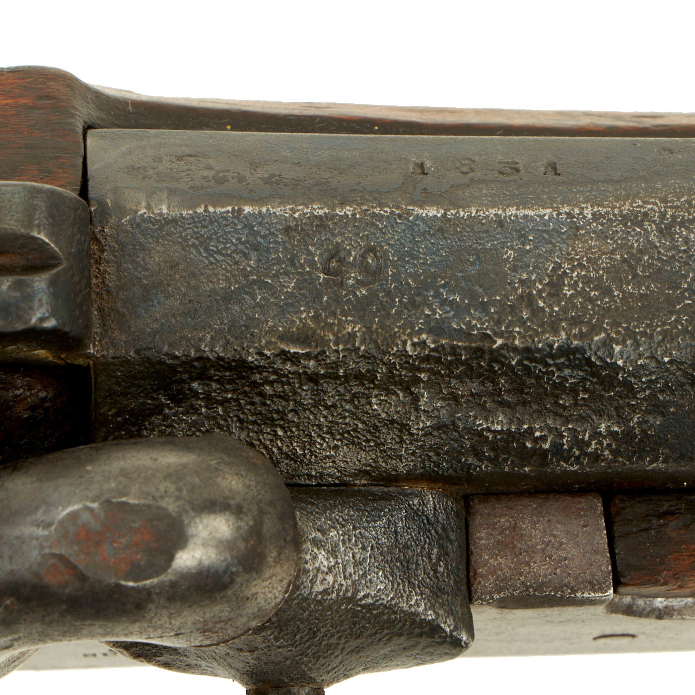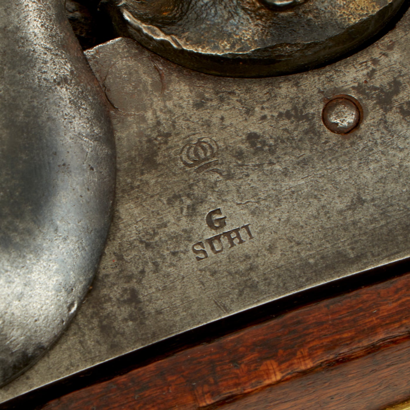 The lockplate surface has a nice patina as well, and exhibits a slightly peppery look from scattered fine rust pitting. Lockplate is a curved tail that terminates into a small teat that differentiates it from the later 1839 model. Markings are standard with none found behind the hammer. Forward of the hammer, the markings are partly clear, with a CROWN, though the letter under it is not legible. It is also marked G / SUHL, for one of the many contractors working in the metalworking town Suhl in Thuringia, Germany. By the late 19th century the city would become a major center of German arms production.