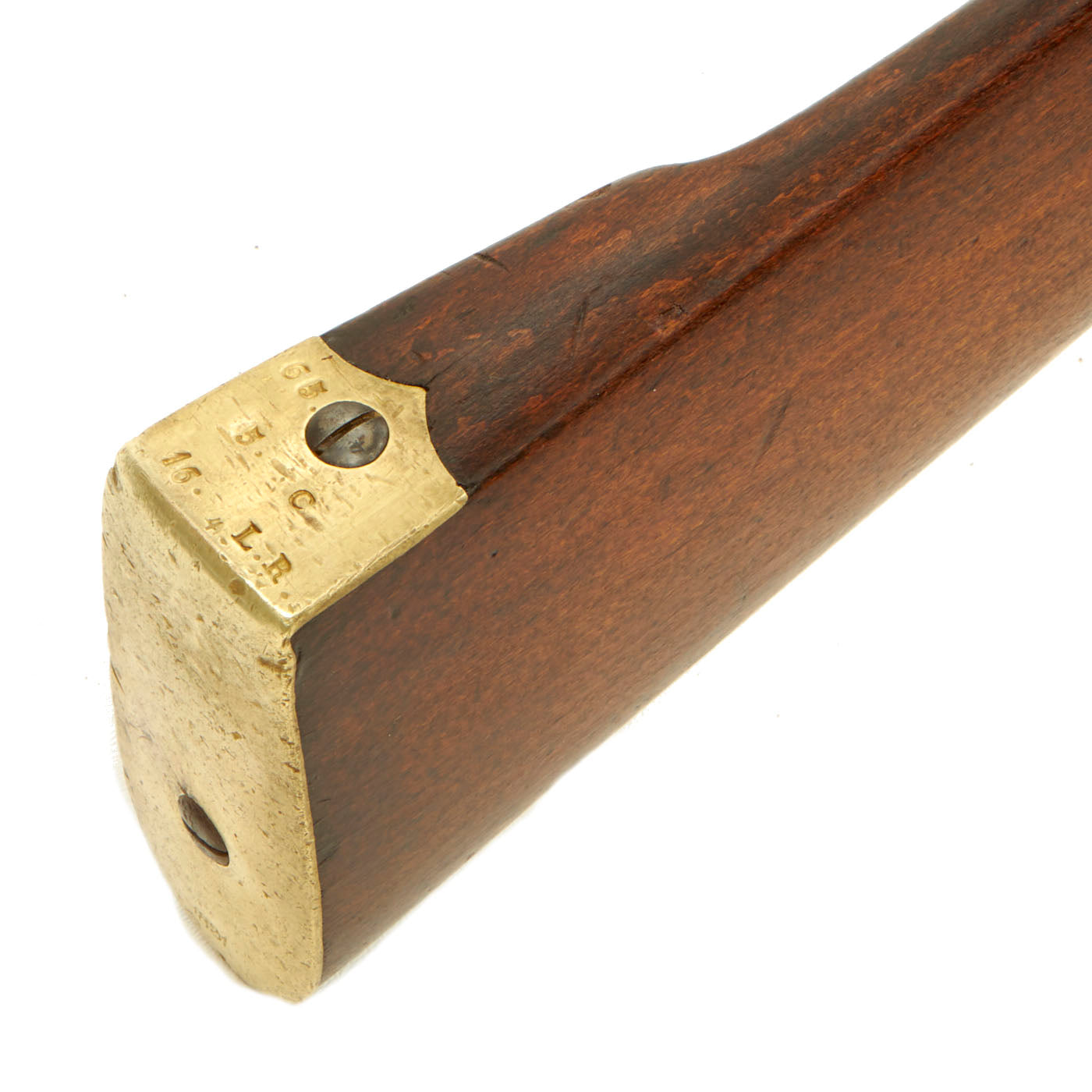 The barrel has a row of markings on the left hand side, including an 1831 date. There is a 65 stamped on top, and 2250 also on the left side, with additional proof marks at the rear, partly covered by the stock wood. Unlike many examples we have seen, this musket is all brass mounted, with a very nice brass butt plate. This still has regimental markings, which read 16. L. R. on the bottom, most likely for the 16th Landwehr Regiment. Above this it is marked 5. C., probably for 5th Company. There is also the number 65, which matches the number stamped onto the top of the barrel nocks form.