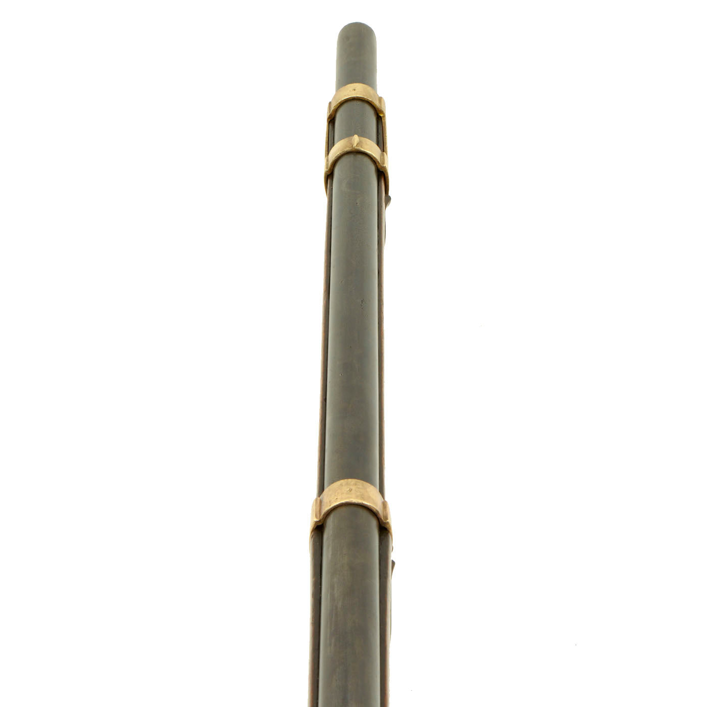 The robust lock still functions correctly, holding at half cock and firing at full. Finials of the trigger guard and the toe of the butt plate terminate in distinct three-pointed ends, correct for this model. The trigger guard and all three barrel bands have matching number 4 stamped on them. Unfortunately both sling swivels were removed at some point. The black walnut stock with its recessed cheek piece is handsome and strong. The wood color is very nice with a great polished patina, with the expected dents and other wear from long service. A fine Prussian "Potsdam" Pattern 1809 smoothbore percussion converted musket made in Suhl, Germany.