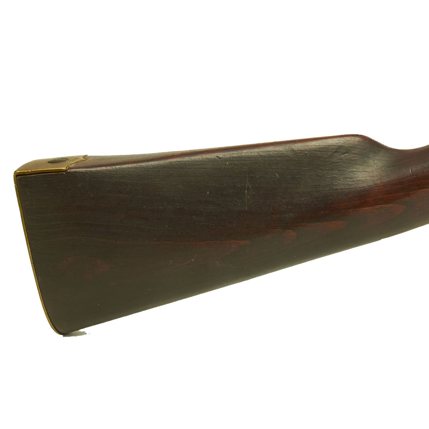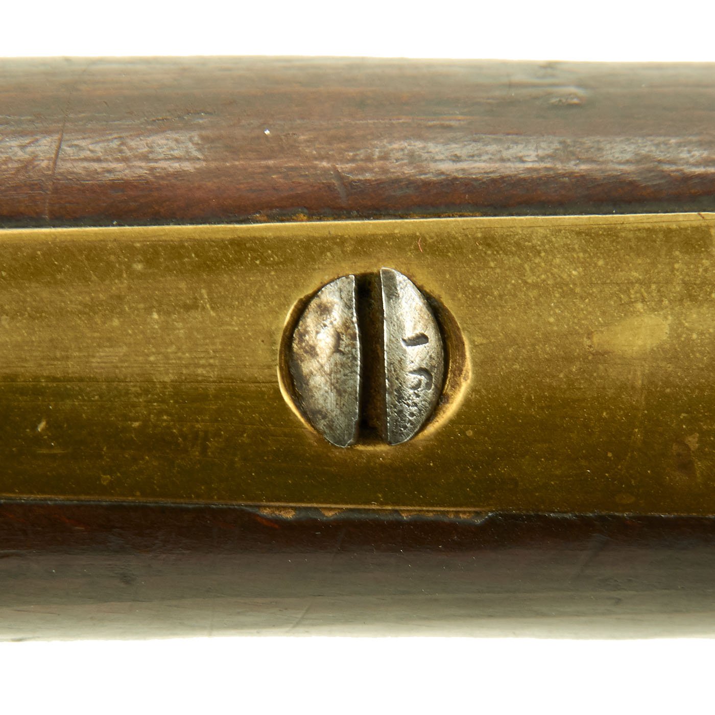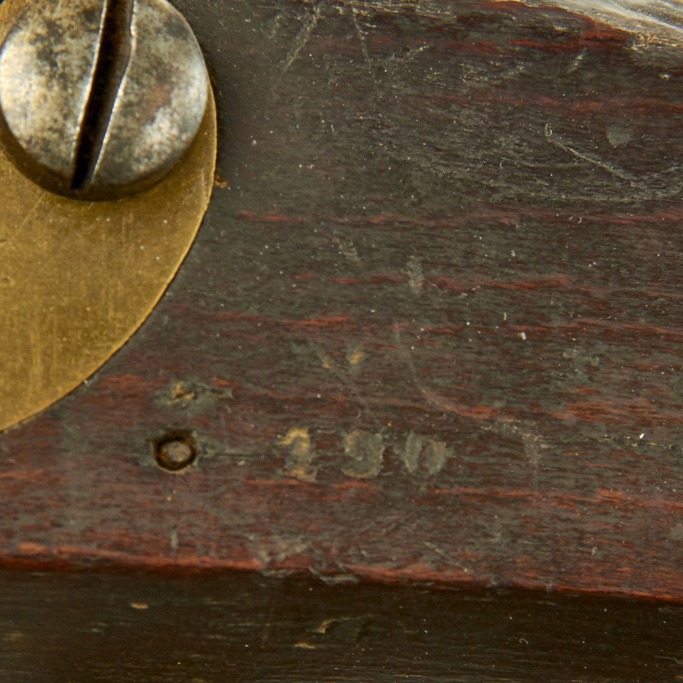 The robust lock still functions correctly, holding at half cock and firing at full, though the hammer screw is a replacement. All the brass fittings wear a mellow bronze patina. Finials of the trigger guard and the toe of the butt plate terminate in distinct three-pointed ends, correct for this model. The trigger guard screw, side plate, and all three barrel bands have matching number 16 stamped on them. Both sling swivels have unfortunately been removed.