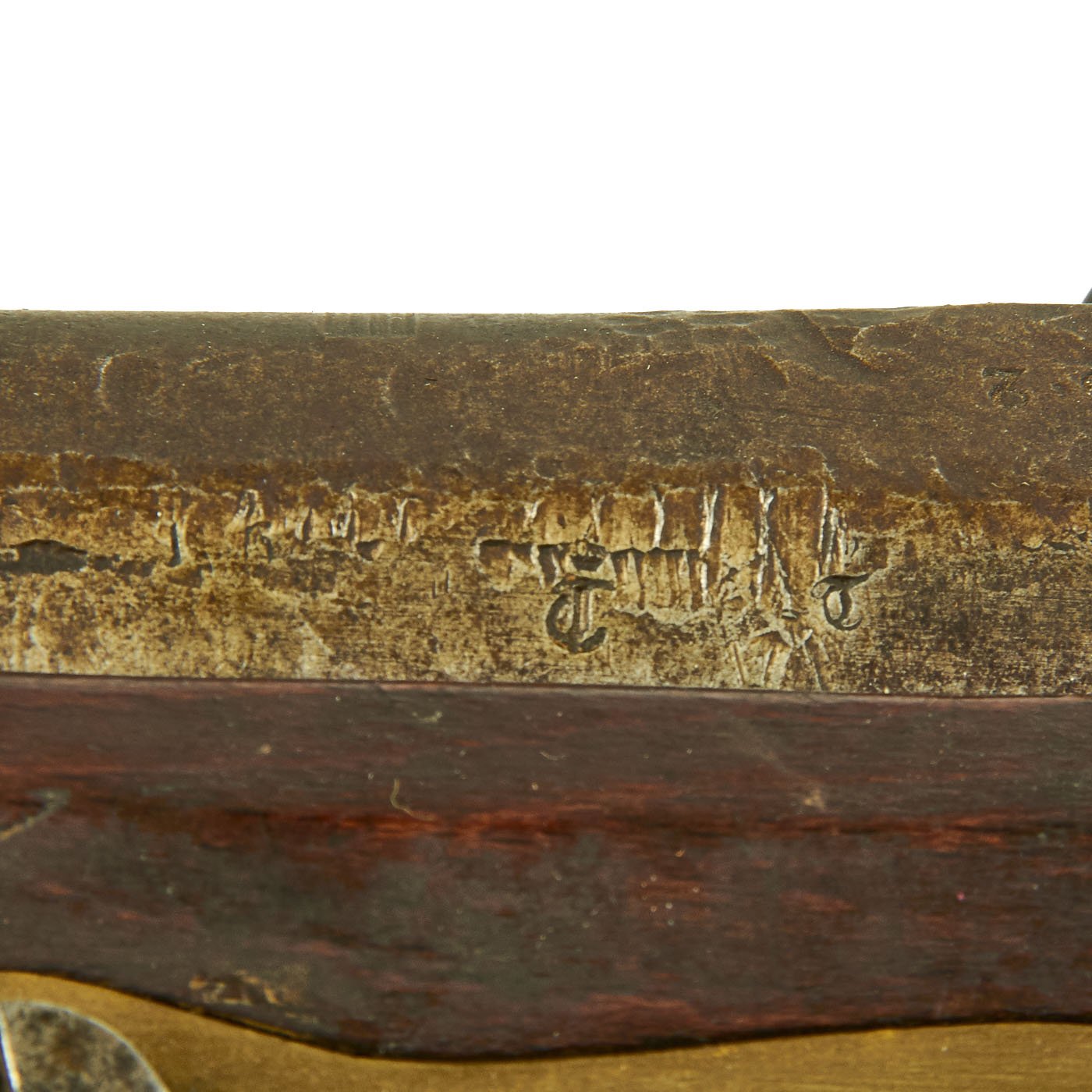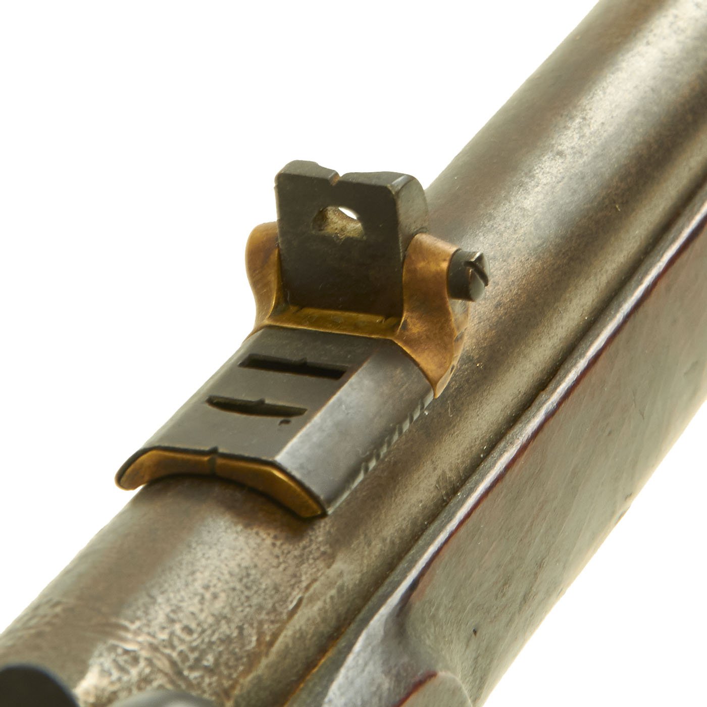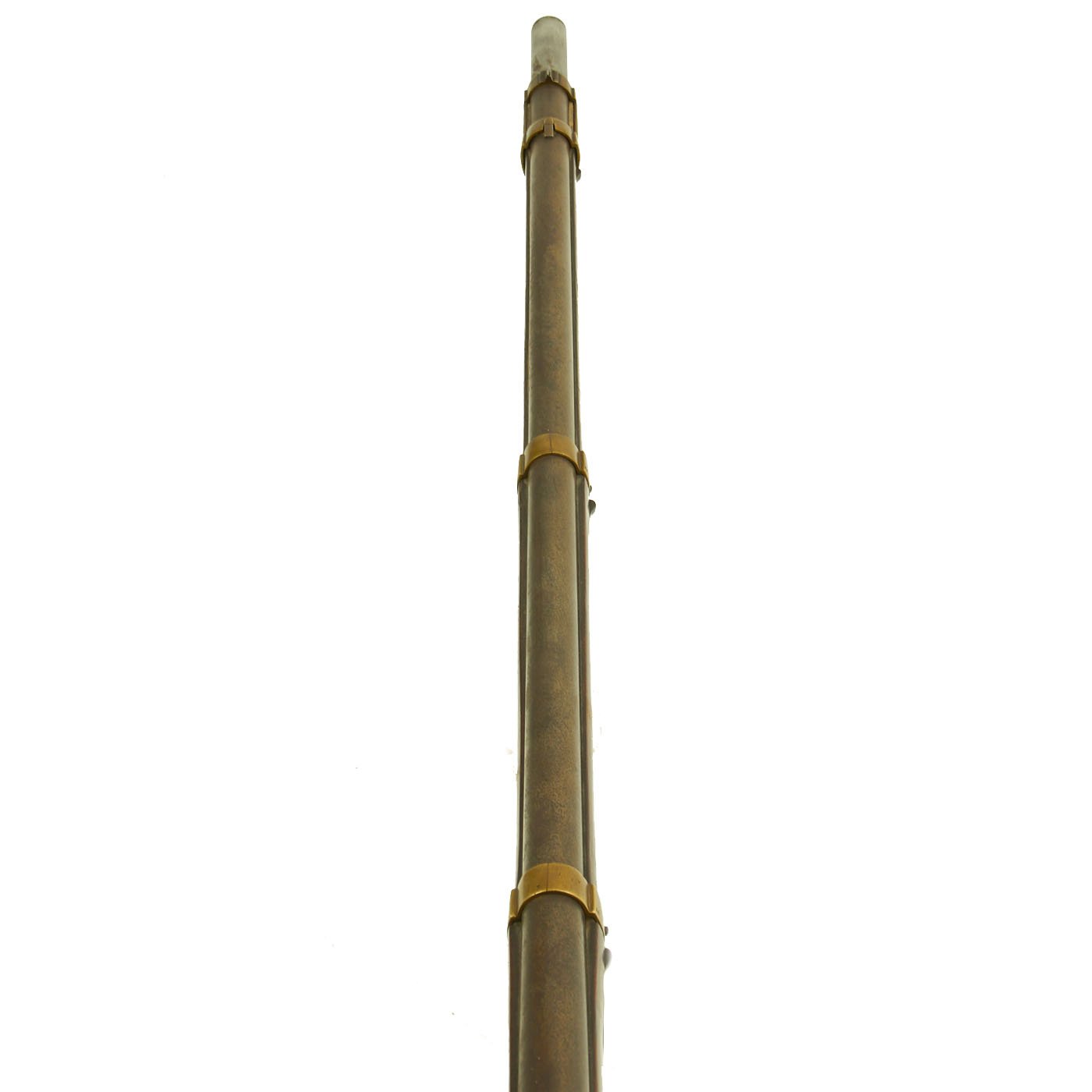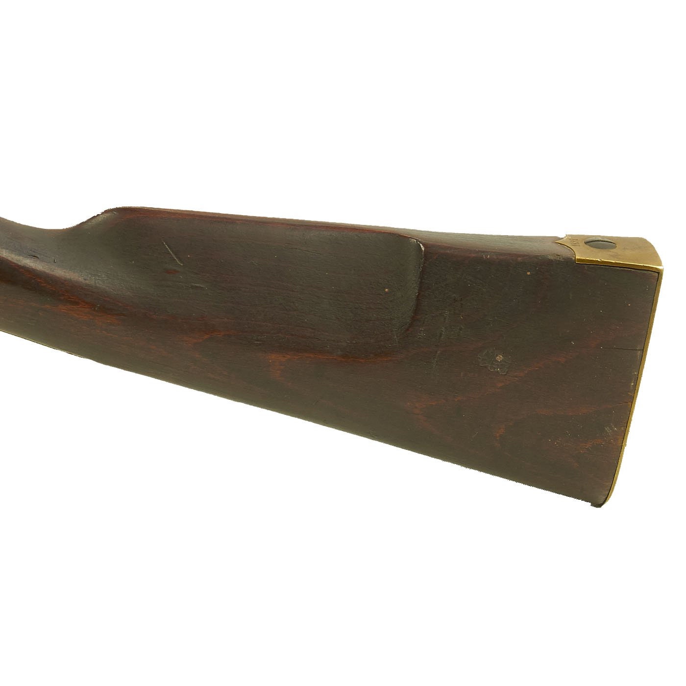 The robust lock still functions correctly, holding at half cock and firing at full, though the hammer screw is a replacement. All the brass fittings wear a mellow bronze patina. Finials of the trigger guard and the toe of the butt plate terminate in distinct three-pointed ends, correct for this model. The trigger guard screw, side plate, and all three barrel bands have matching number 16 stamped on them. Both sling swivels have unfortunately been removed.