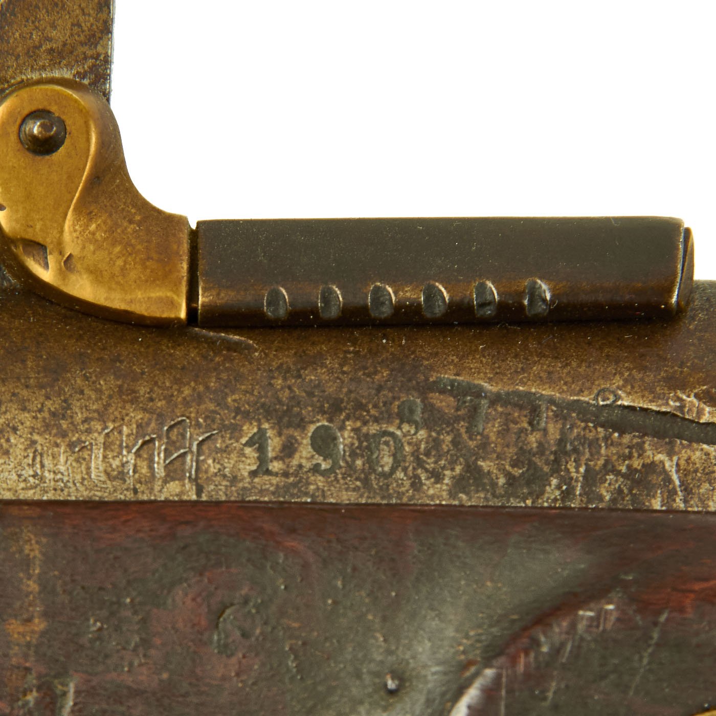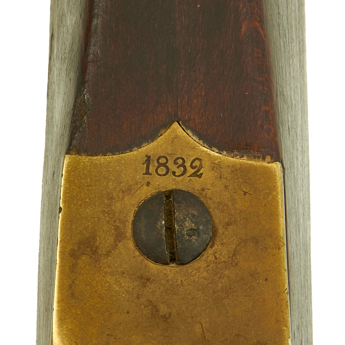 The lockplate surface has a nice patina, and exhibits a slightly peppery look from scattered fine rust pitting. Lockplate is a curved tail that terminates into a small teat that differentiates it from the later 1839 model. Markings are standard with none found behind the hammer. Forward of the hammer, the markings are mostly clear and show a CROWN over a stamped POTSDAM, for manufacture at the Potsdam Arsenal. The barrel nocks form and the butt plate are both dated 1832. There are other markings on the barrel and stock, which are not entirely legible. There is however a 190 stamped into the barrel, sight, and stock, as well as the name L. CUTT.