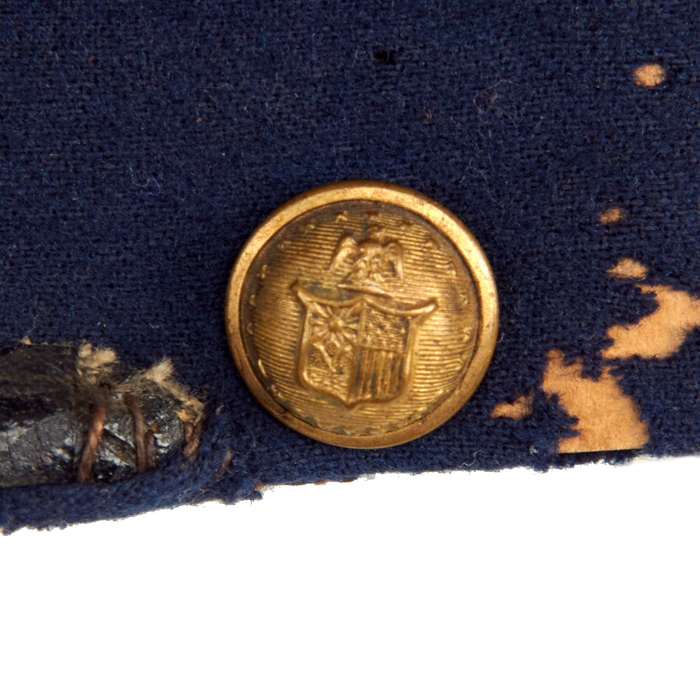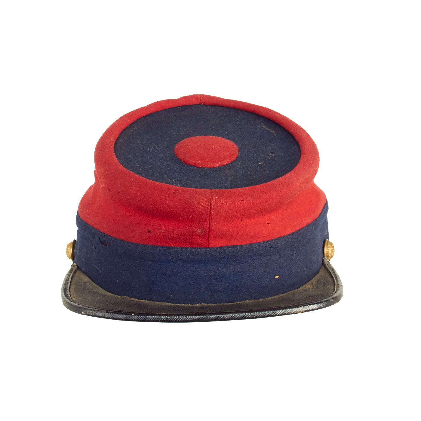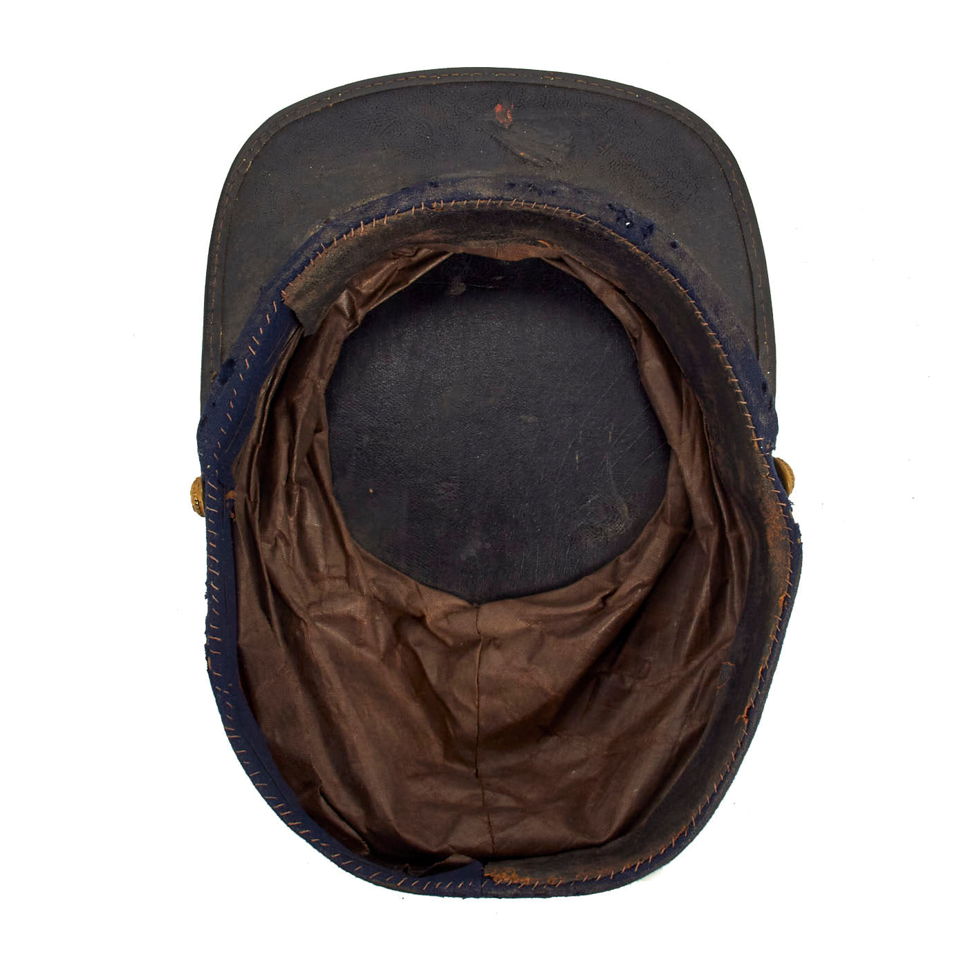 The cap is made of medium blue and red wool, The visor of the cap is of painted lacquered leather, with a reinforcement edging. The Leather chinstrap is unfortunately missing, but the original securing New York State “Excelsior” buttons are still in place. The interior of the cap is lined with brown polished cotton, with a sweatband made of thin Moroccan leather. Despite the fact that approximately ⅓ of the sweatband is missing, the cap displays beautifully. On the crown of the cap is a 1st Corps, 1st Division Corps Badge, which has undoubtedly been on the cap since the war. The cap itself is roughly a size 7 (56cm).